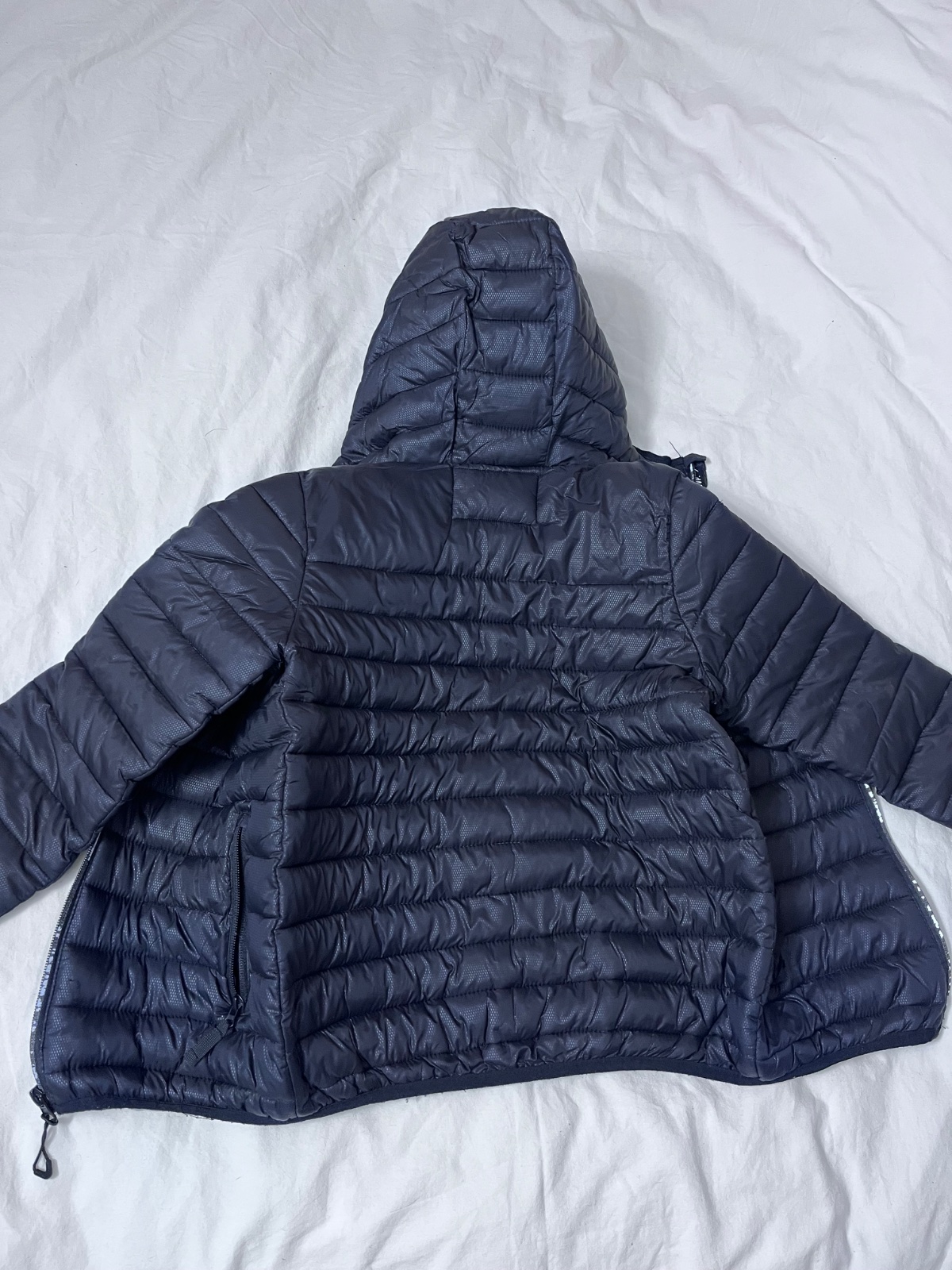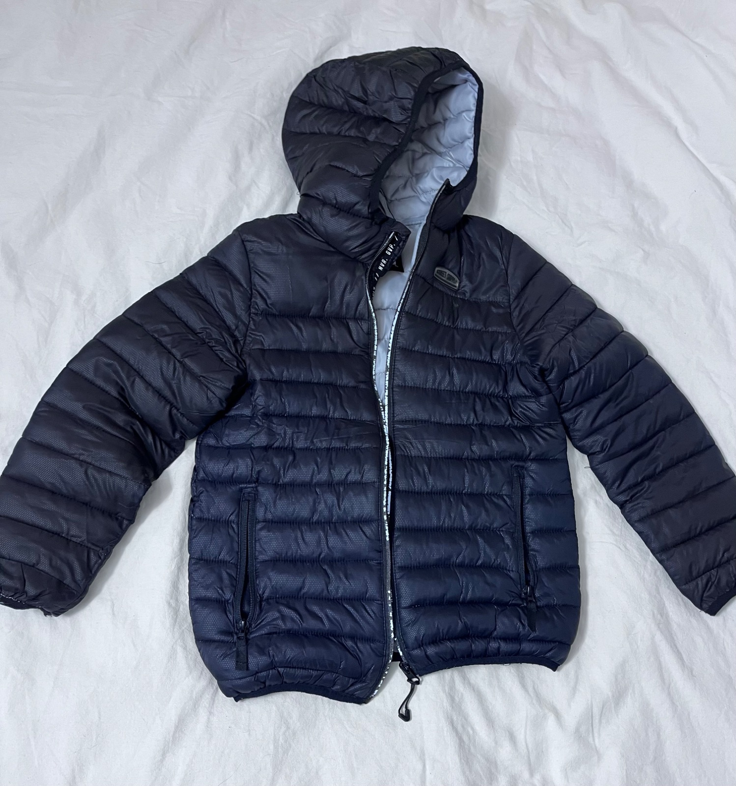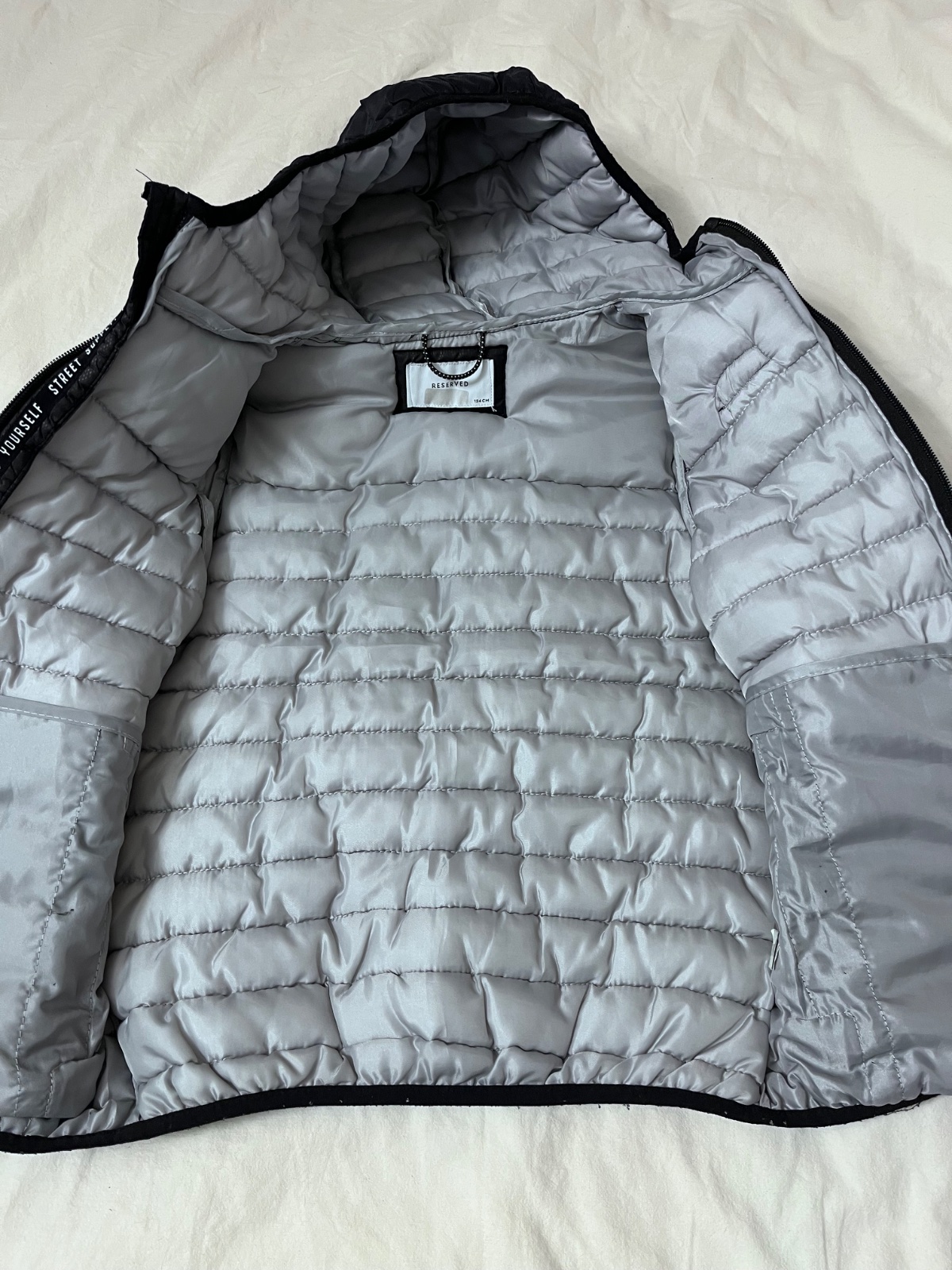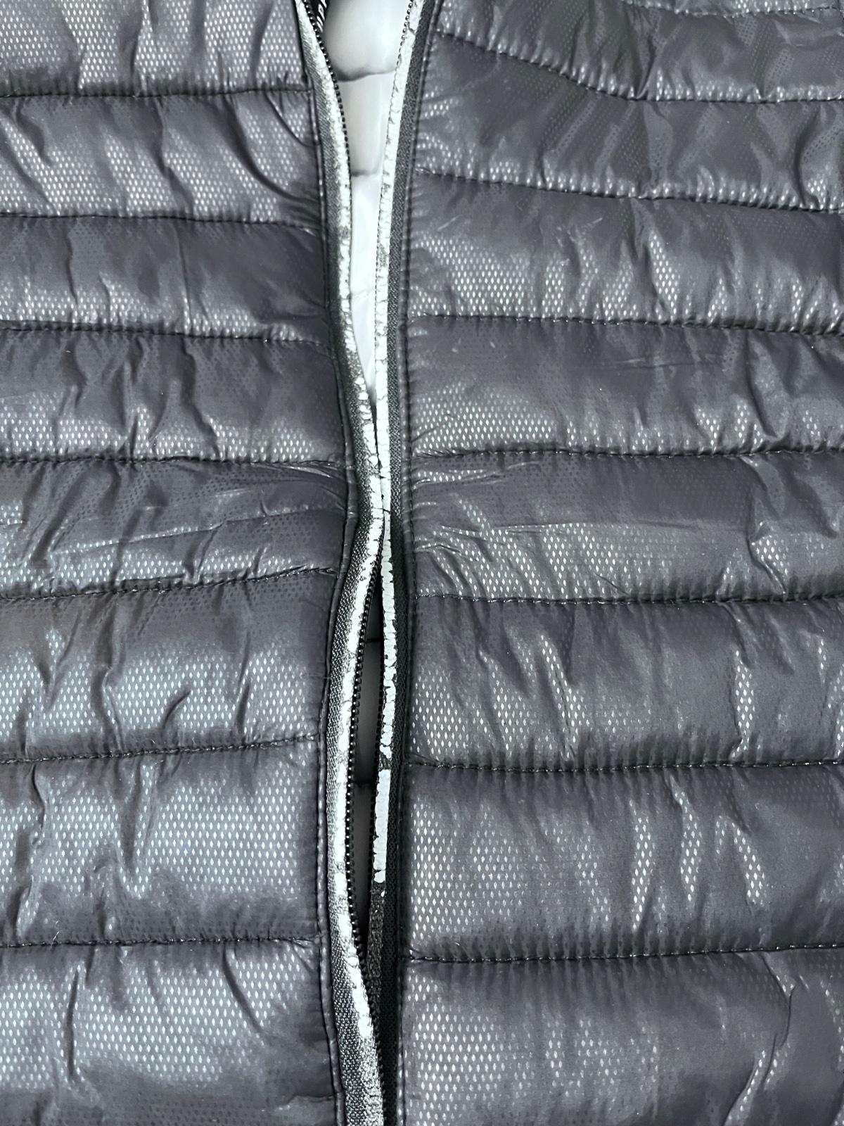 Nosená s miernymi známkami ako ošúchaný reflexný pás pri zipse a šitie pod pazuchou, vcelku pekný stav, stredne hrubá, dl. 52 cm, rukáv od krku 56 cm, spodom 37 cm, kuk všetko, plus pošta