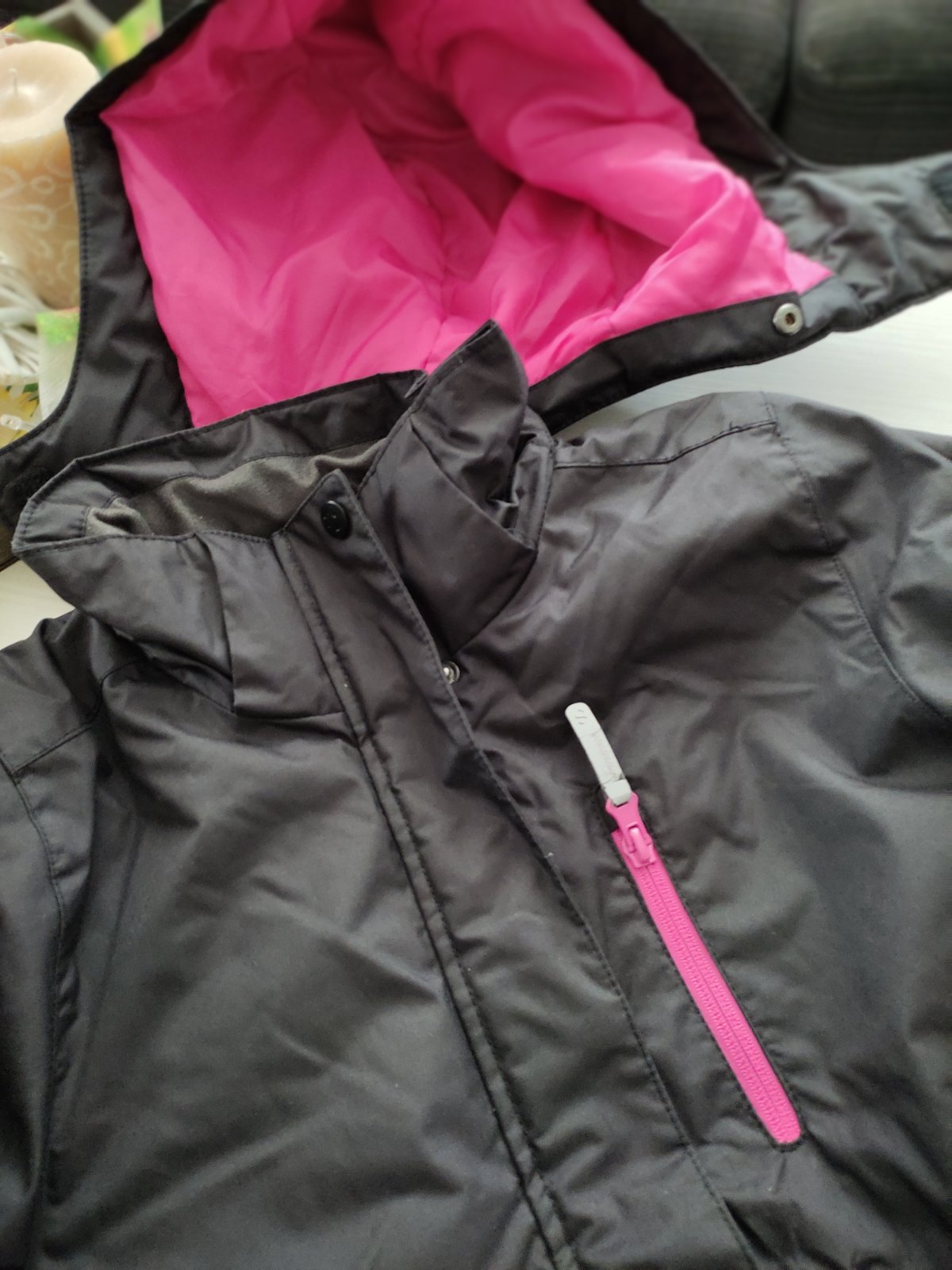 Nosená, tepla, v dobrom stave, bez poškodenia, uvedená veľ. 11-12 rokov, dĺžka 60 cm, šírka pod pazuškami 46 cm, dĺžka rukávu od ramena 55 cm, kapucňa sa dá odopnúť, čierna, fialové vnútro.