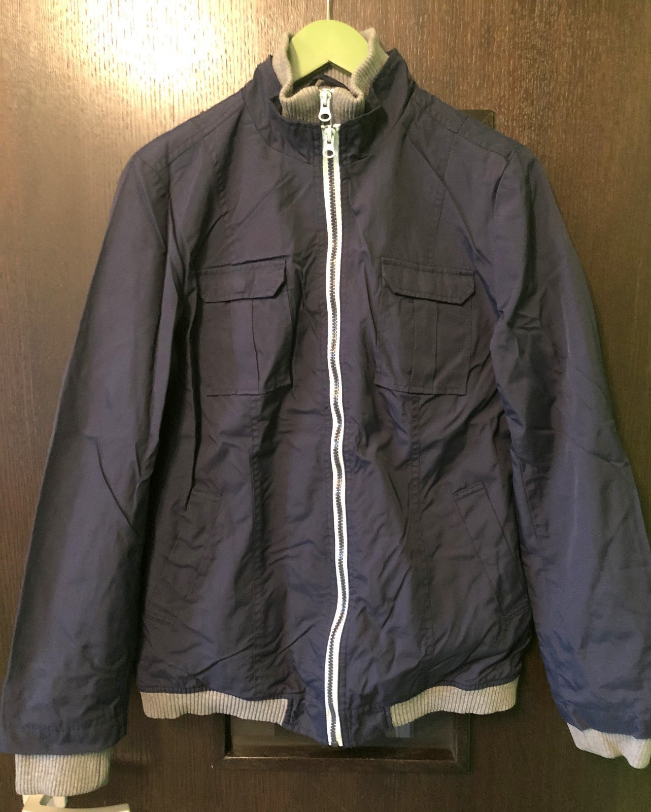 Dámska tmavomodrá veľmi dobrá bunda na prechodné obdobie. Kopíruje postavu, príjemný materiál, zahreje.