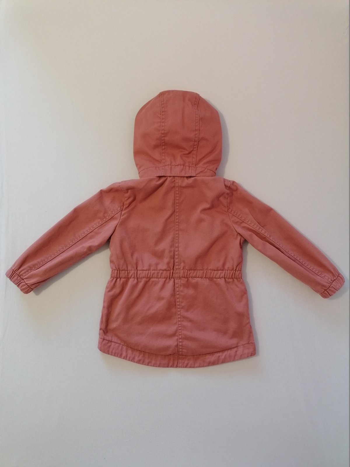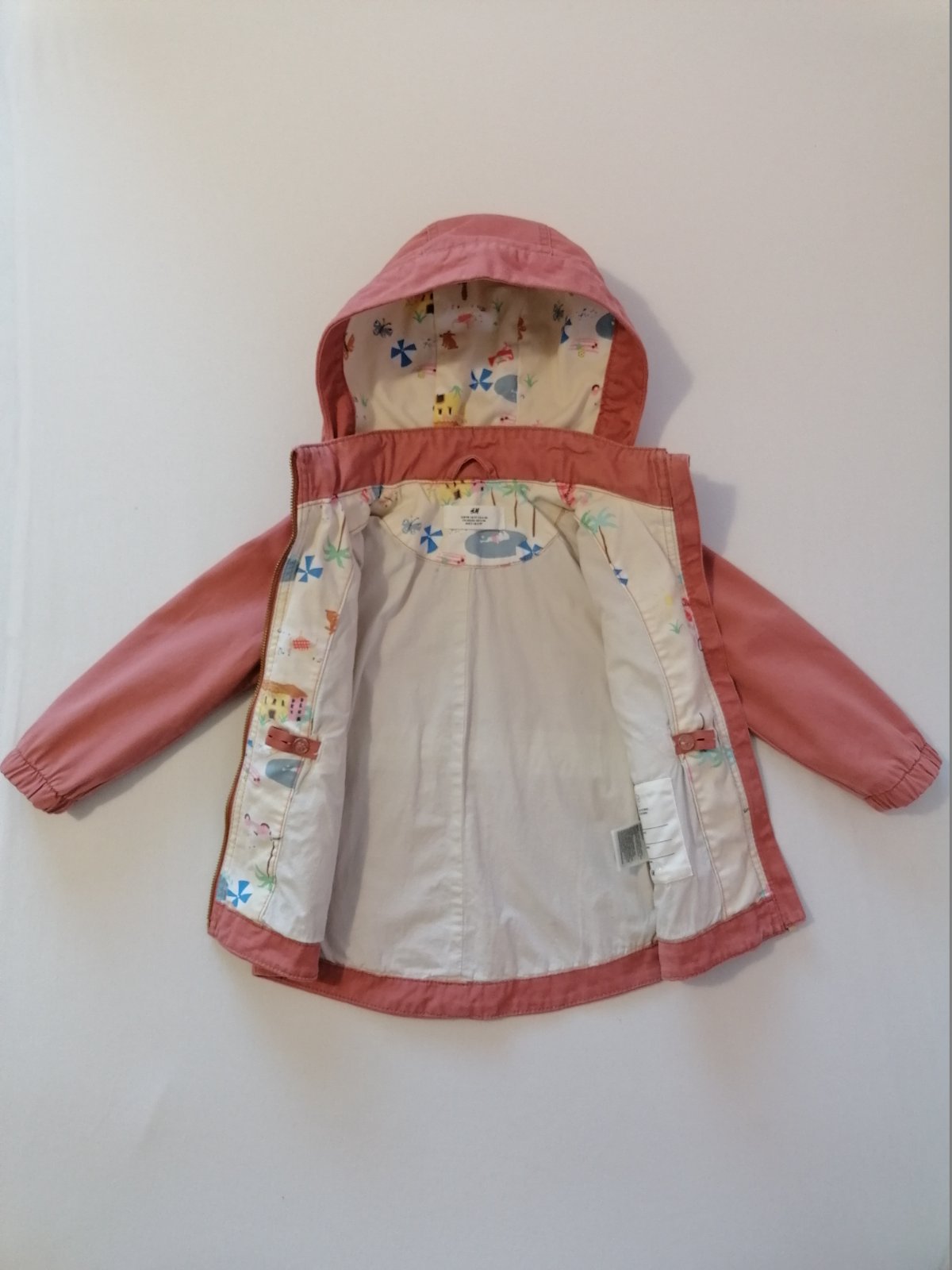 Krasna prechodna bundička, podšita bavlnenou látkou. Kapucna sa da odopnut. V páse je z vnutornej strany všita stahovacia gumicka, takze sa da pás upravit podla potreby.