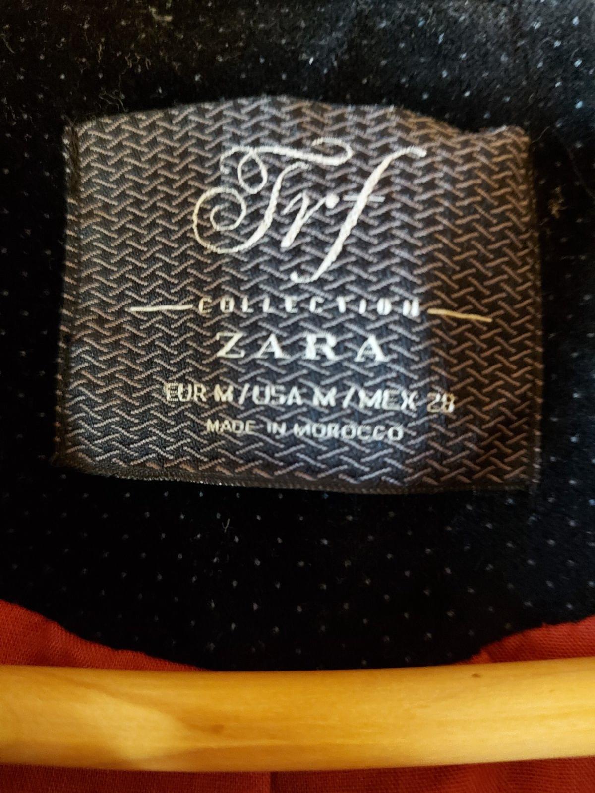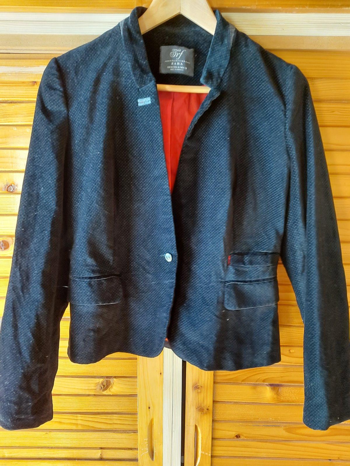 ZARA sako M, na jeden gombík, podšité červenou látkou, š. pod pazuchami 42, d. rukávu 59, d. zadného dielu 53, vzadu malý rozparok, farba je čierna s malinkými bielymi bodkami-viď foto