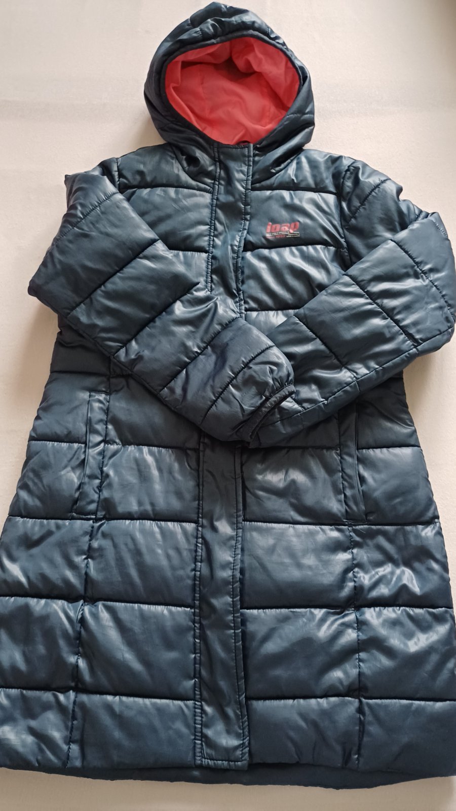Pekný nosený stav, nie veľmi hrubá, podšitá flísom. Zipsy fungujú. Celková dĺžka 67,5 cm. Šírka pod pazuškami 40 cm. Dĺžka rukáva od krku 59 cm, od pleca 49 cm. Má pútko na opasok, ale opasok nemá...