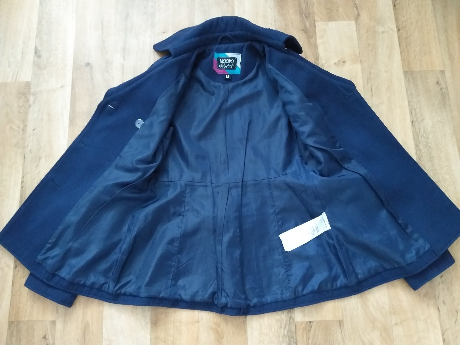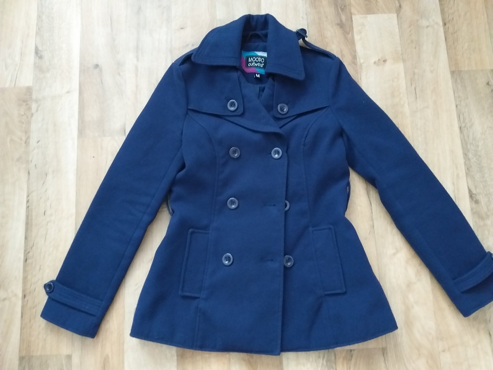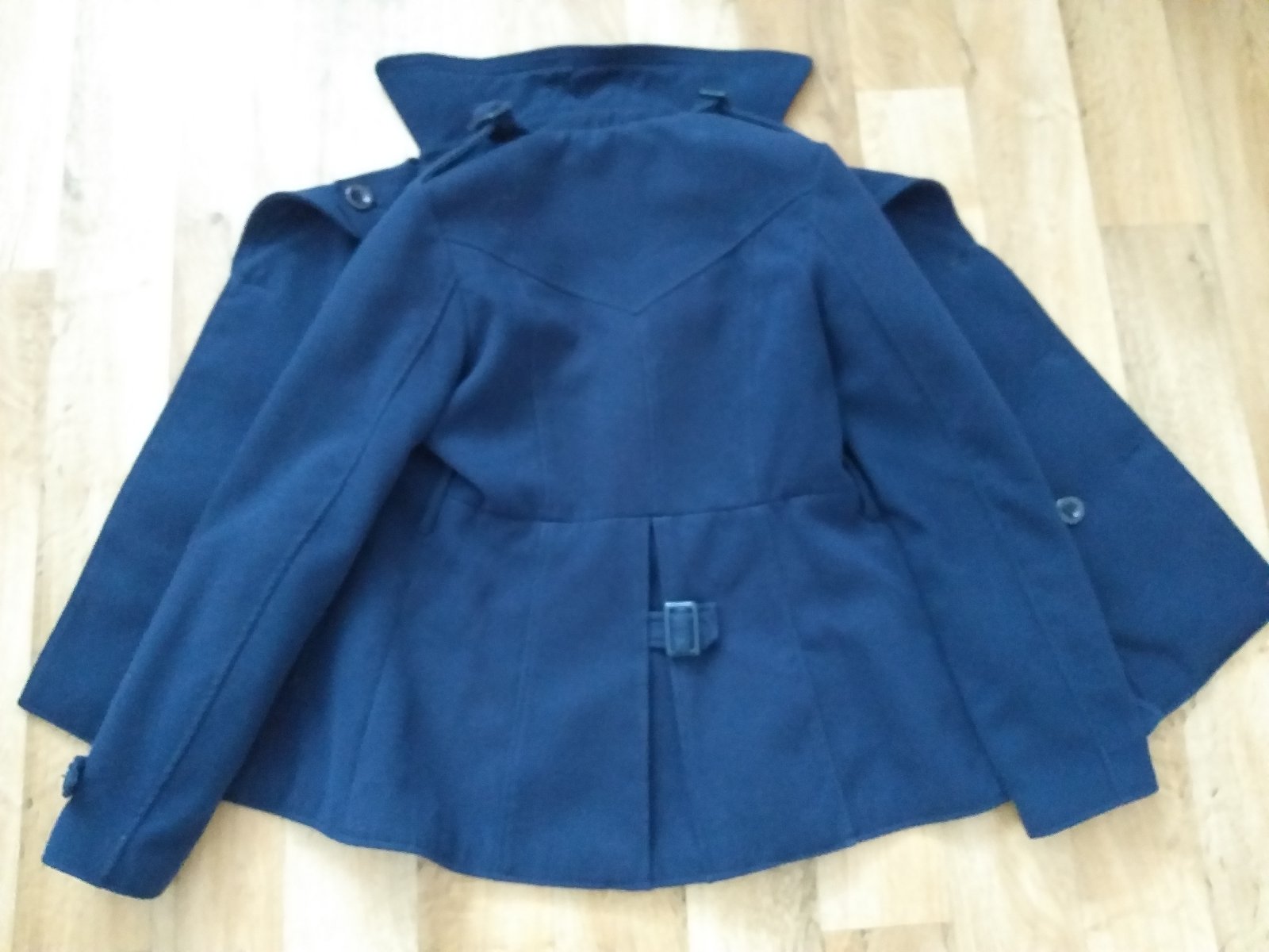 Tmavomodrý kabát, skôr prechodný alebo na teplejšiu zimu. Bez poškodení, nenosím tak posúvam. Píše veľkosť M ale sedí skôr na S.