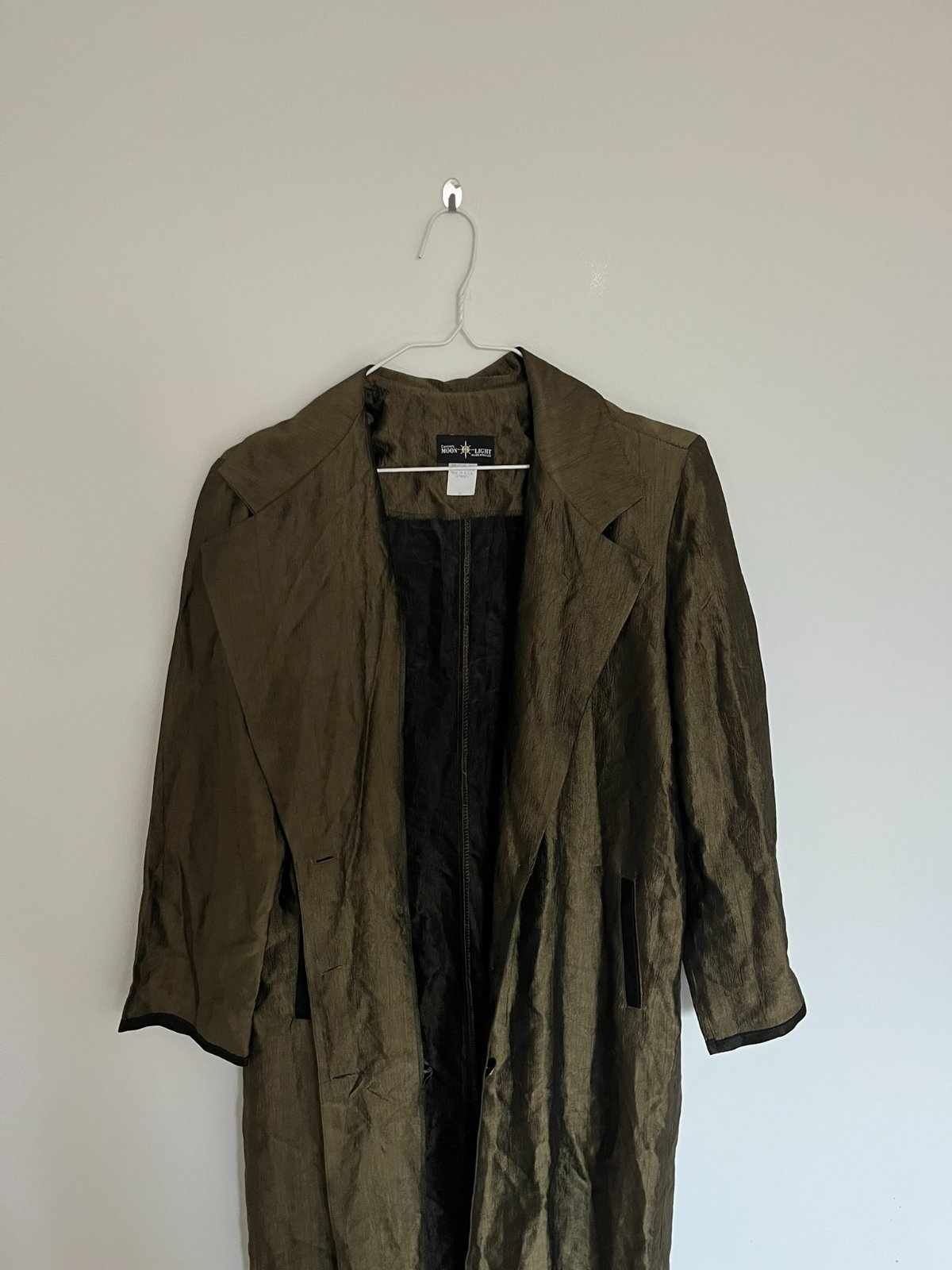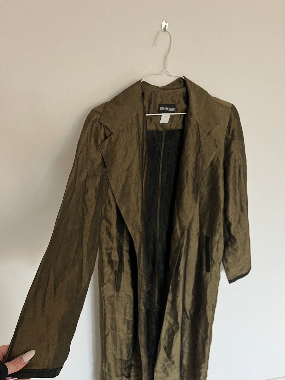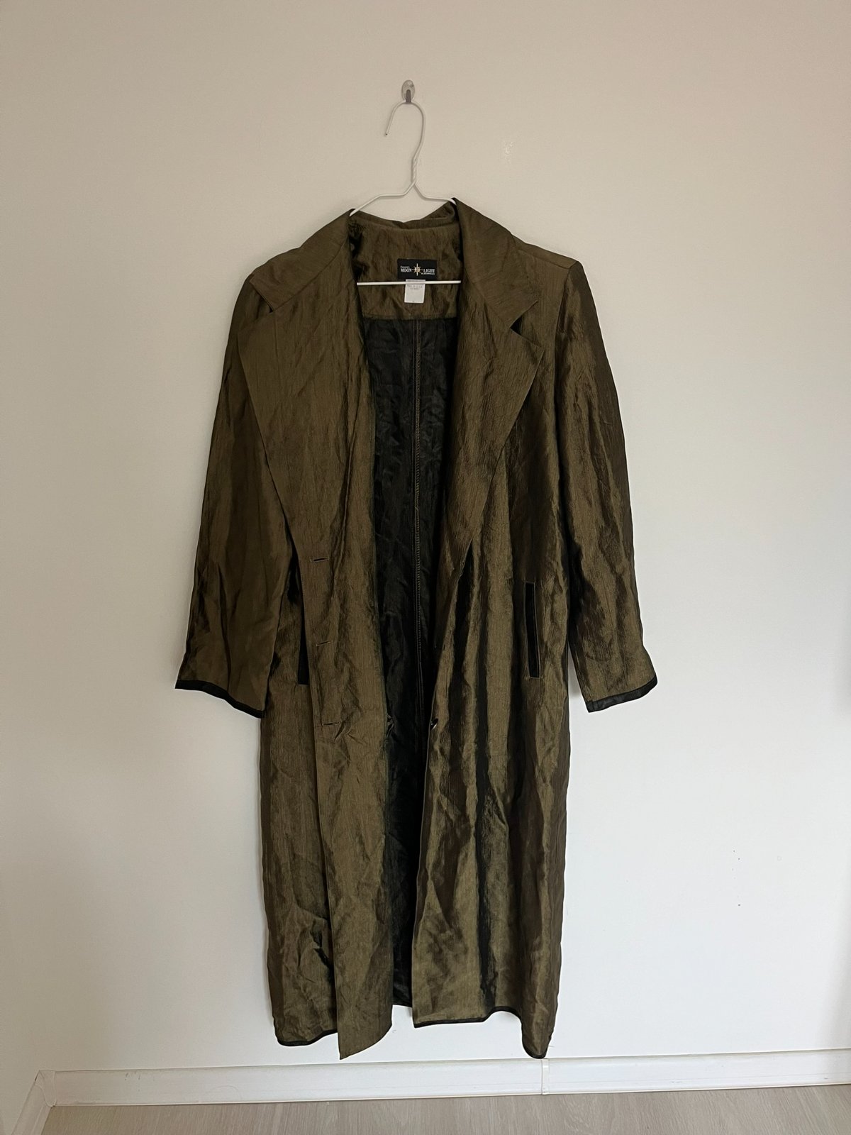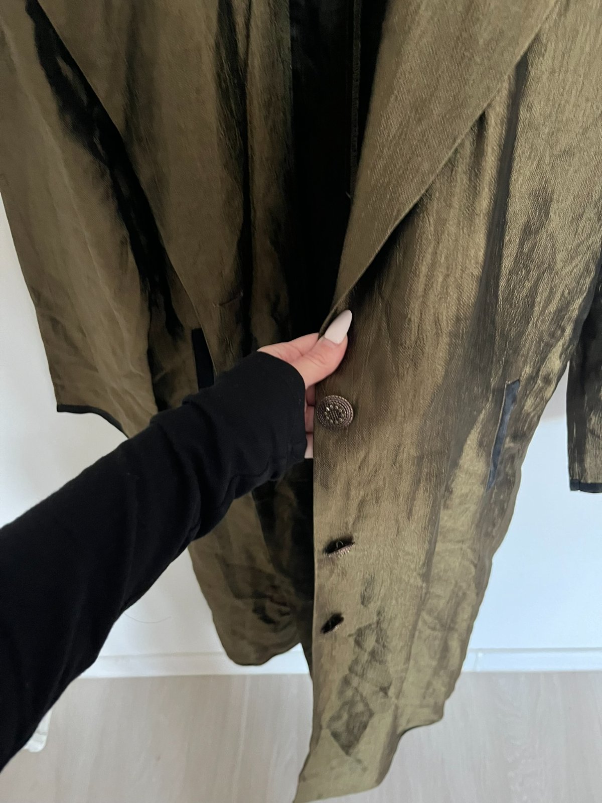 Jesenný dlhý zelený khaki maxi kabát prechodný