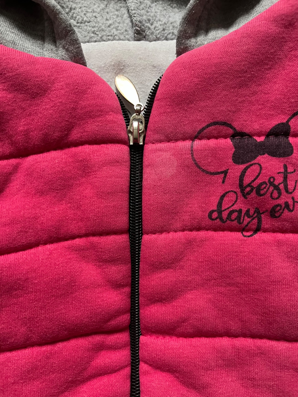 Prechodná vesta na jar/jesen. Nosená, má vpredu jeden taký nie veľmi viditeľný fliačik vid foto. Na dvor ešte isto poslúži. Nemá žiadne iné poškodenia. Veľkosť 86
