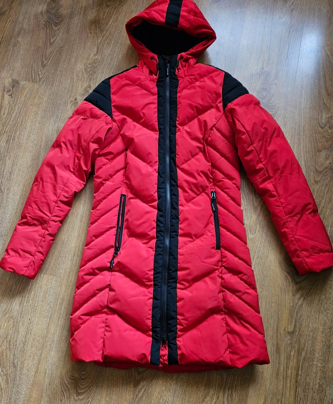 Posuniem krasnu zimnu bundu bez poskodenia velkost S
