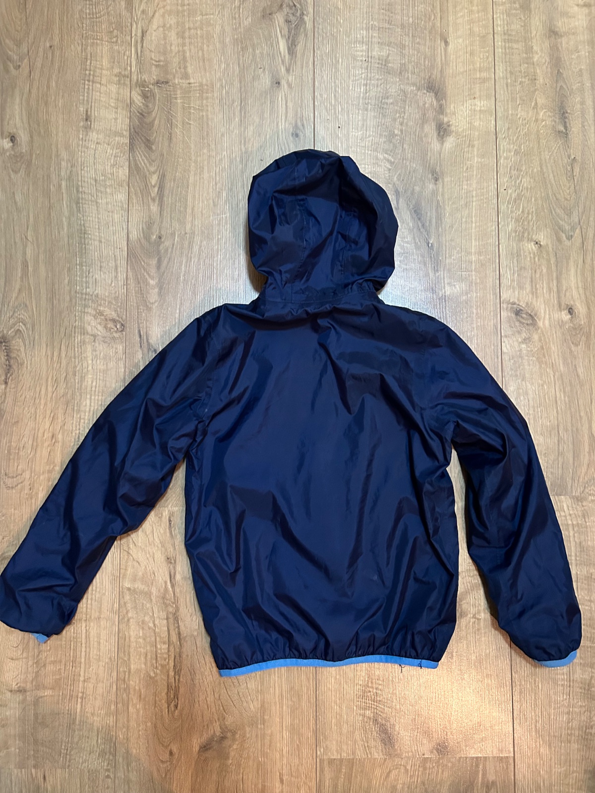 Prechodná chlapčenská vetrovka podšitá mäkkučkým flisom zn. Quechua, veľ. 128. Dĺžka cez chrbát 56 cm, šírka cez prsia 44 cm, vnútorná dĺžka rukávu 45 cm.