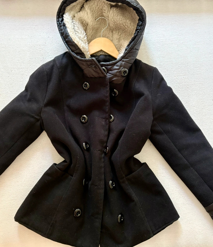 Kvalitný čierny kabát od slovenského výrobcu Odema, veľkosť S, 70% vlna, 20% polyamid, 10% kašmír, kapucňa sa dá odopnúť, je na gombíky, farba je pekná čierna, zle sa fotí, veľmi dobrý stav