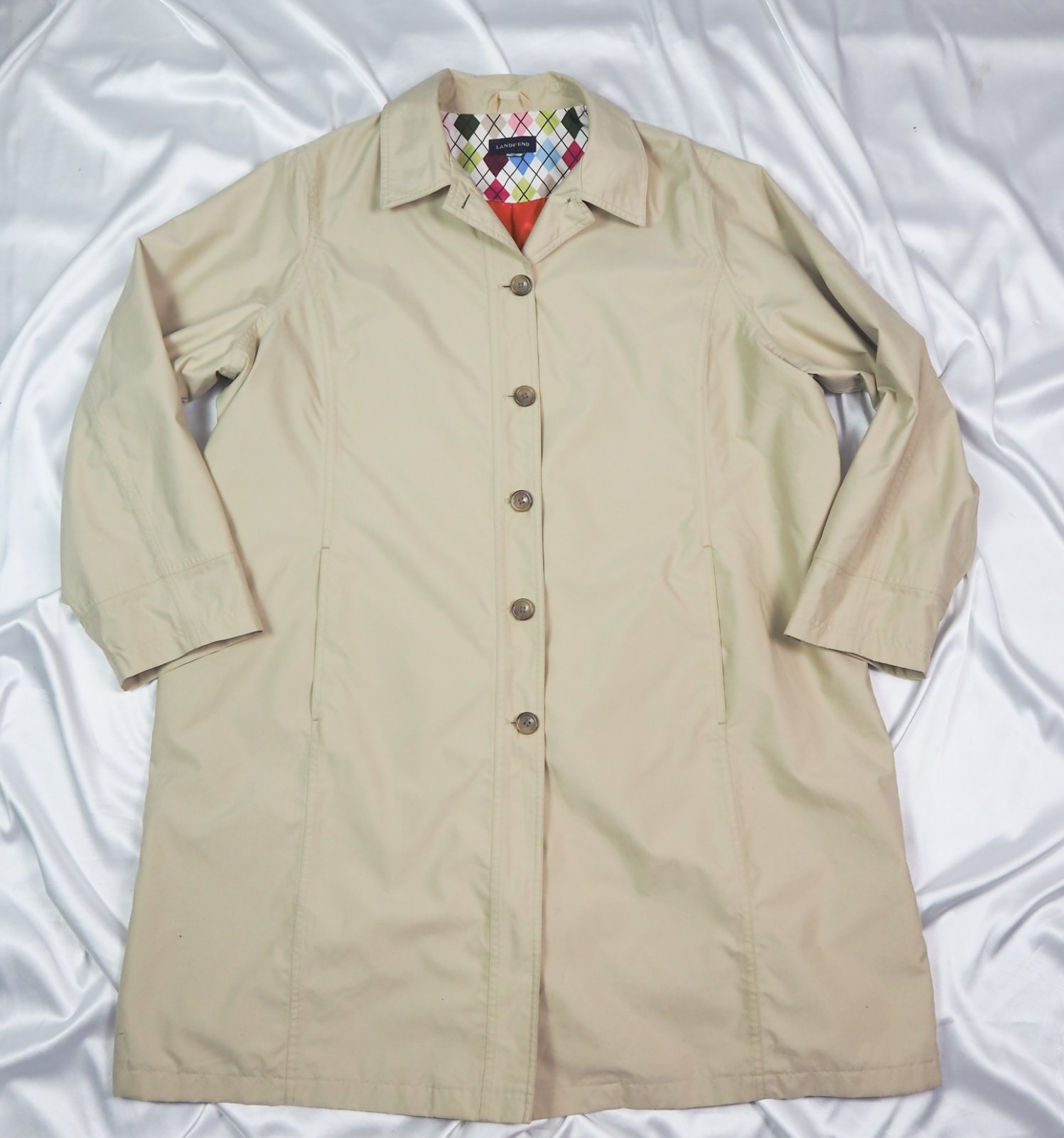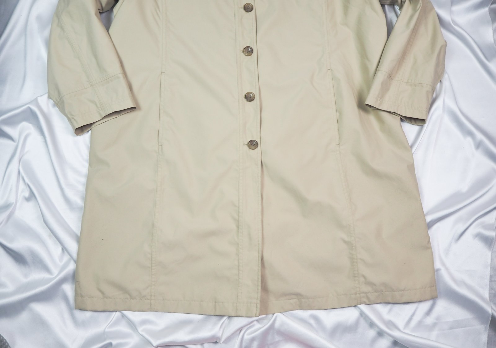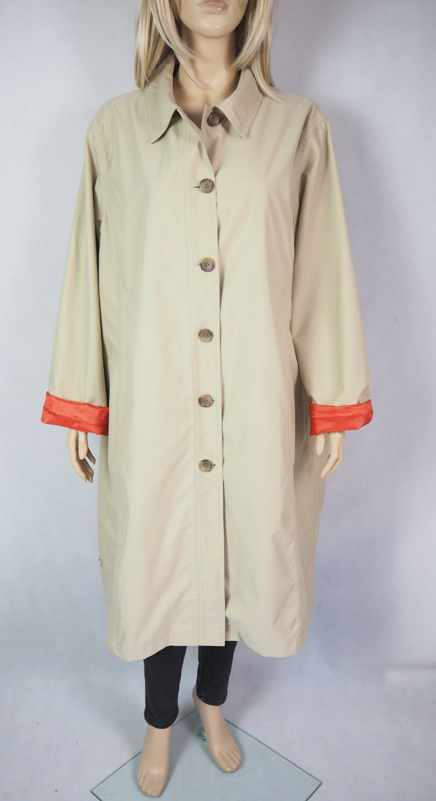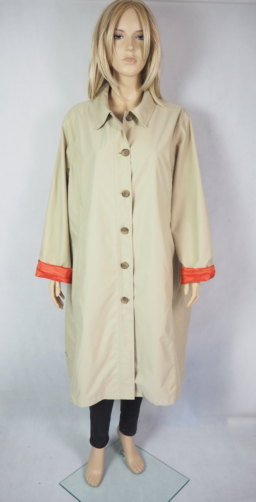 Kvalitné prechodný kabát so zapínaním na gombíky, béžove farby s oranžovou podšívkou, materiál 100% polyester, super stav, ako nový.