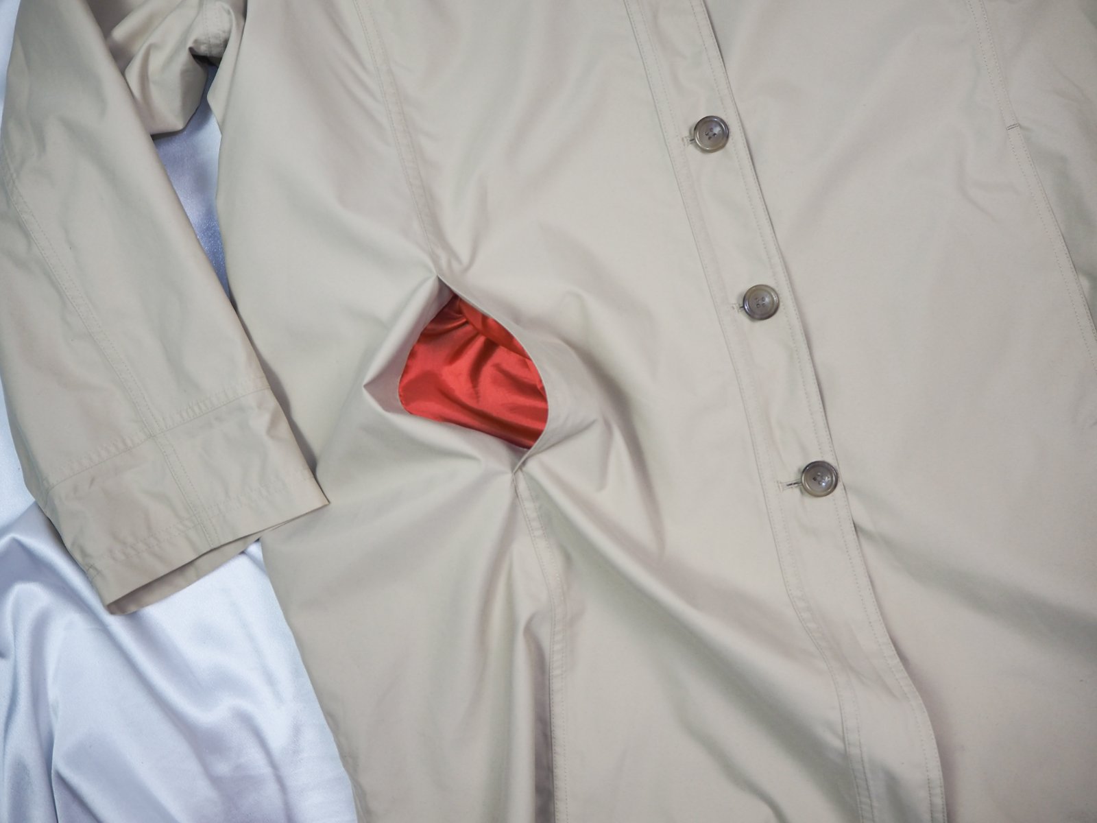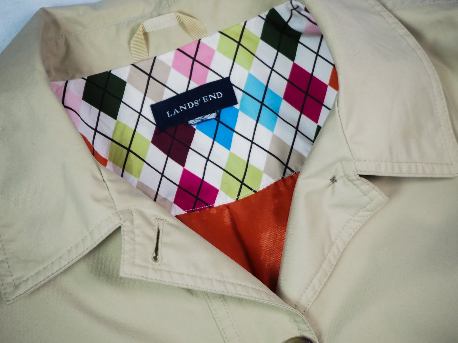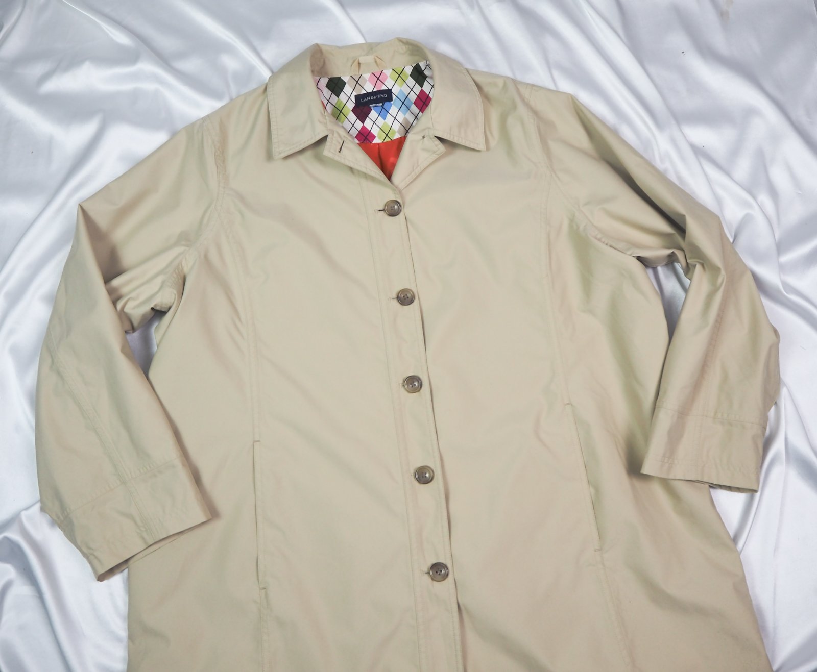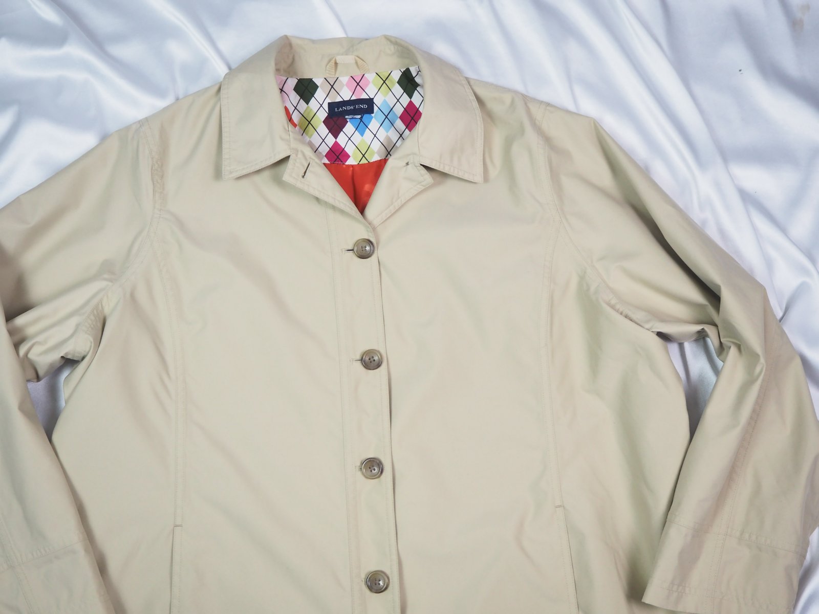 Kvalitné prechodný kabát so zapínaním na gombíky, béžove farby s oranžovou podšívkou, materiál 100% polyester, super stav, ako nový.