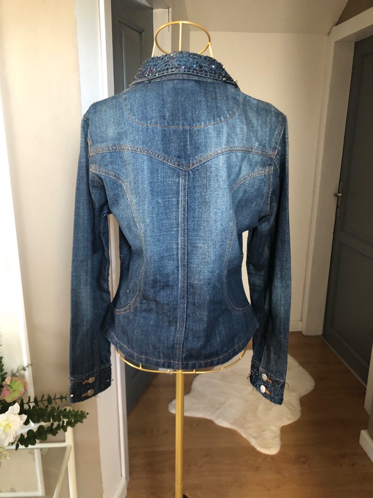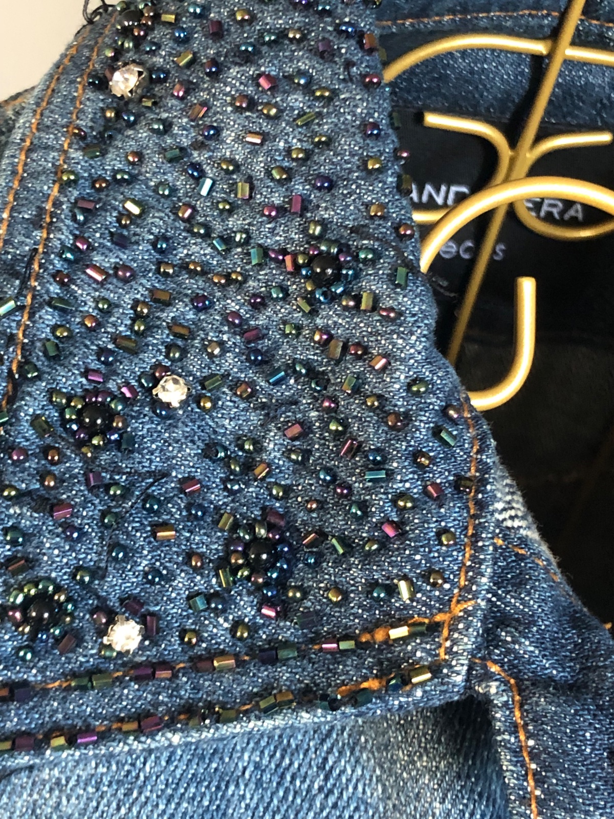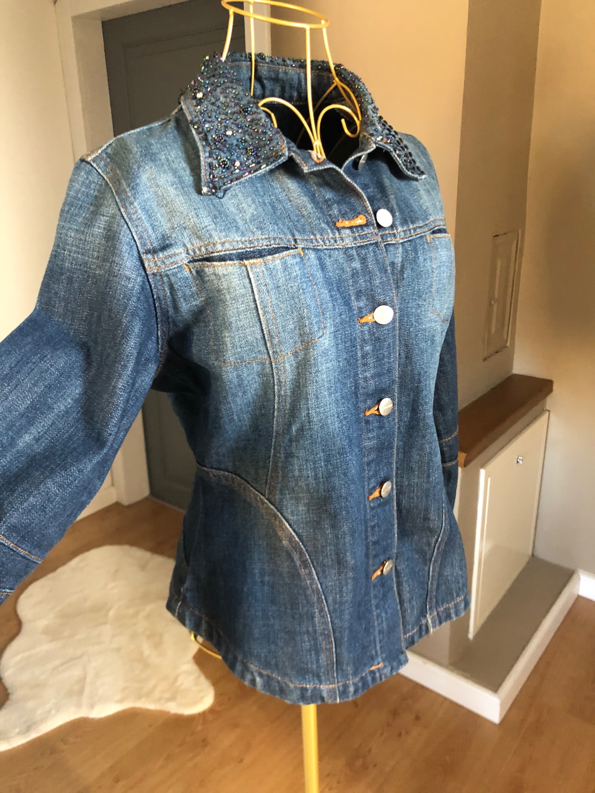 Kvalitná riflová bunda, zapínanie na gombíky, bez podšívky, golier a rukávy zdobené korálkami, super stav.