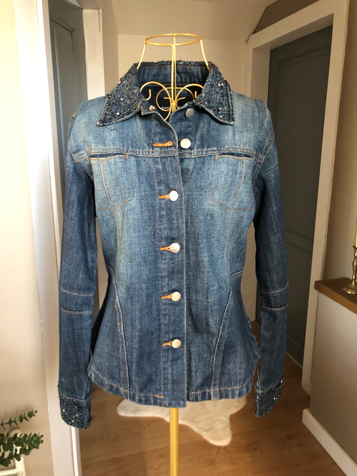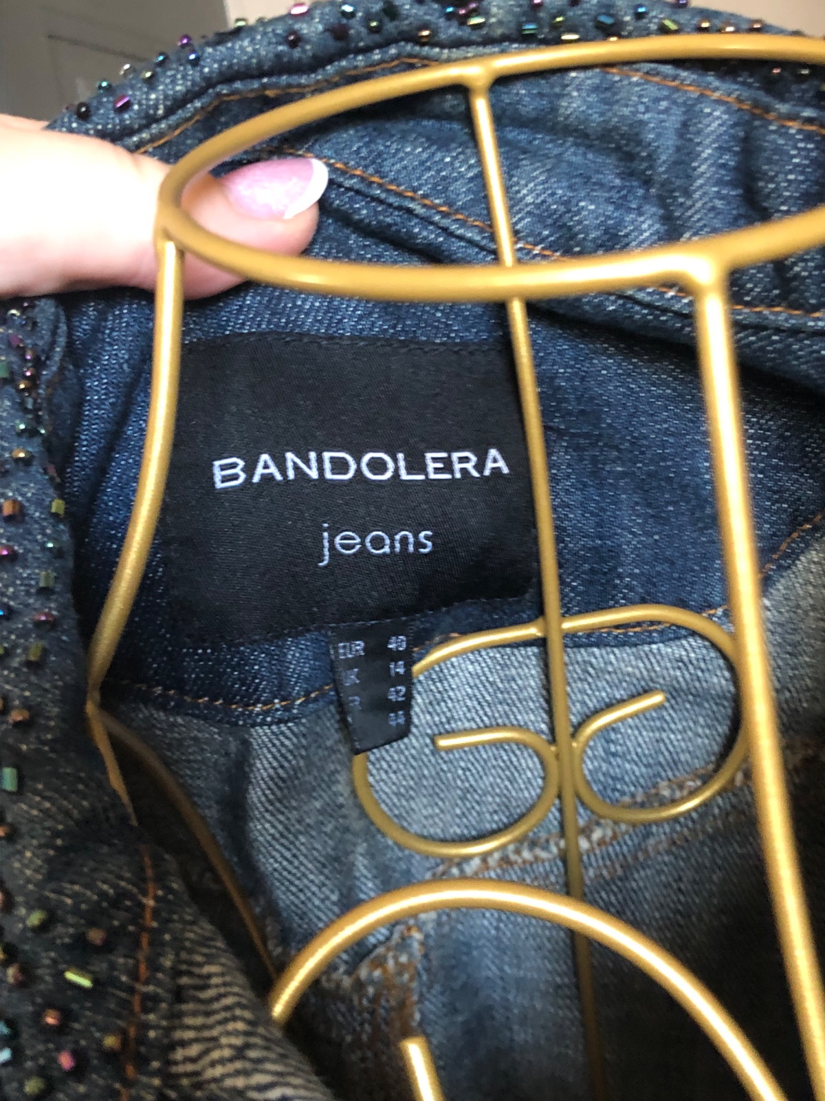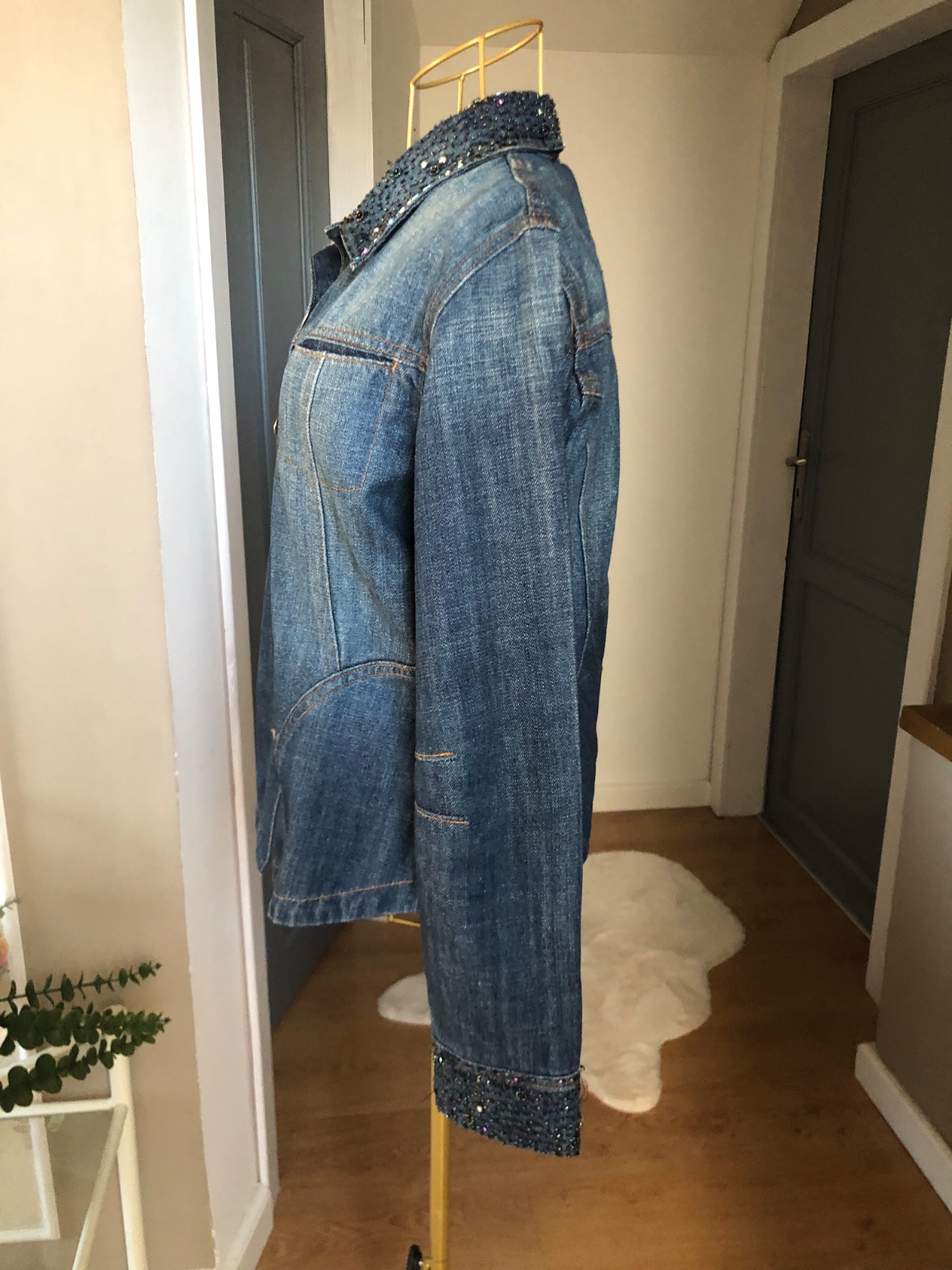 Kvalitná riflová bunda, zapínanie na gombíky, bez podšívky, golier a rukávy zdobené korálkami, super stav.