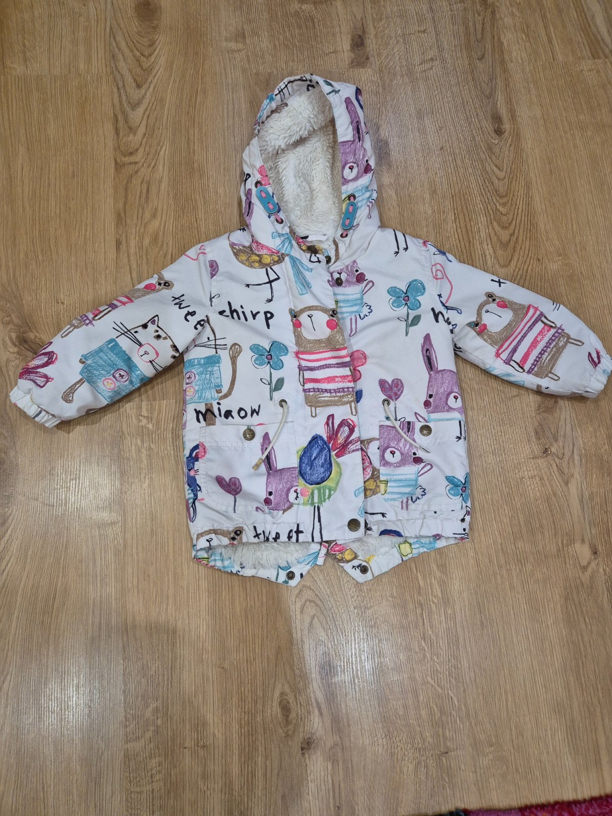 Zimna bunda, parka nosena 2 detmi, ale nema flaky ani zodrane rukavy. Vel.92, ale zda sa mi trosku vacsia - miery su nafotene.