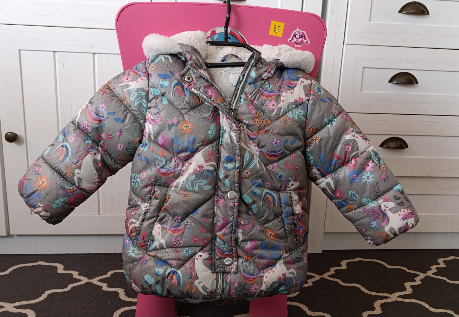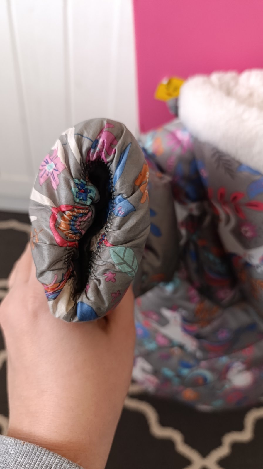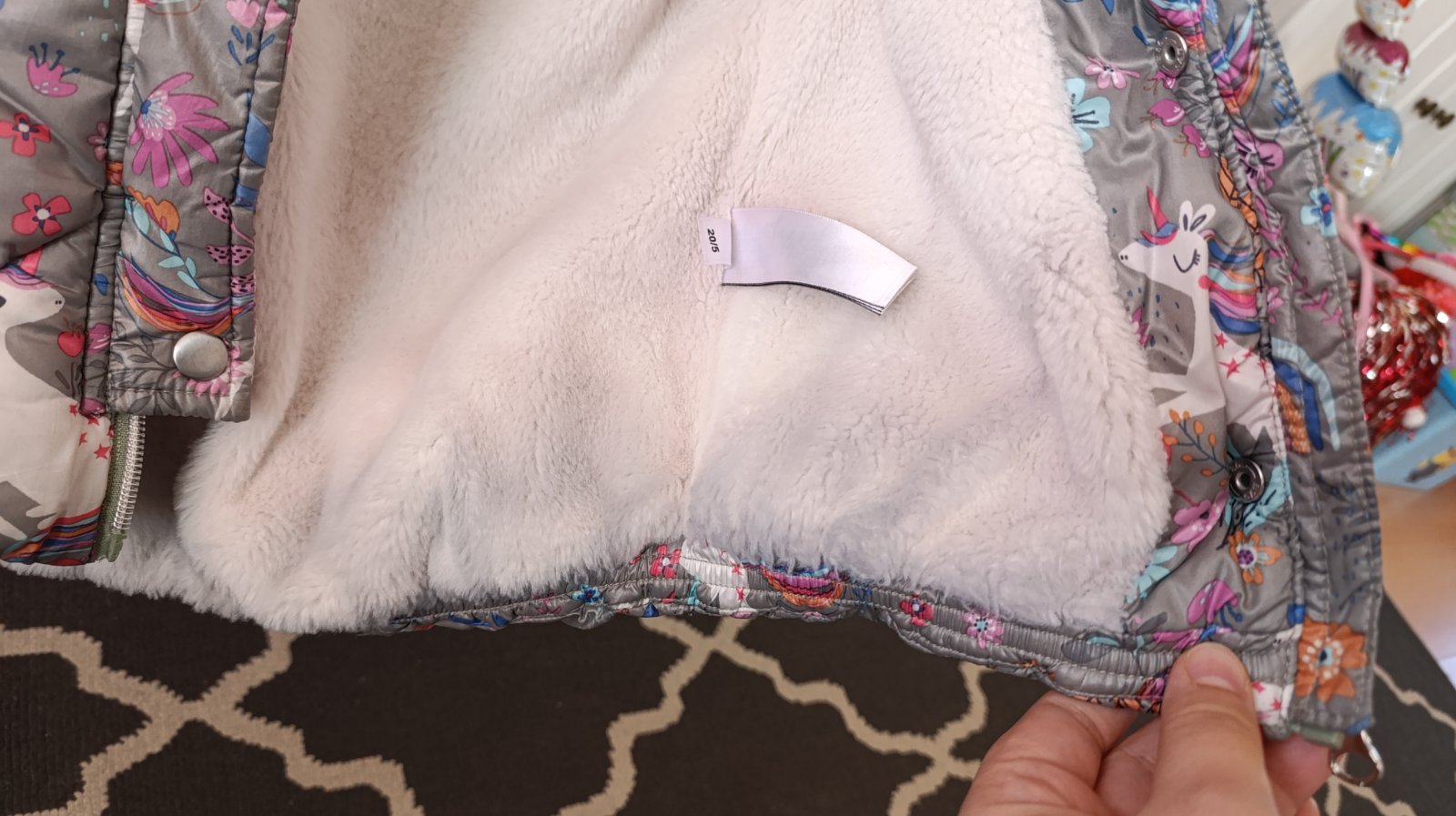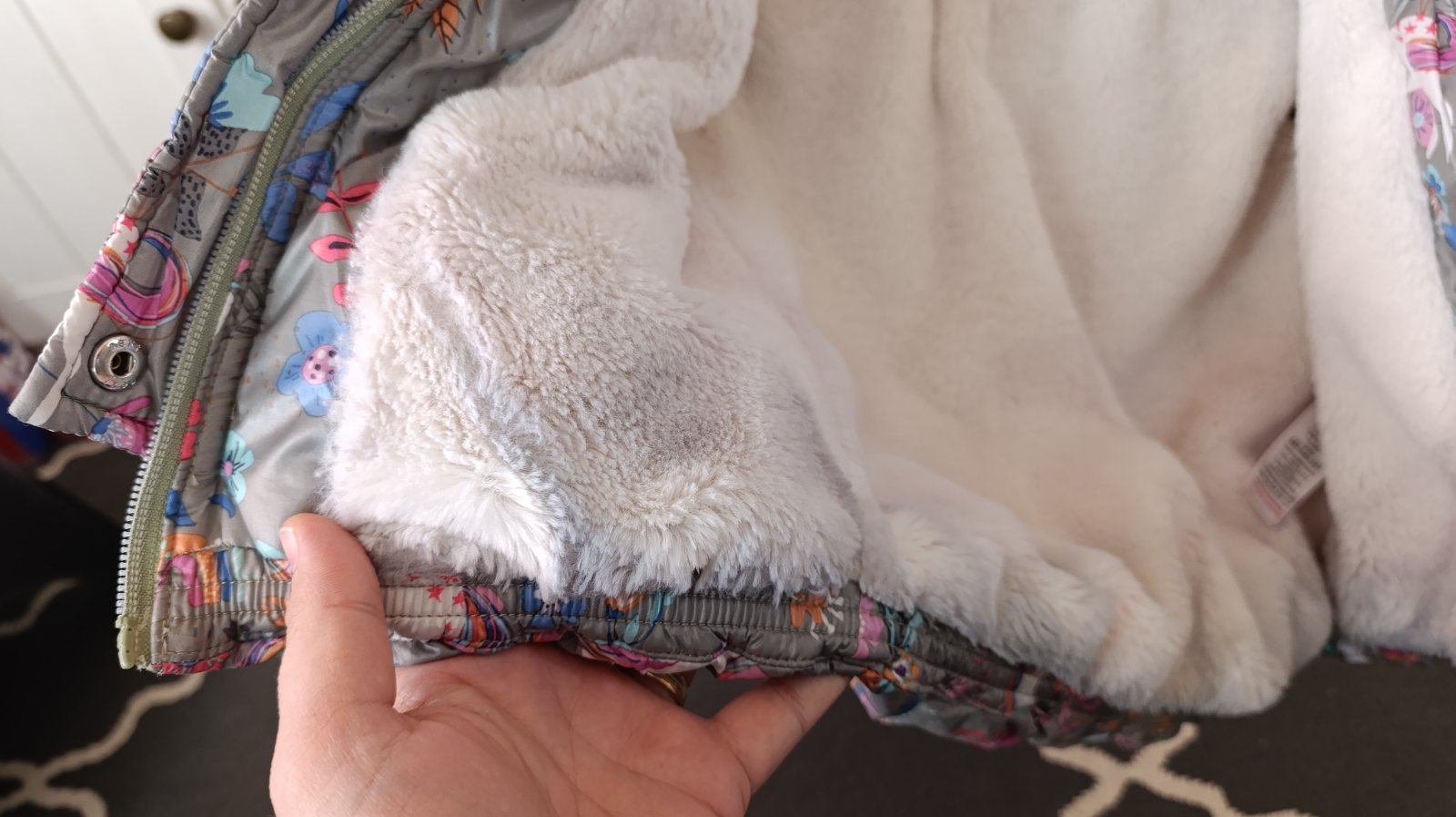 Veľmi hrubá, teplučká. Z vonku je krásna. Dnuka na kožušinke naspodku je však sfarbená od nohavíc, pri nosení vôbec nevidno. Viď foto.