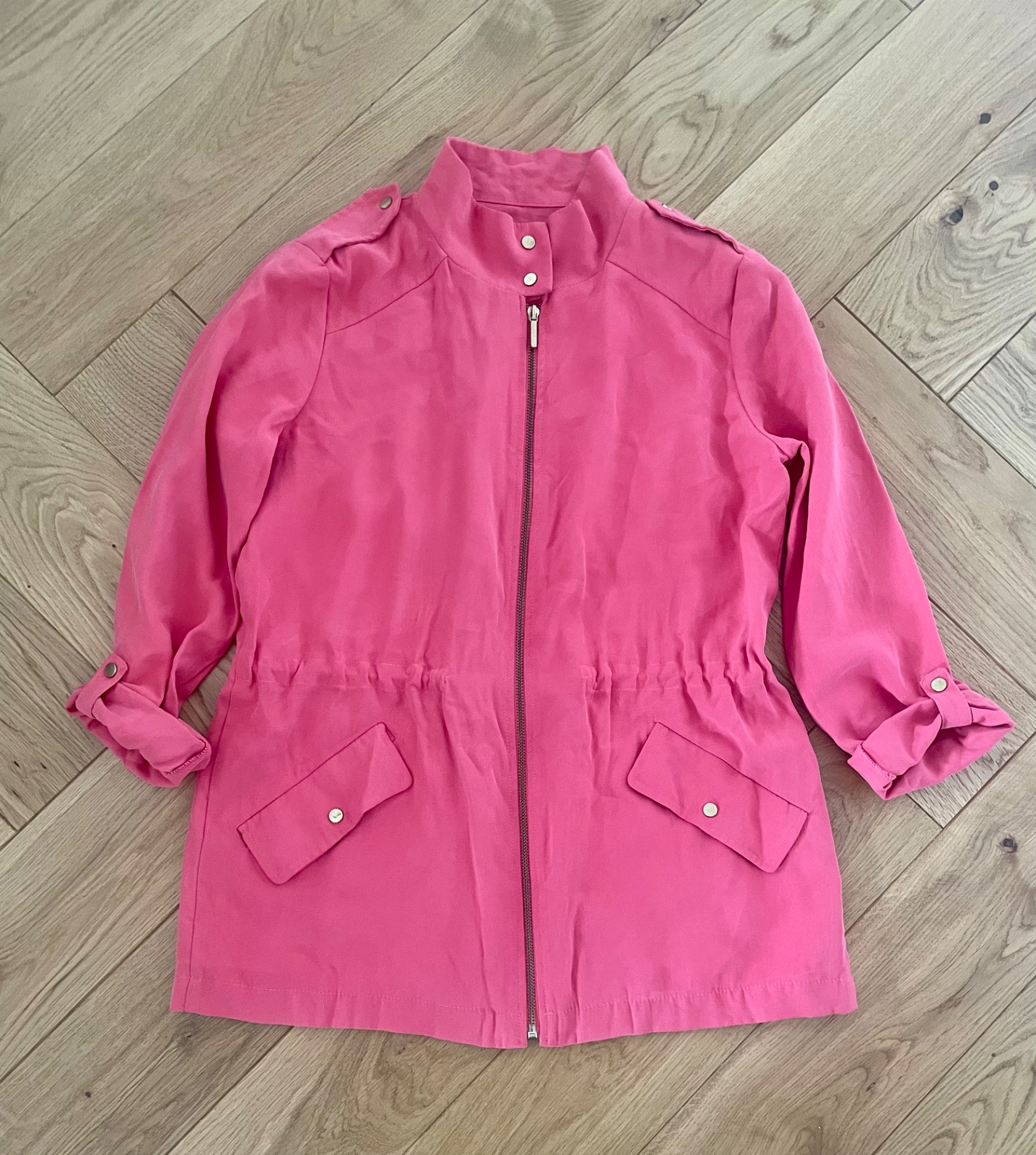 letny kabatik z viskozi, raz obleceny v super stave, akurat ma nedokonalost na gombiku-vid foto. Vnutri sa da v pase stahovat.