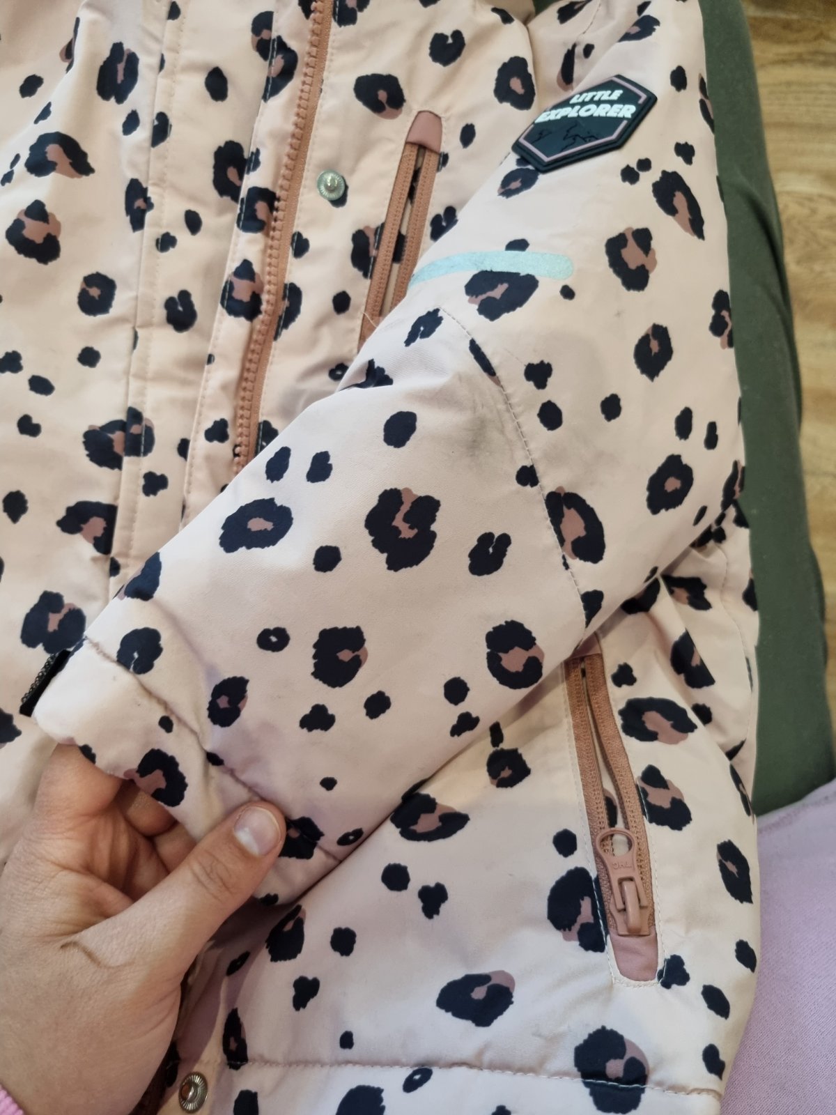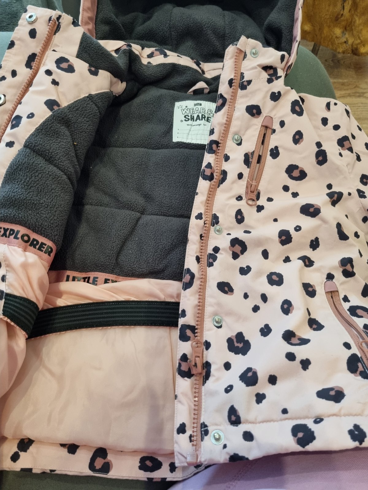 Nosena bunda v zachovalom stave. Na predlakti vidno niečo cierne na obidvoch stranách inak bez poskodenia. Nieje to moc vidno,kvoli vzoru bundy. Vek 3-4r