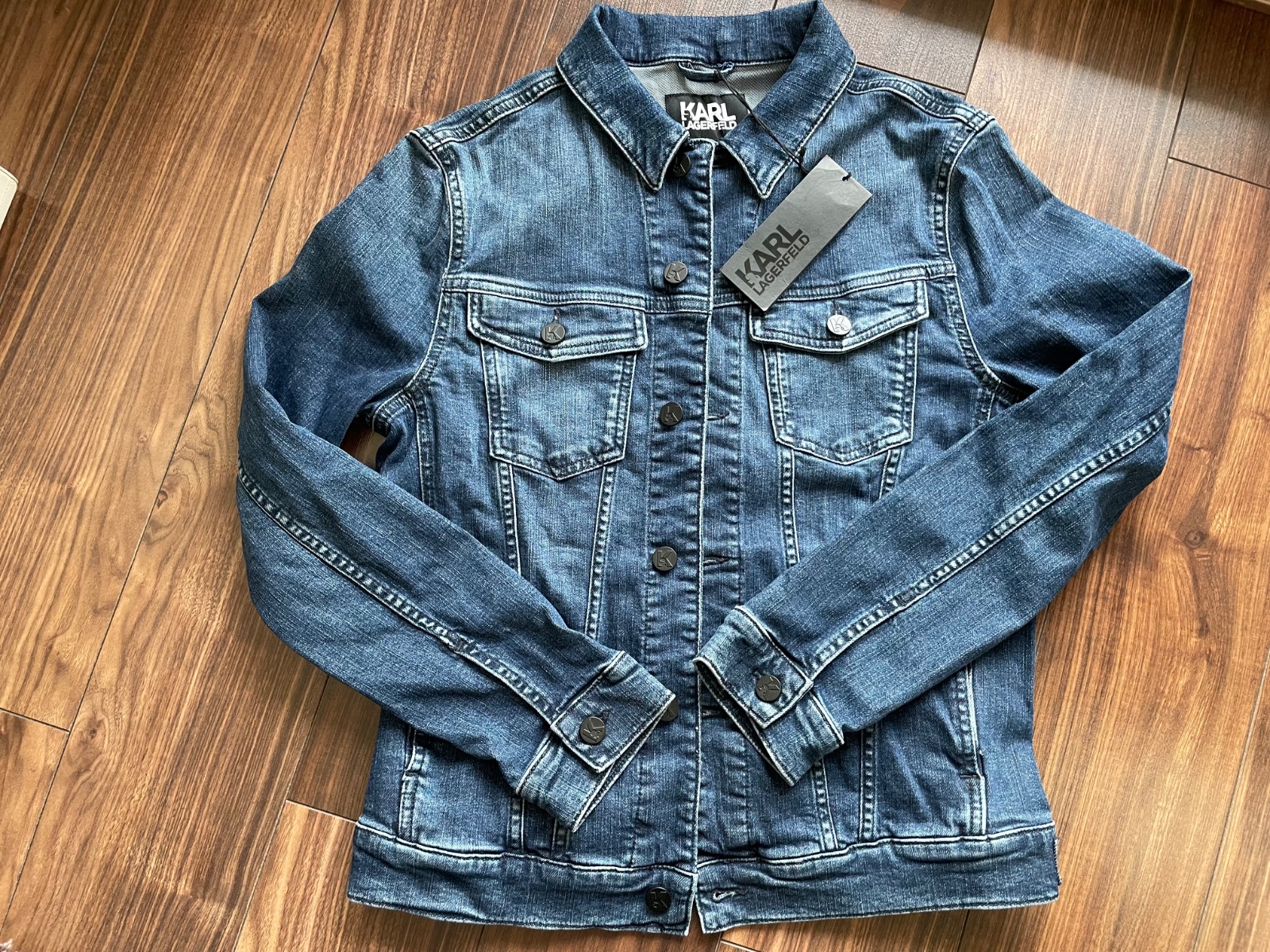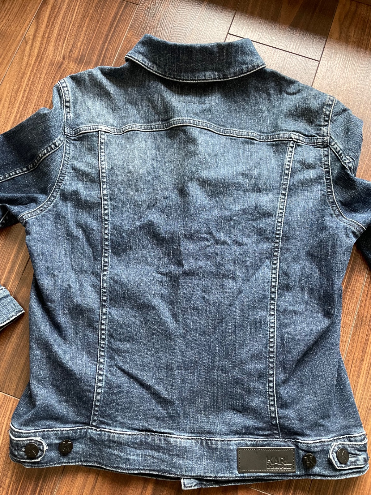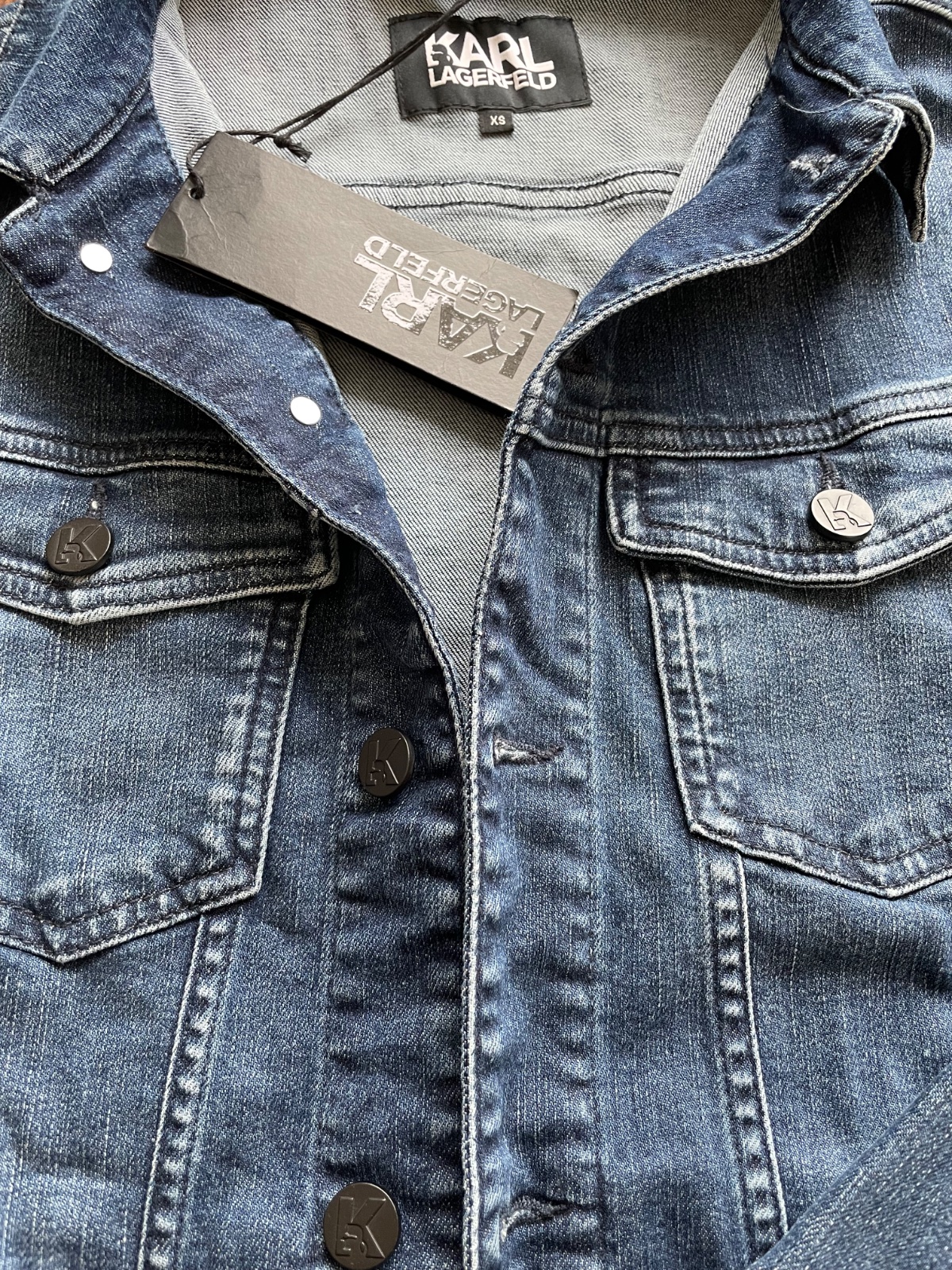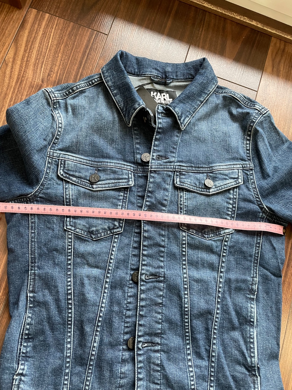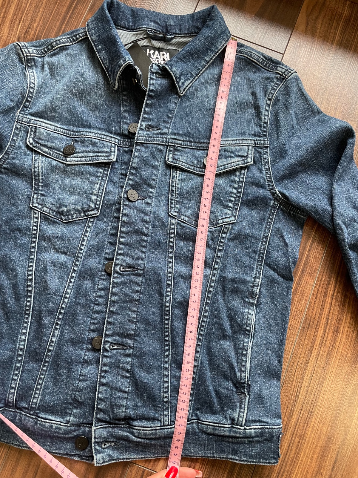 Predám rifľovú bundu zn. Karl Lagerfeld, originál, kupovaná v Rakúsku, kupovaná ako darček podľa označenia zlej visačky xs, ale sedí na veľkosť M, rozmery viď foto, nikdy nenosená- zlá veľkosť, cena 85€ plus poštovné