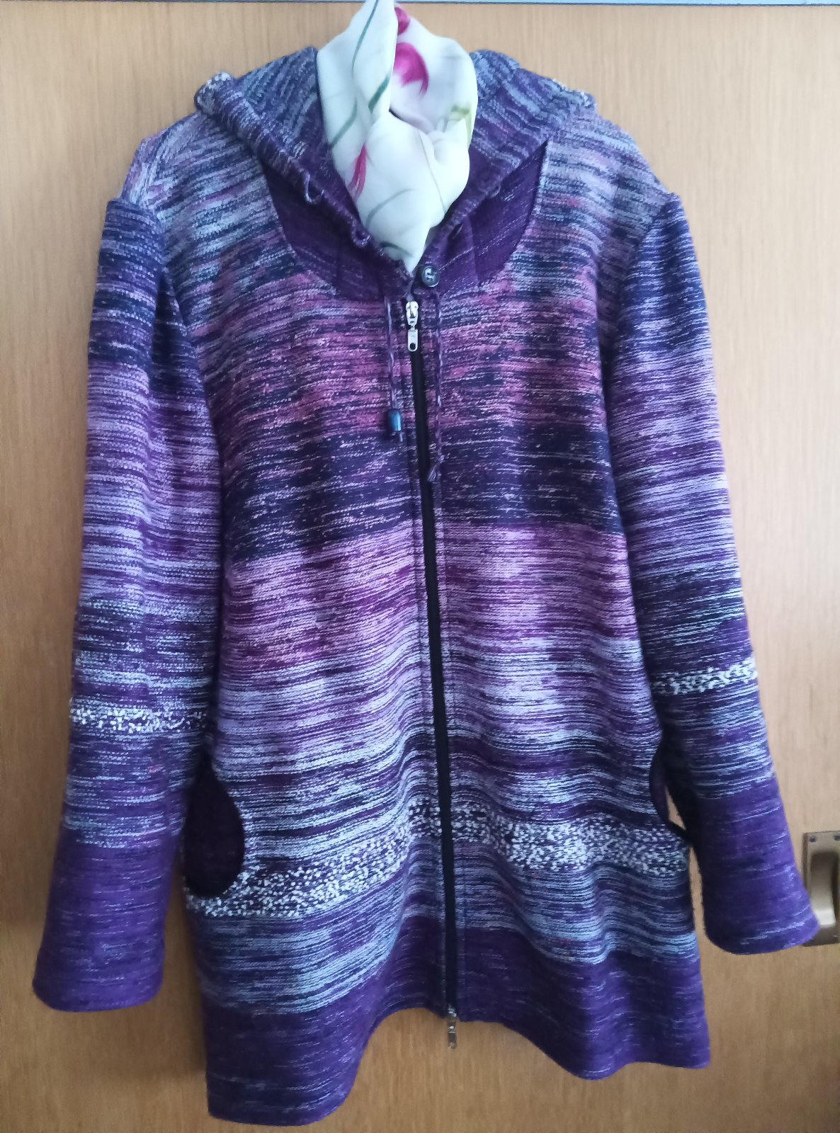 Krásna pletená handmade bunda /akryl-ba ,od Českej zn. : pletynka, párkrát oblečená , /nevyužívam, tak posúvam/. Pôvodná cena vysoká, využiť sa dá na jeseň, jar. Je bez podšívky, vpredu sú praktické vrecká, s kapucňou.