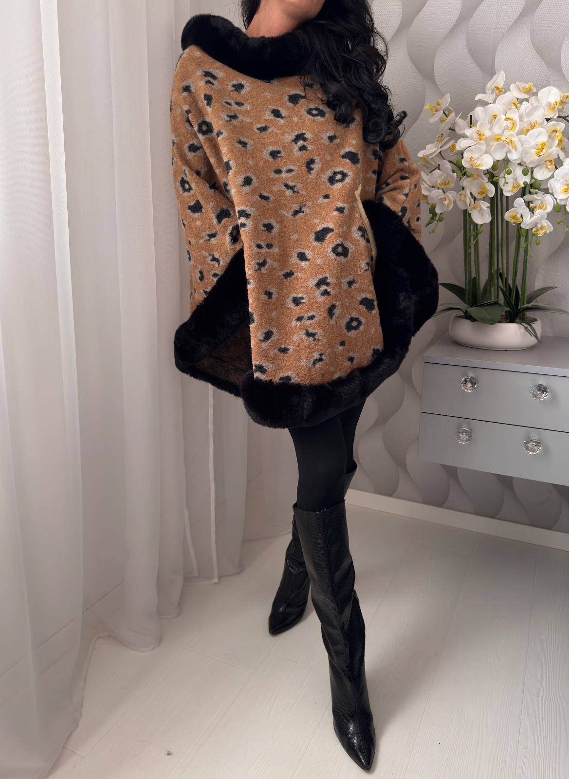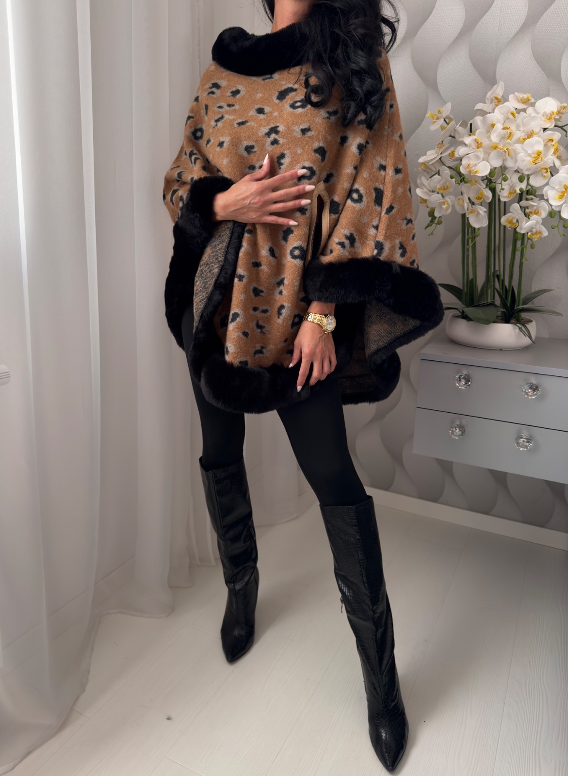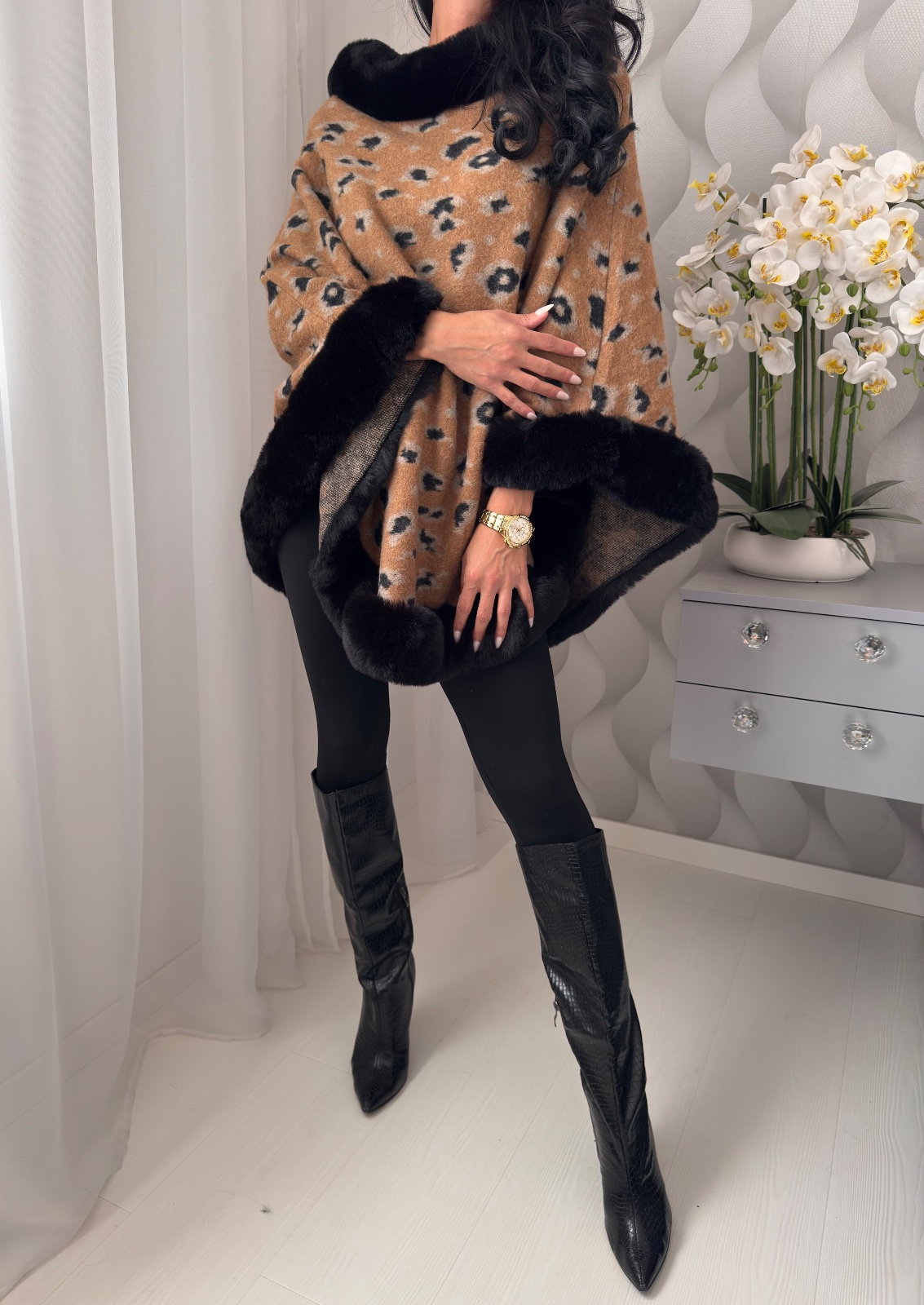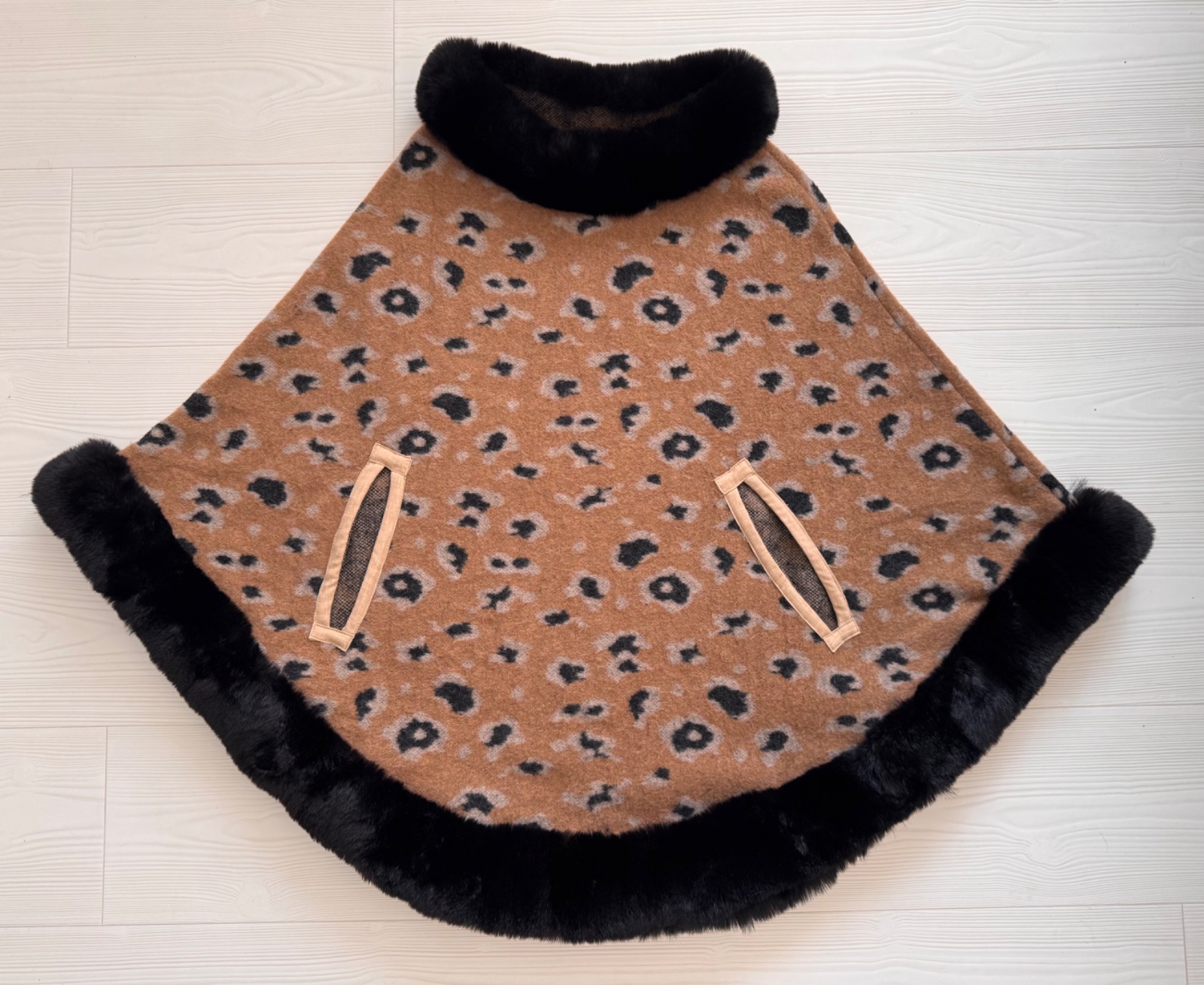 Zaujímavé pončo lemované s čiernou kožušinou.