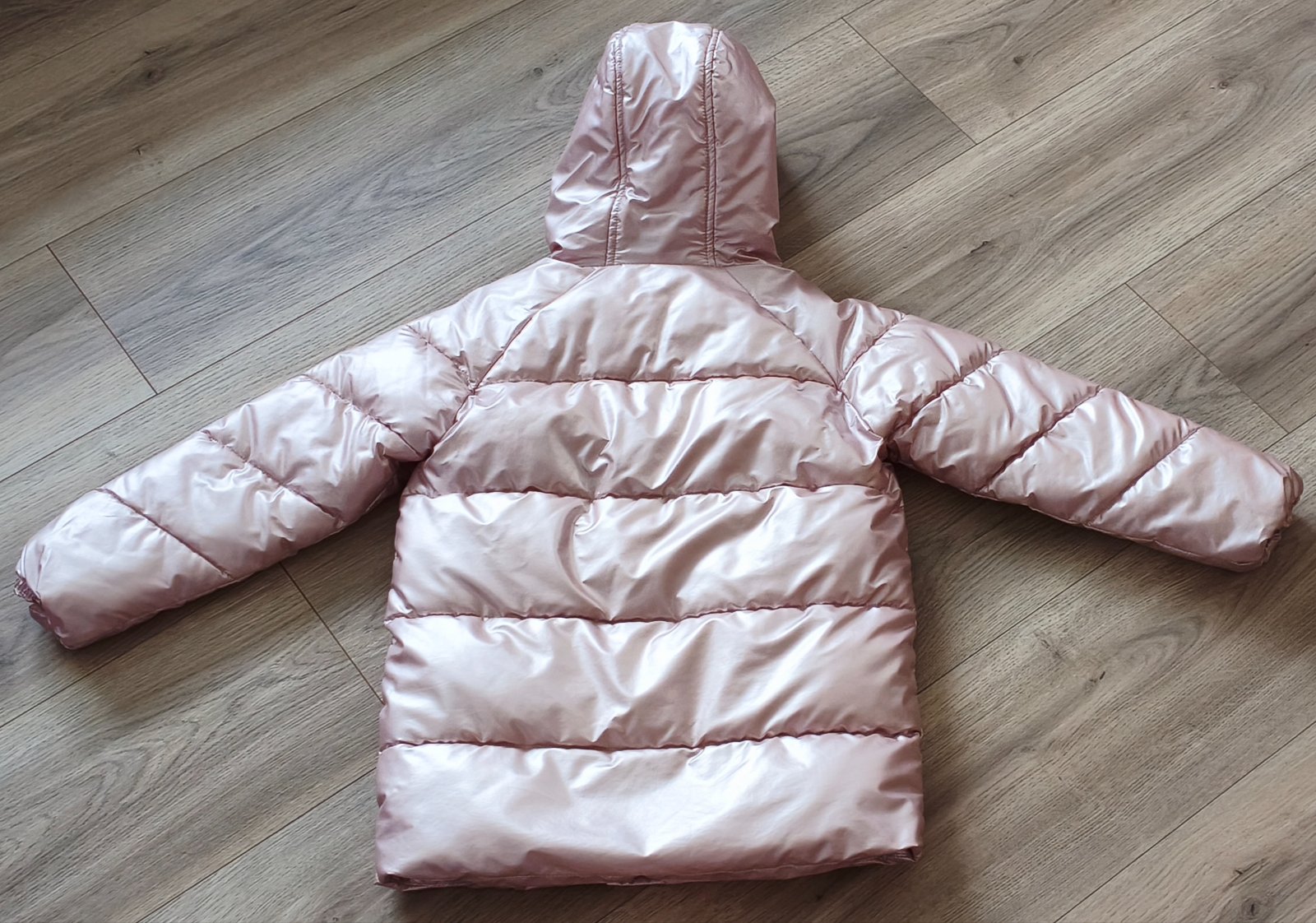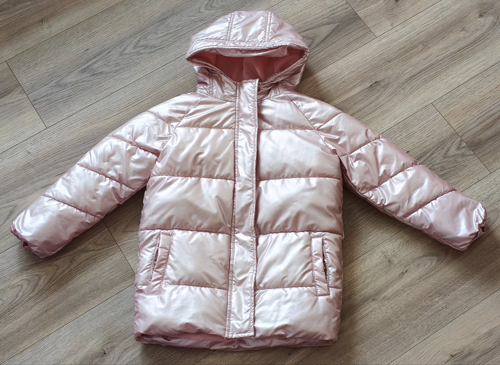 Perleťovo ružová zimná bunda vo veľkosti 116 (6 rokov), používaná, ale stále krásna, bez poškodení. Zapínanie na zips a cvočky, vrecká iba na cvočky, všetko funkčné. Cena 6 € plus pošta alebo osobný odber.