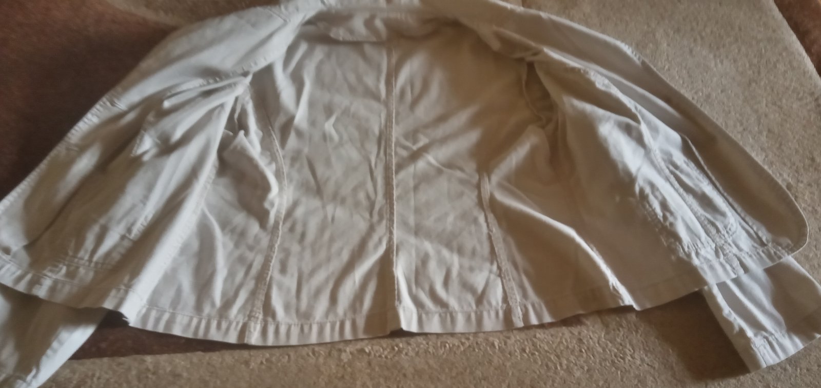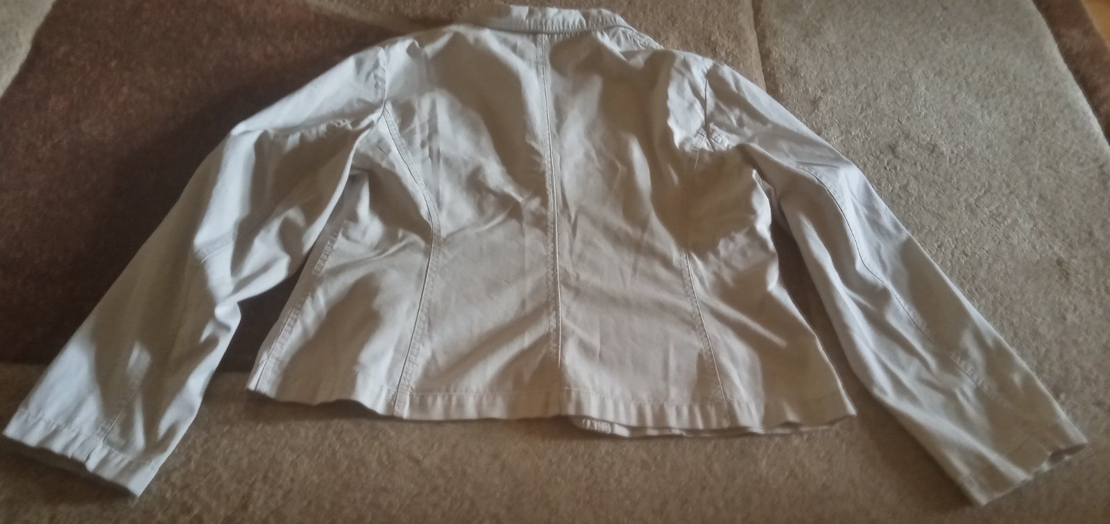 posuvam pekne prepracovane sako jarny kabatik,kremovej farby,niečo take ako tenka riflovina, velkost, 44, premerajte..dlžka 55cm, ramena 45cm, rukav 59 cm, širka pp 53 cm,