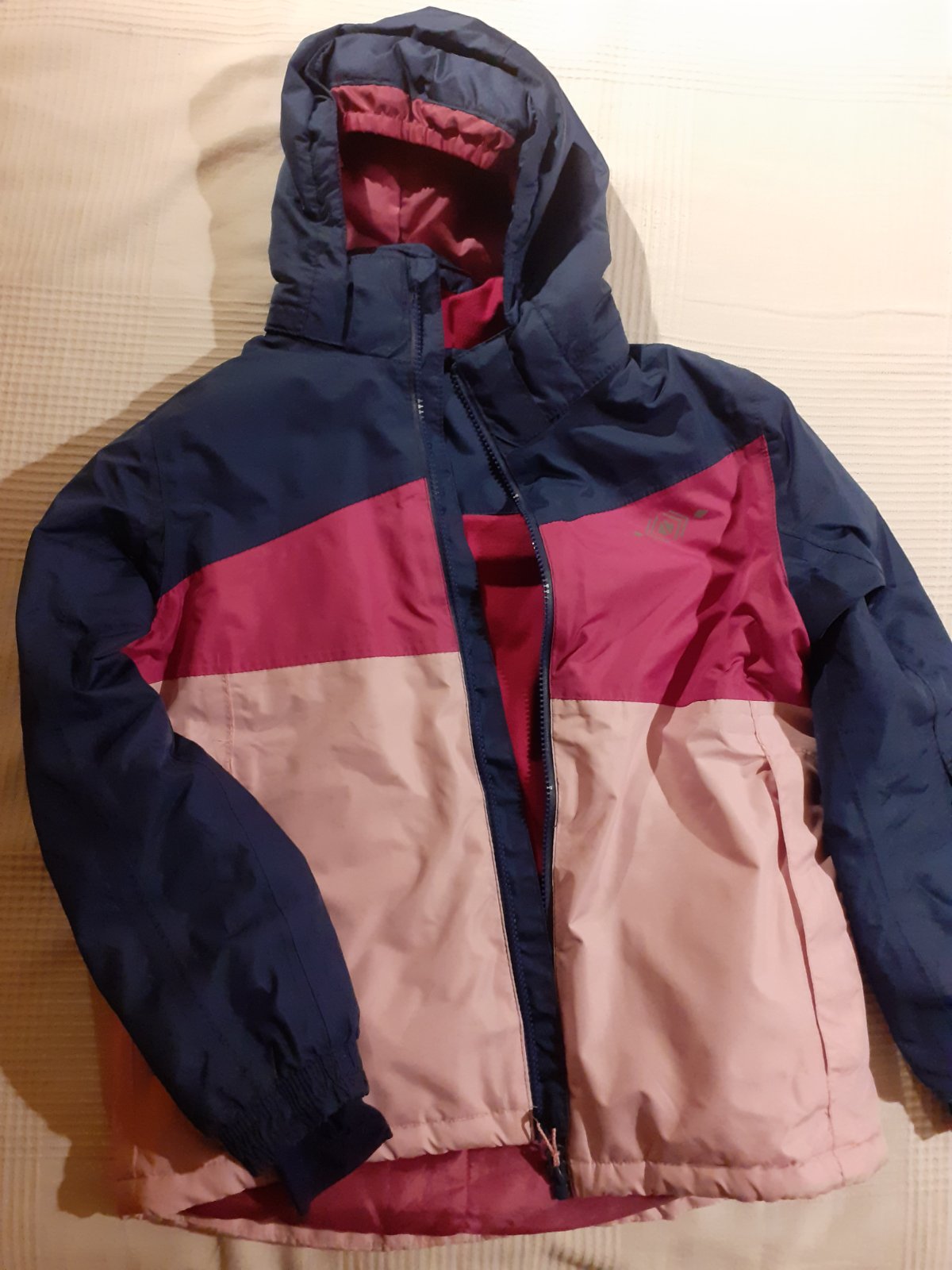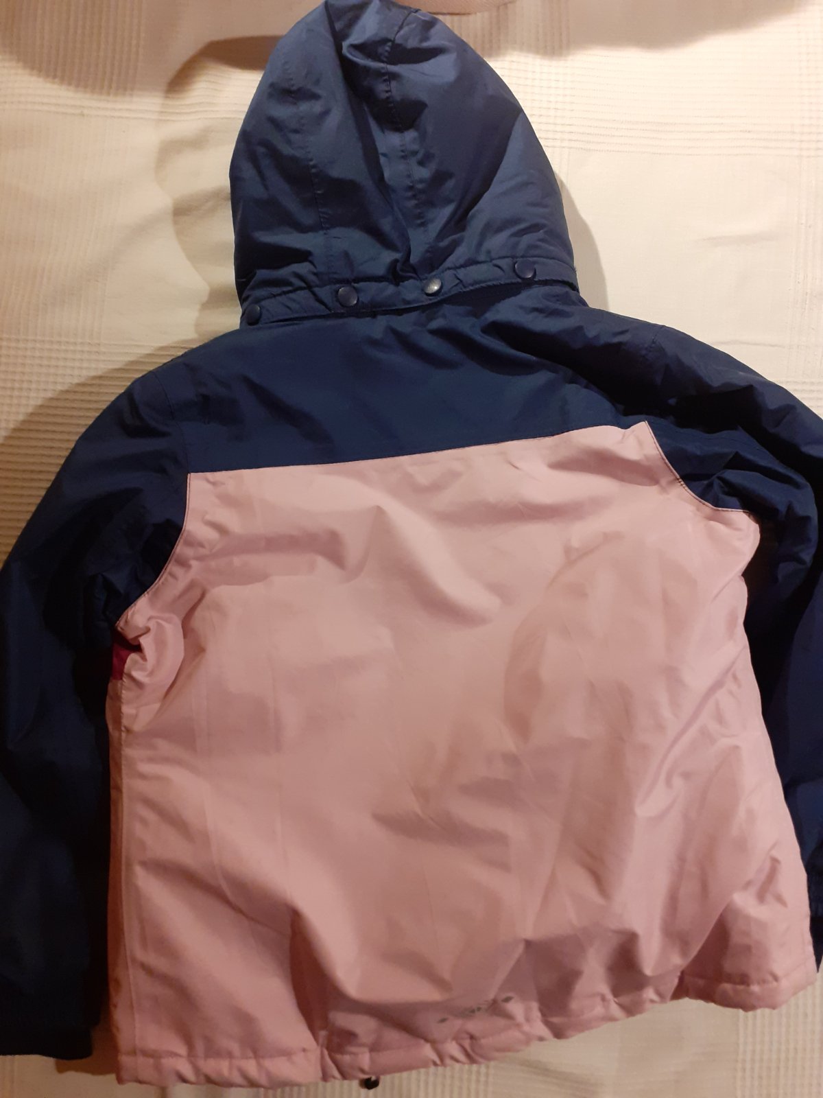 Krásna lyžiarska bundička, odnímateľná kapucka a snežný pás, super stav bez poškodenia, malinká škvrnka takmer neviditeľná, ledva zachytená - v krúžku na fotke, možný aj osobný odber v Záhorskej Bystrici. Celková dĺžka 54cm, rukáv od kapucne po patent 60 cm, šírka meraná pod pazuškami 48cm