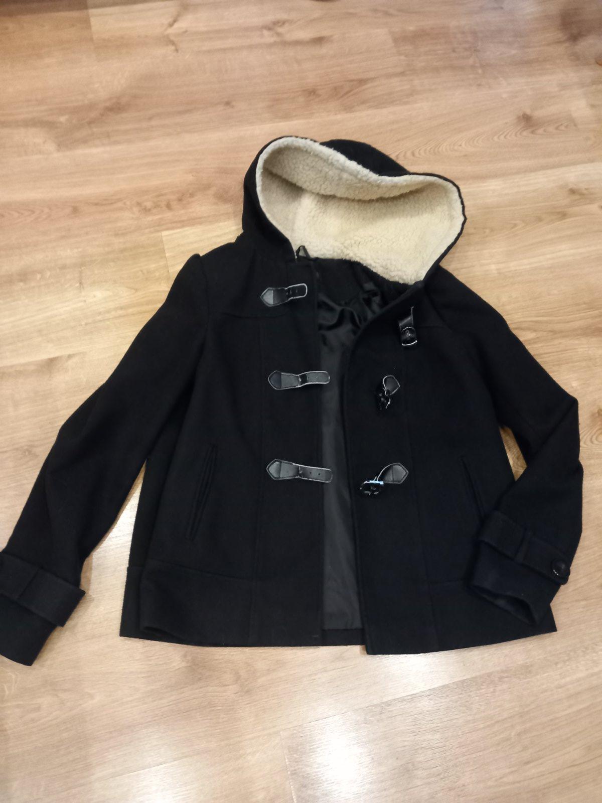 Damsky teplý zimný kabát nosený jednu sezónu, veľkosť je písaná M ale podľa mna je to tak M/L , 38/40, moja výška 168cm Šírka cez prsia 50cm, kabát rovného strihu