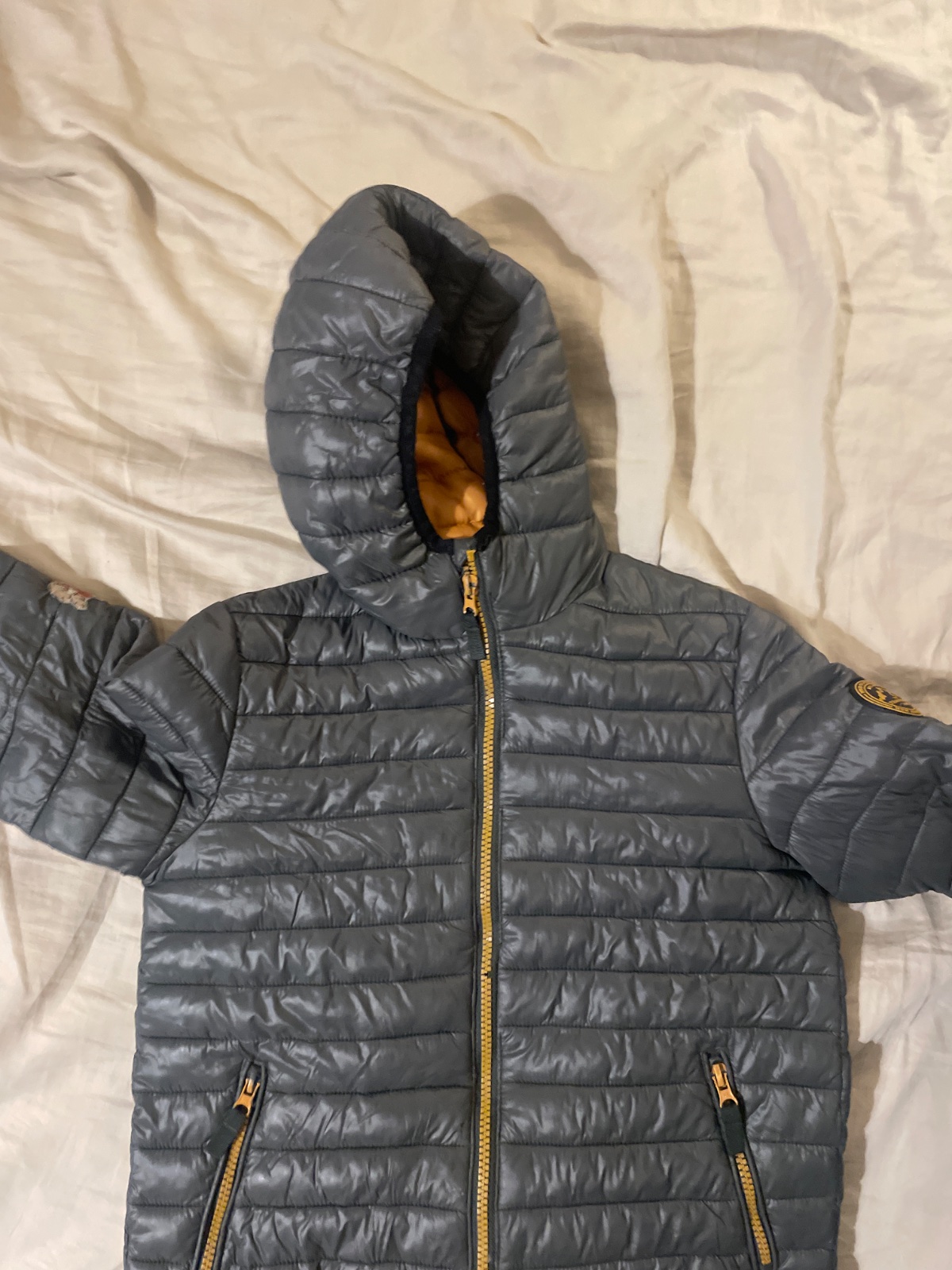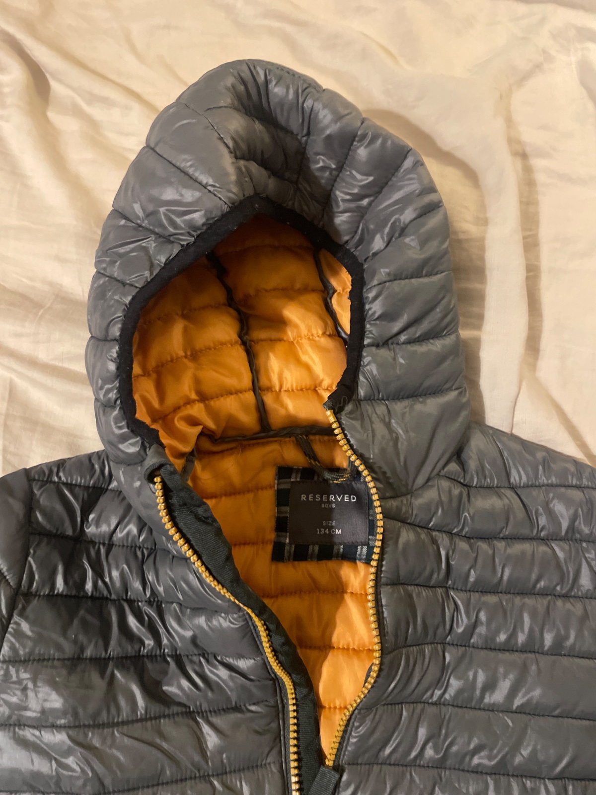 Má potiahnuté očká na ľavom rukáve a na chrbte pod kapucňou ( foto), inak bez funkčných poškodení.