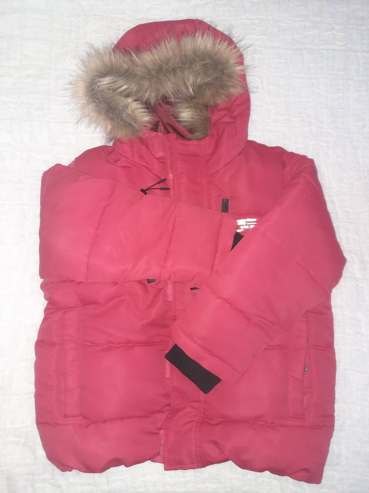 Bez poškodení, krásna nevyblednutá farba. Ťažšie sa fotí. Pekná červená. Rozmery. Dĺžka celková 54cm, rukáv od pleca 45 cm, šírka cez prsia: 48. Kapuca pevná, kožušinka sa dá dať dole.