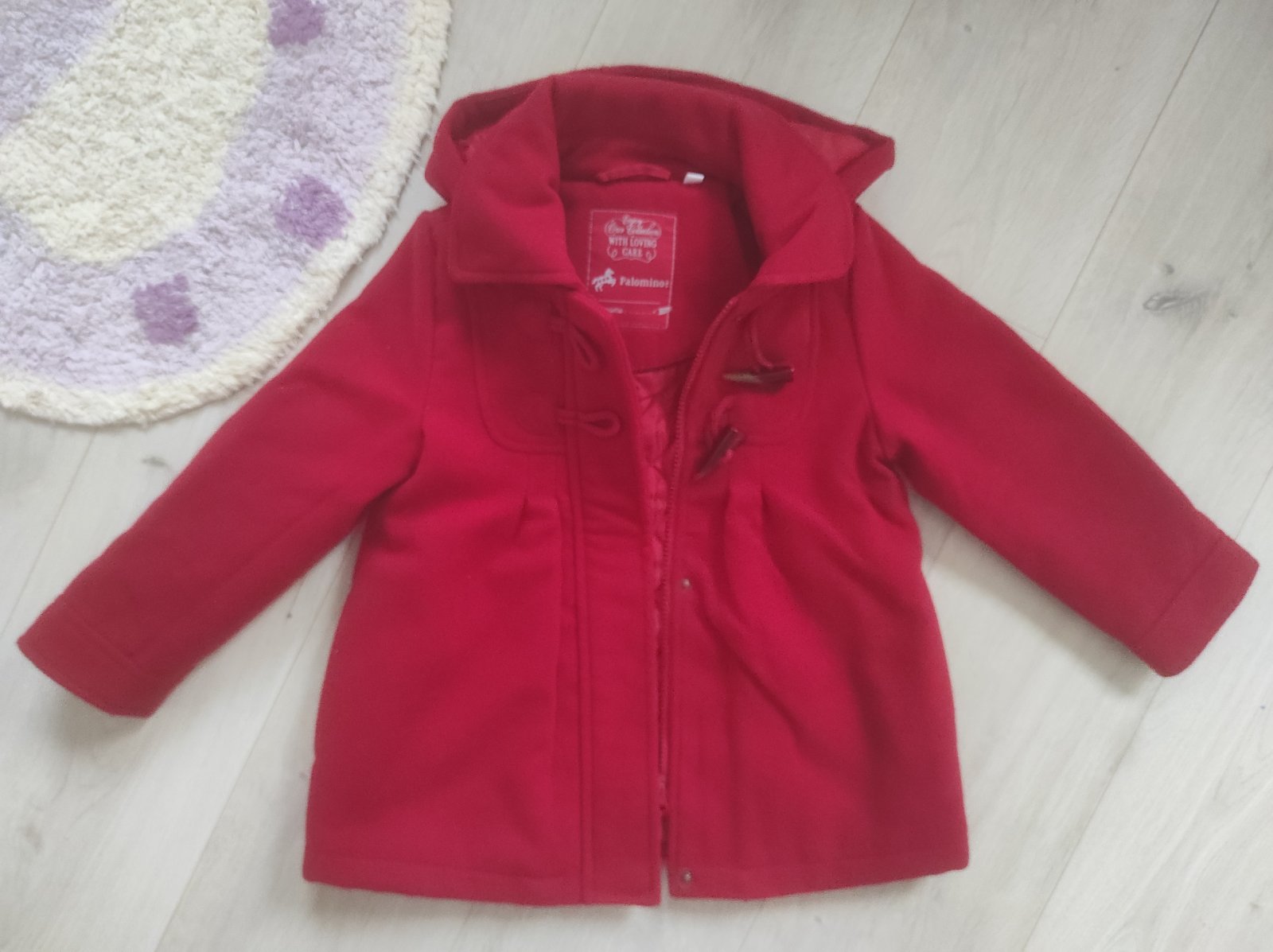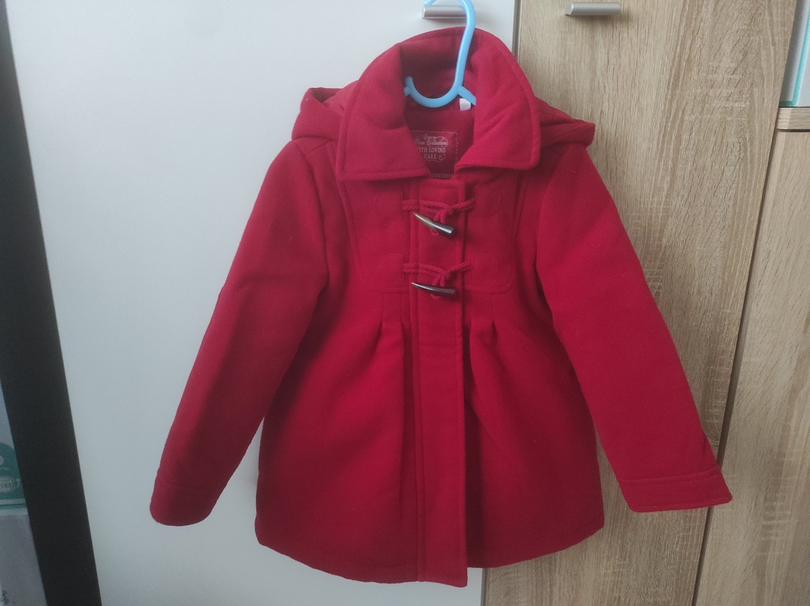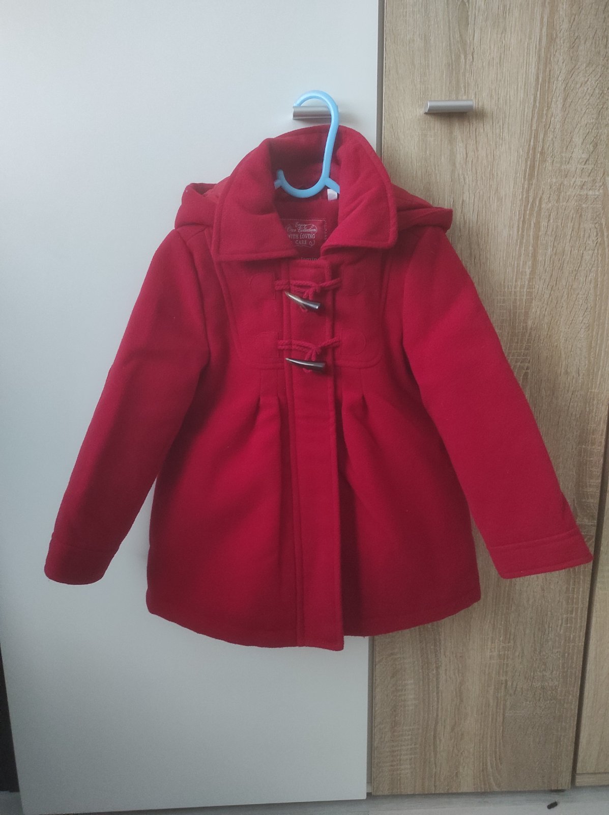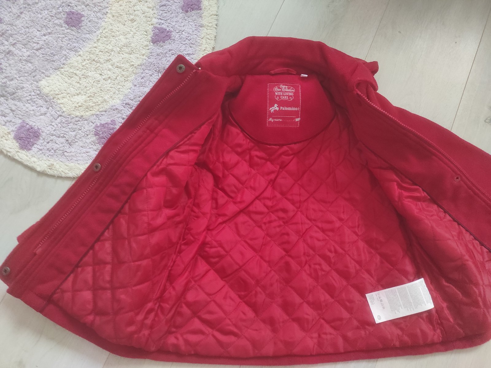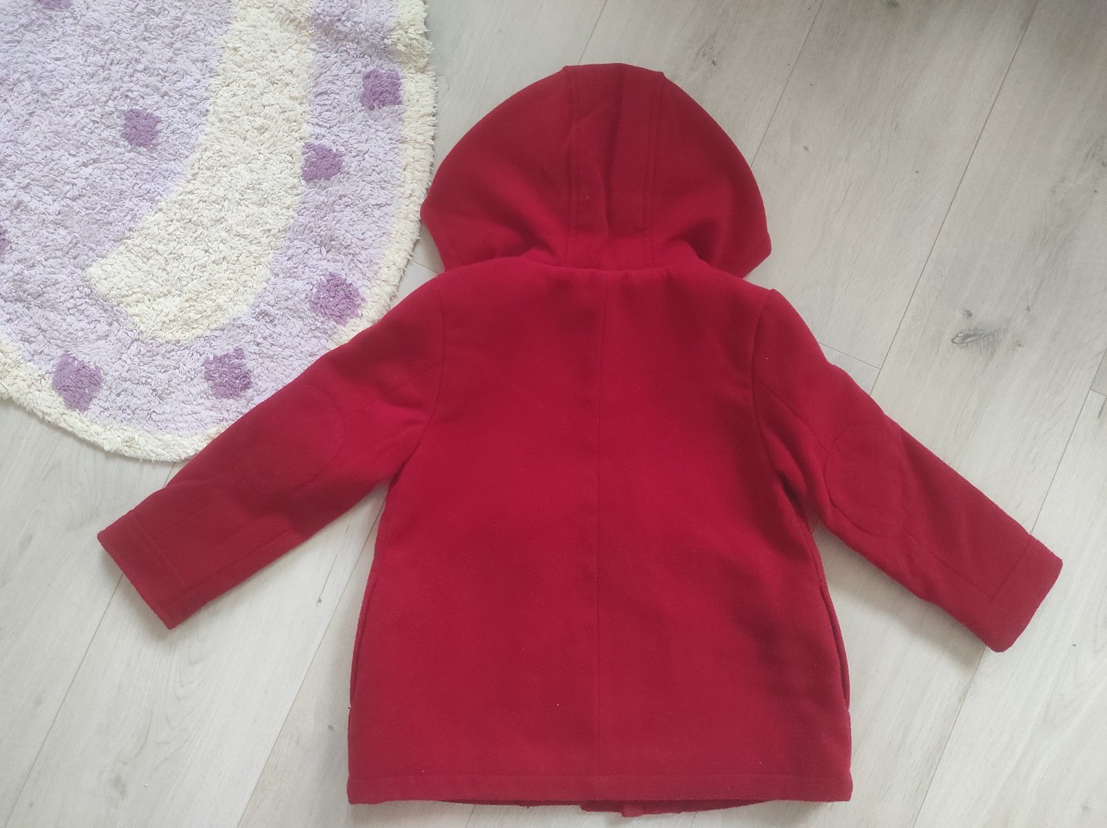 Krásny červený kabát. Minimálne noseny. Výborný stav. Kapucňa napevno. Jemne futrovany. Záplaty na lakťoch.