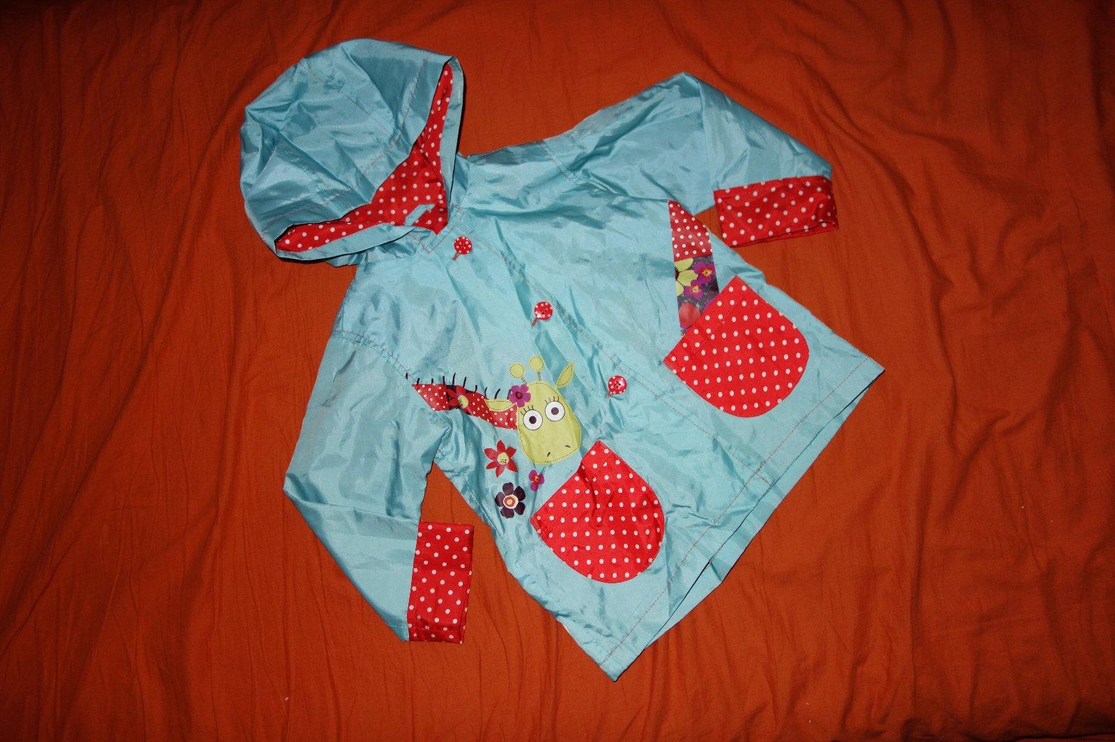 Krasna sustakova bundicka so zirafkou vo velmi dobrom stave- nazehlovacka zirafky je malicko popukana, na rukaviku (na zostiti) ma malinku dierku. Je tenka, len podsita.