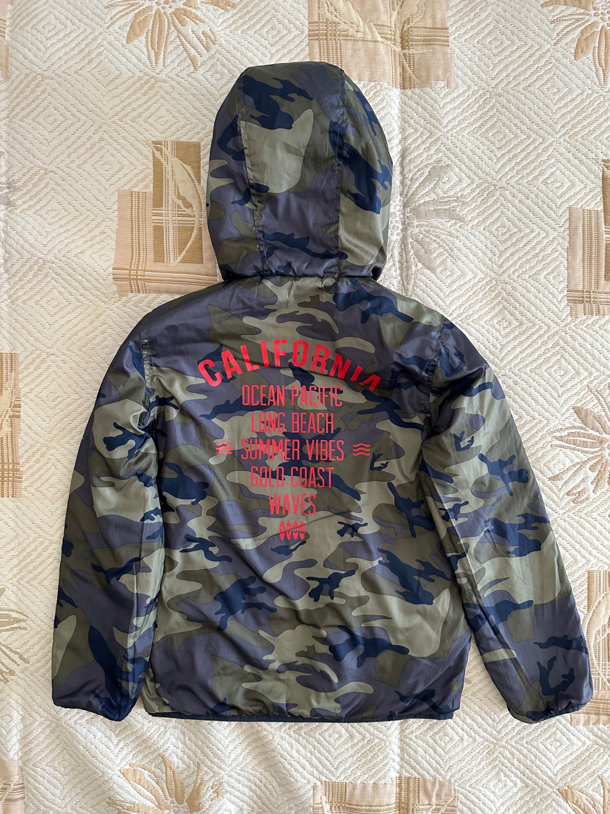 Krásna obojstranná bunda vo veľmi dobrom stave. Rozmery a drobný fliačik na rukáve nafotené.