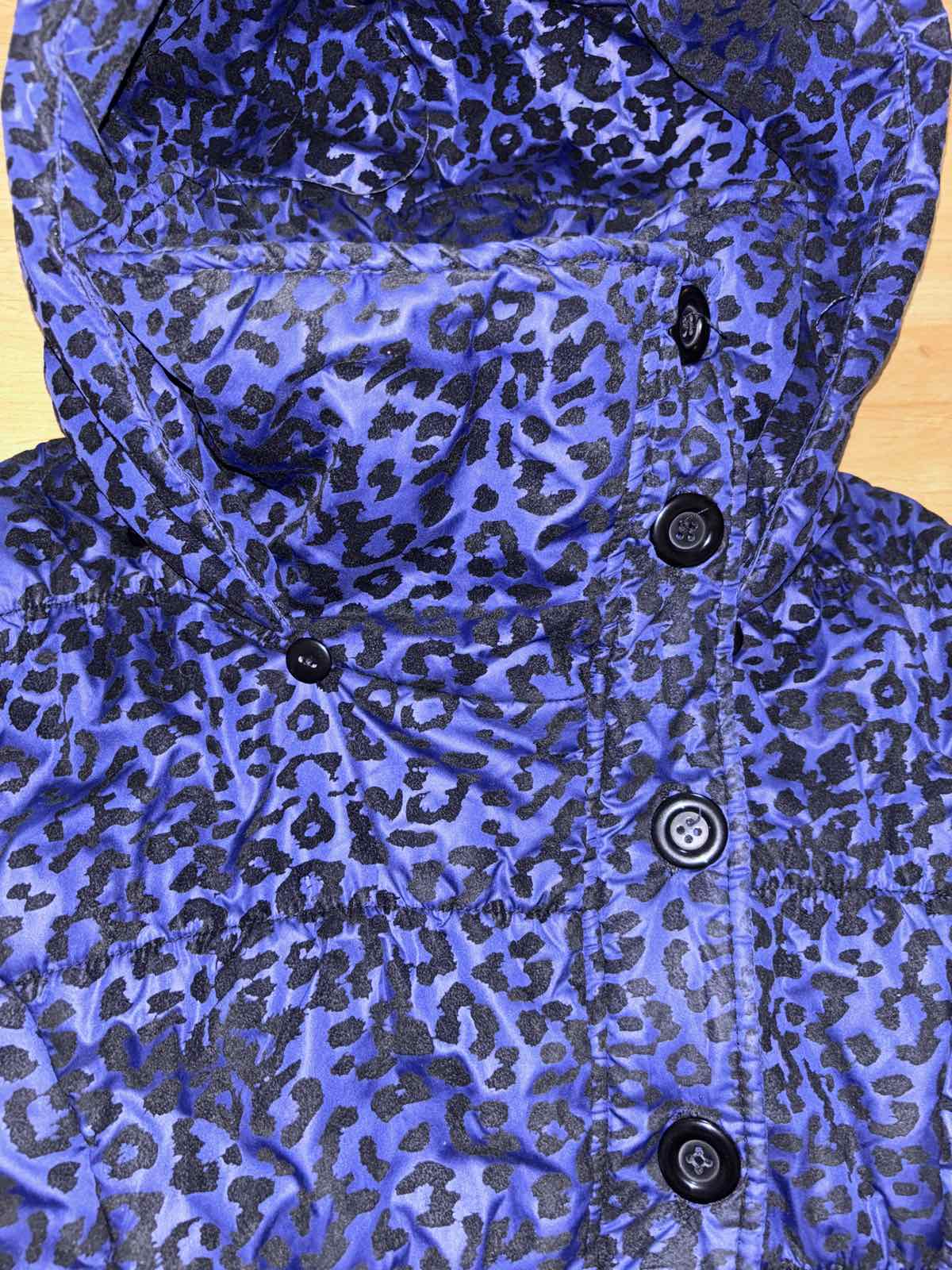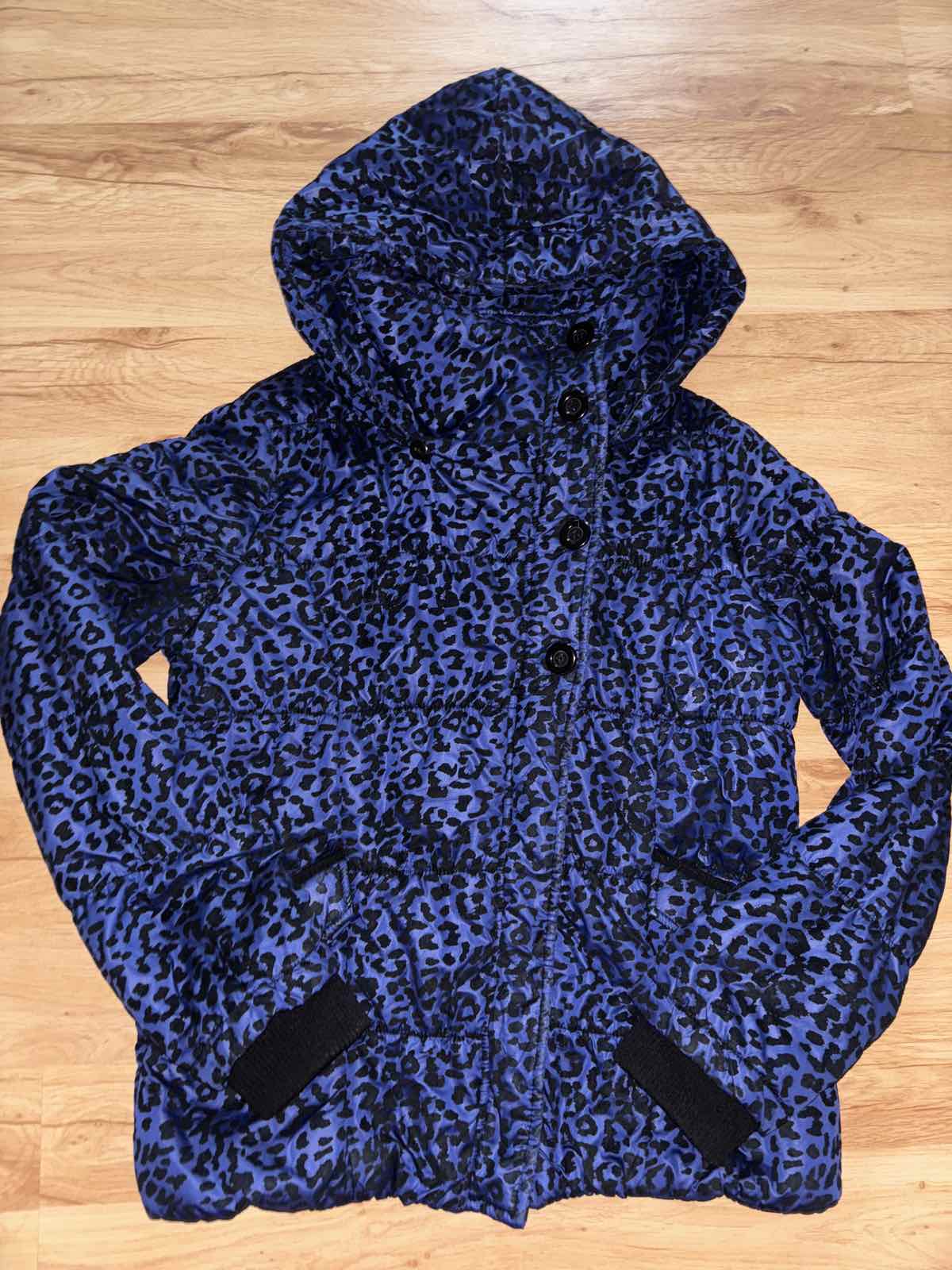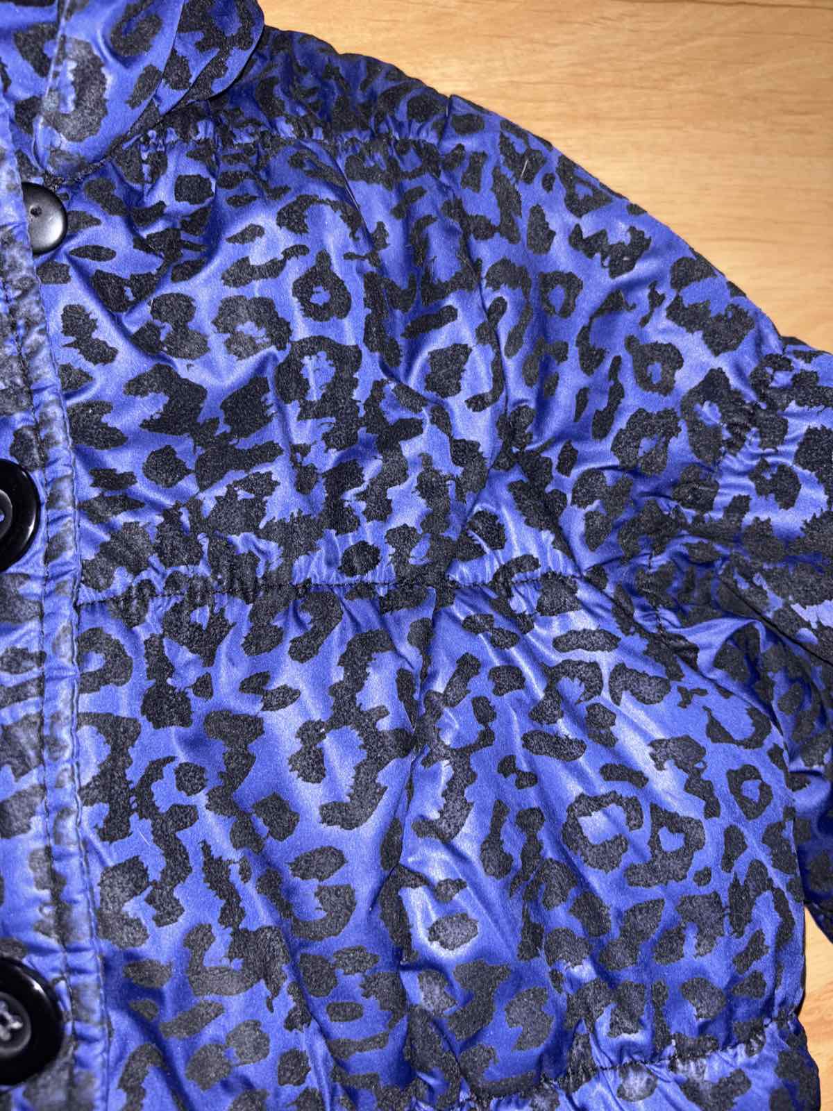 Veľmi dobrý stav, je slabšie vatovana, skôr prechodná, fialovo-modrá s čiernym zamatovým vzorom, v časti patentov a na vreckách je potlač slabšia, zips+gombíky, veľkosť M, šírka pod pazuchami 54-58 cm, dĺžka 65 cm
