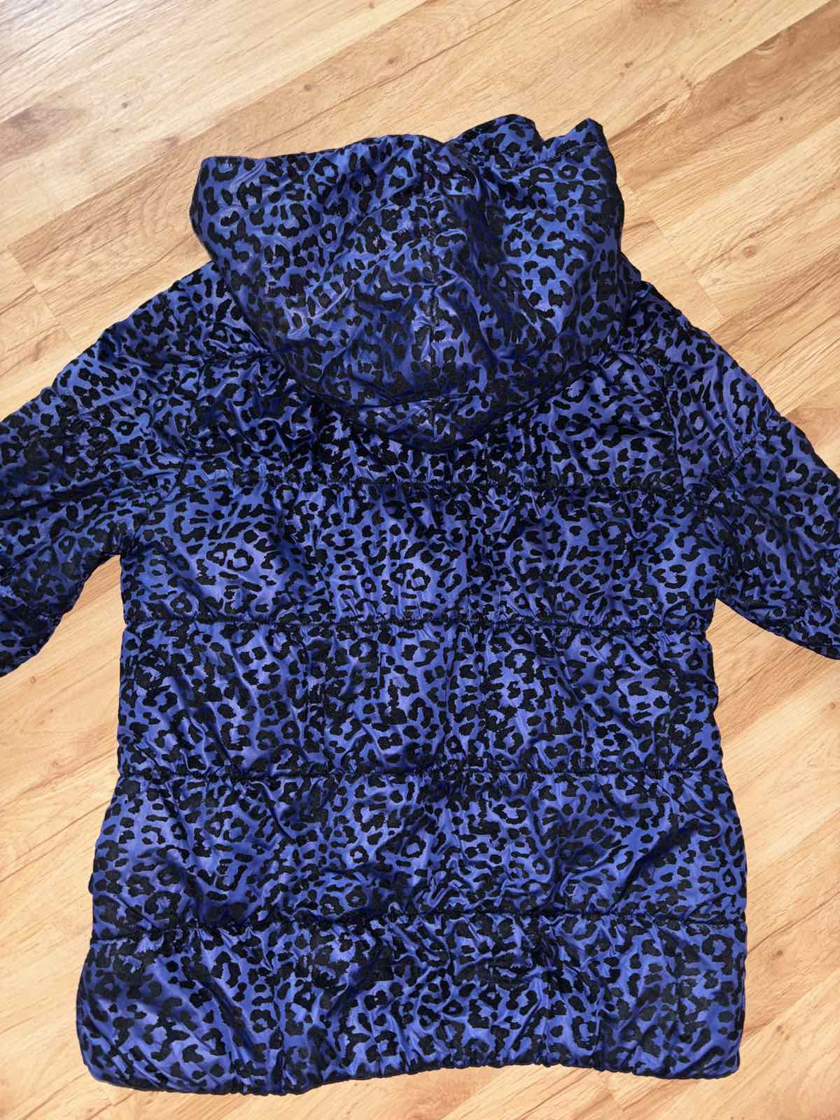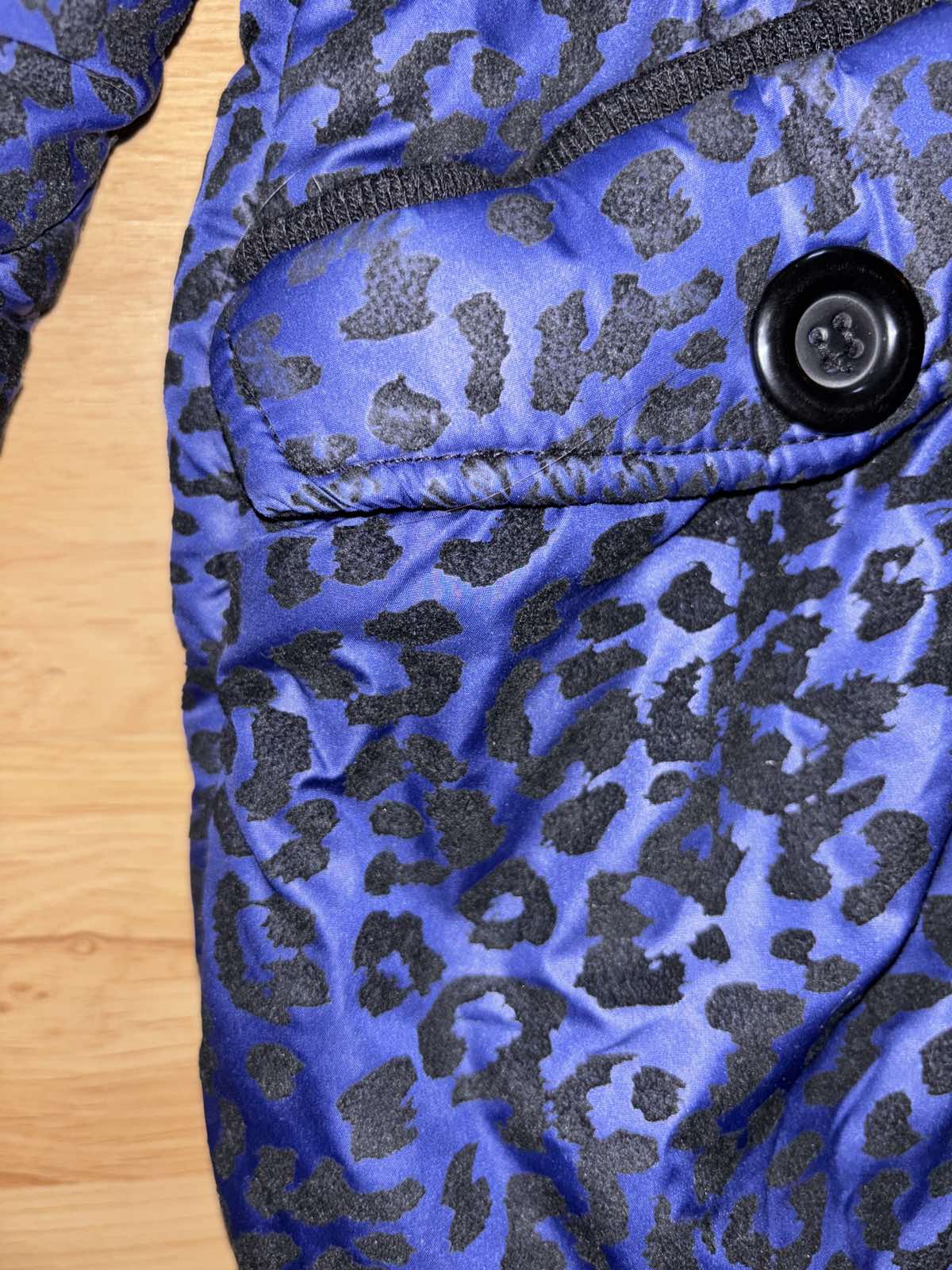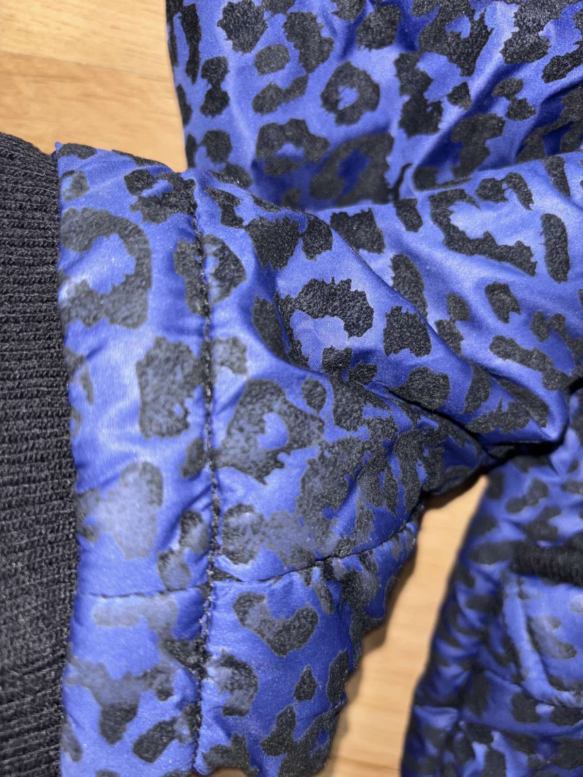 Veľmi dobrý stav, je slabšie vatovana, skôr prechodná, fialovo-modrá s čiernym zamatovým vzorom, v časti patentov a na vreckách je potlač slabšia, zips+gombíky, veľkosť M, šírka pod pazuchami 54-58 cm, dĺžka 65 cm