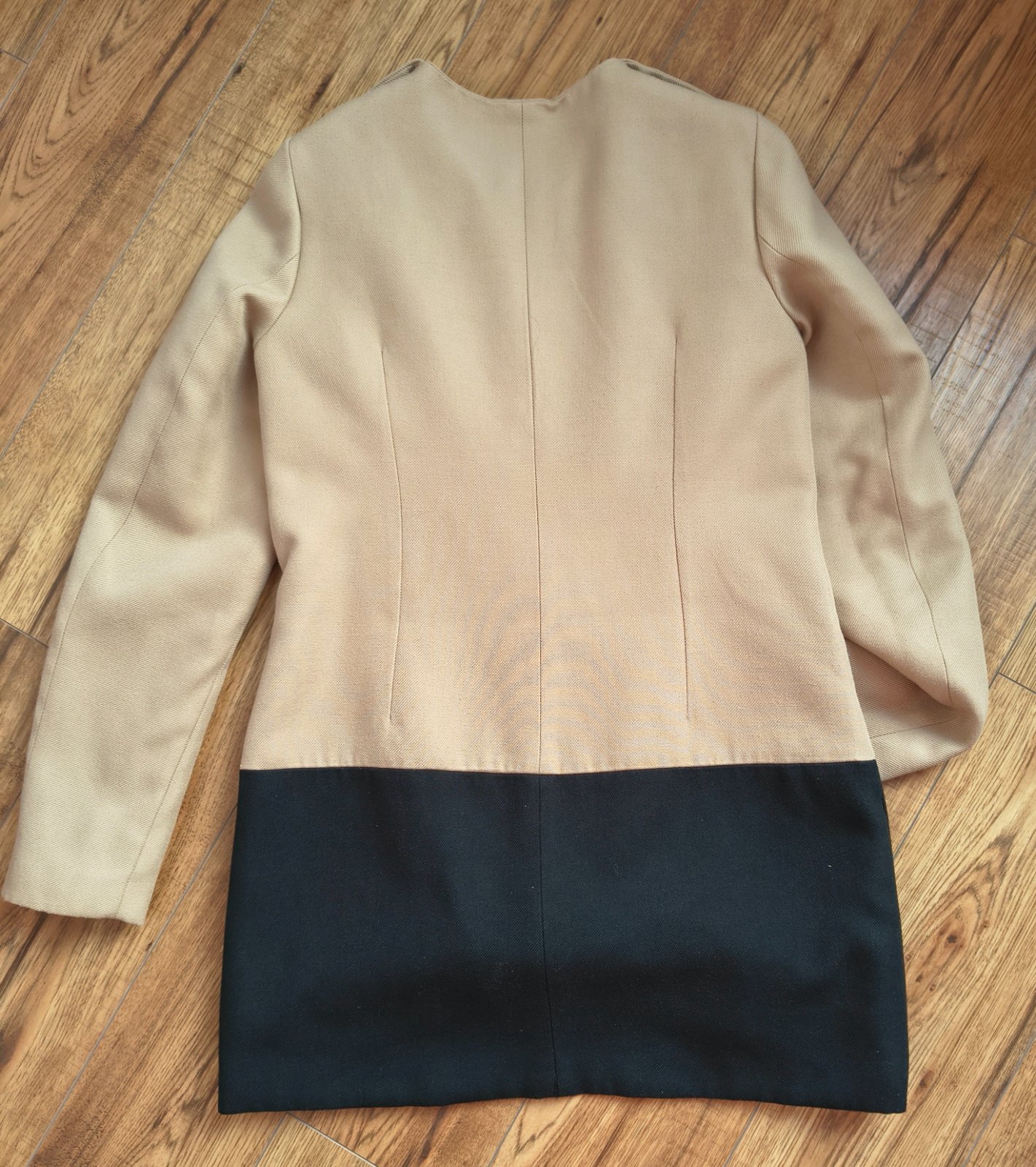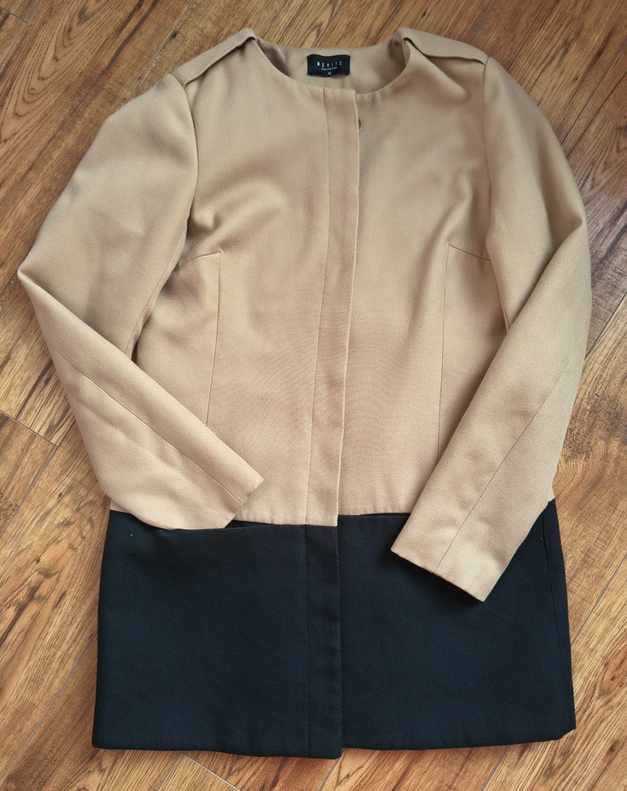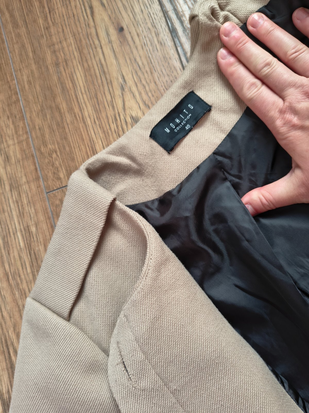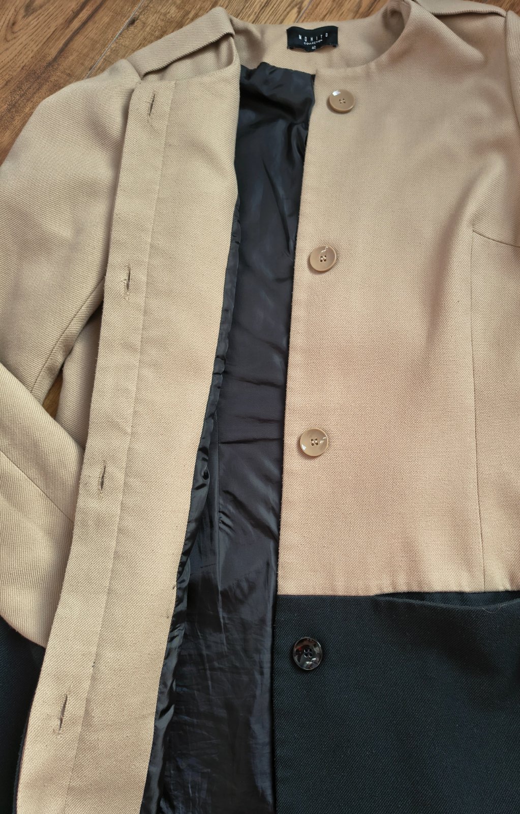 Krásny, ležérny Mohoti kabatík s podšivkov, sedí na M/menšie L, béžový vrch a čierny spodok s vreckami, skryté gombíky, pohodlný a vkusný kúsok k nohaviciam. Top stav, kde tu som si všimla žmolček na béžovej látke.