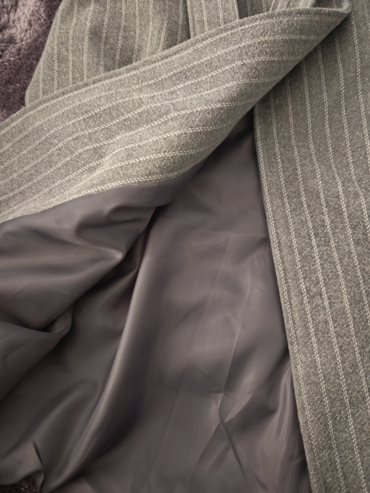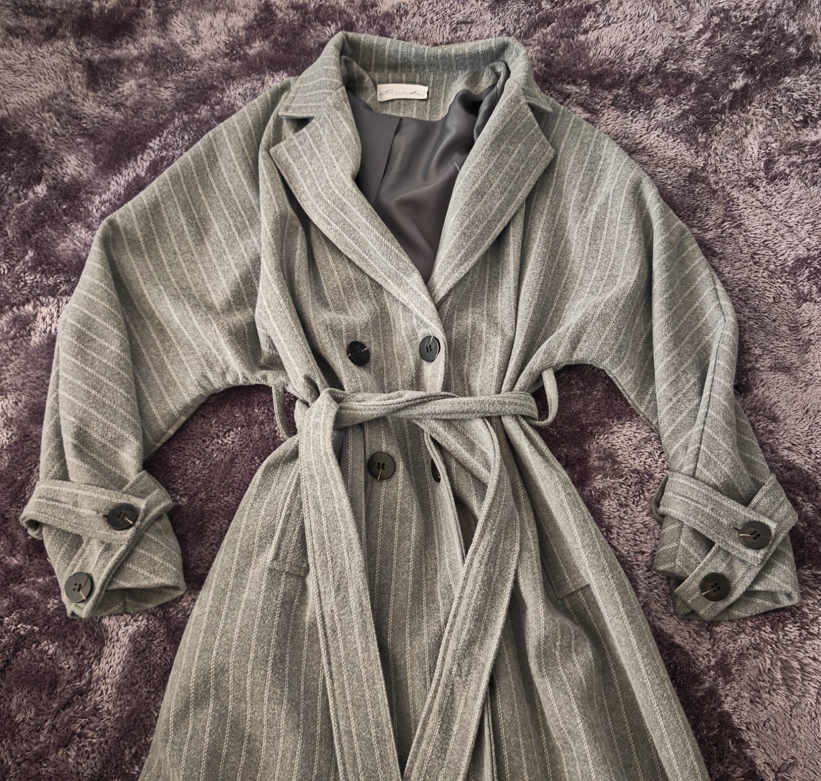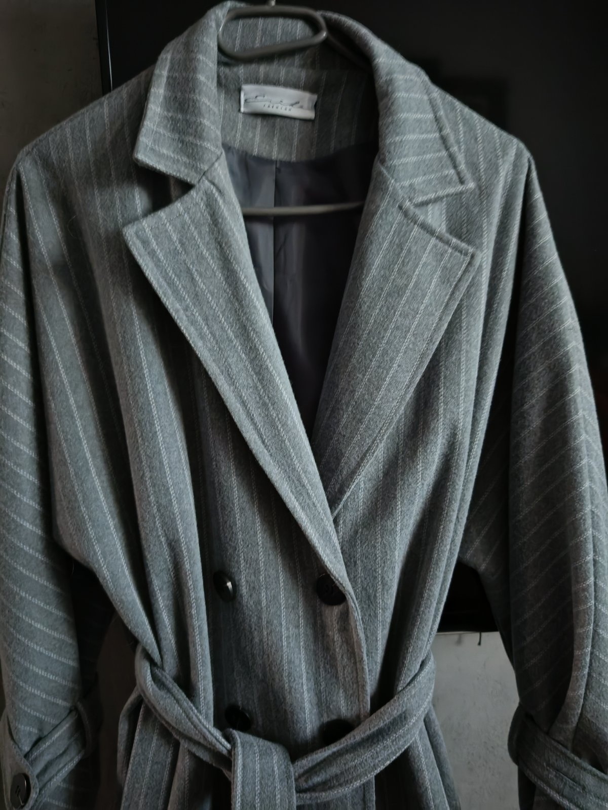 Krasny sivy pasik tensi kabatik.tak na prechod,je jemne poddajny,ako novy,velkost je oversize-max po mensie XL-ko,pekny kusok,povodna cena cca 70e,kupovany v Erika fashion