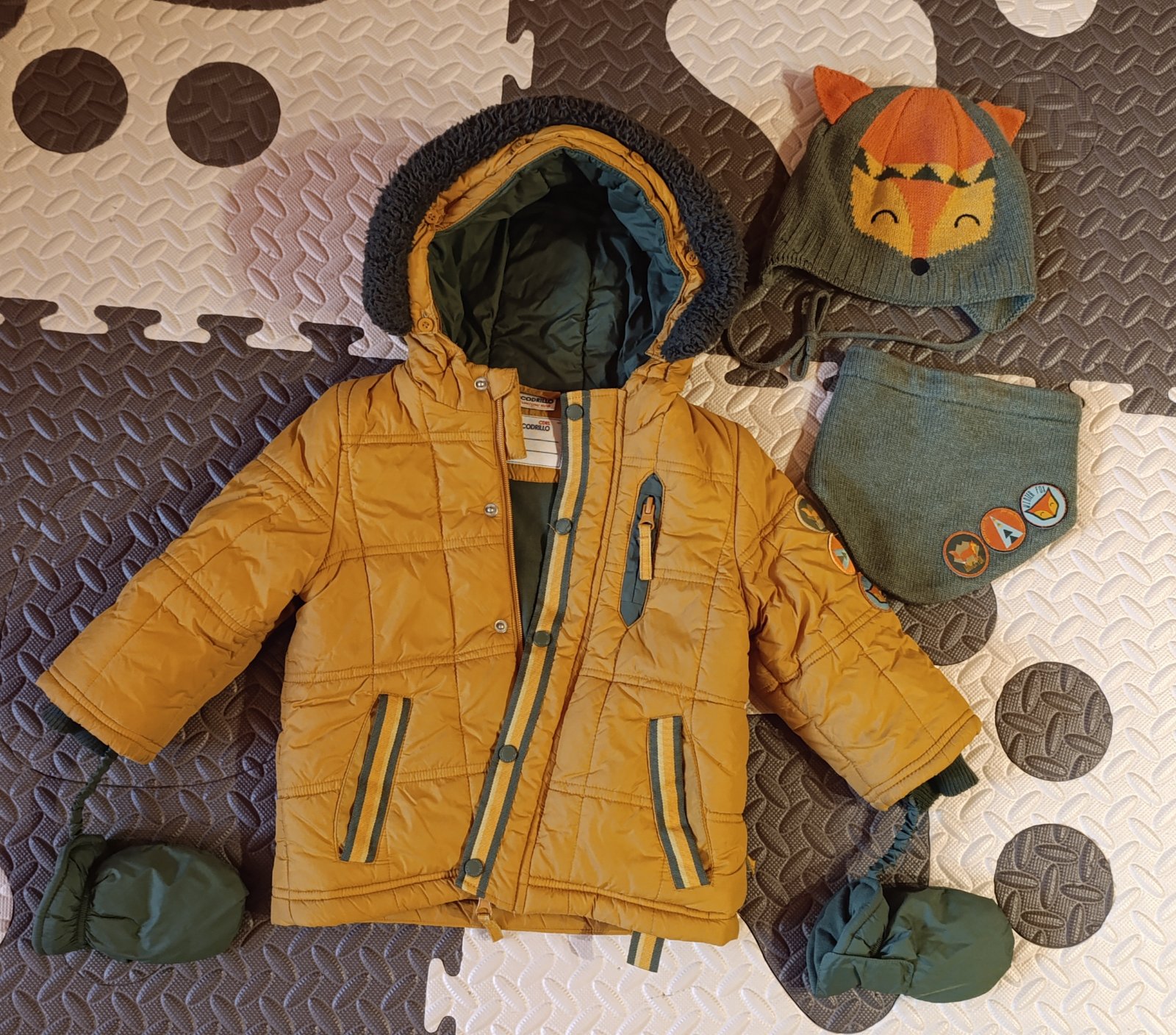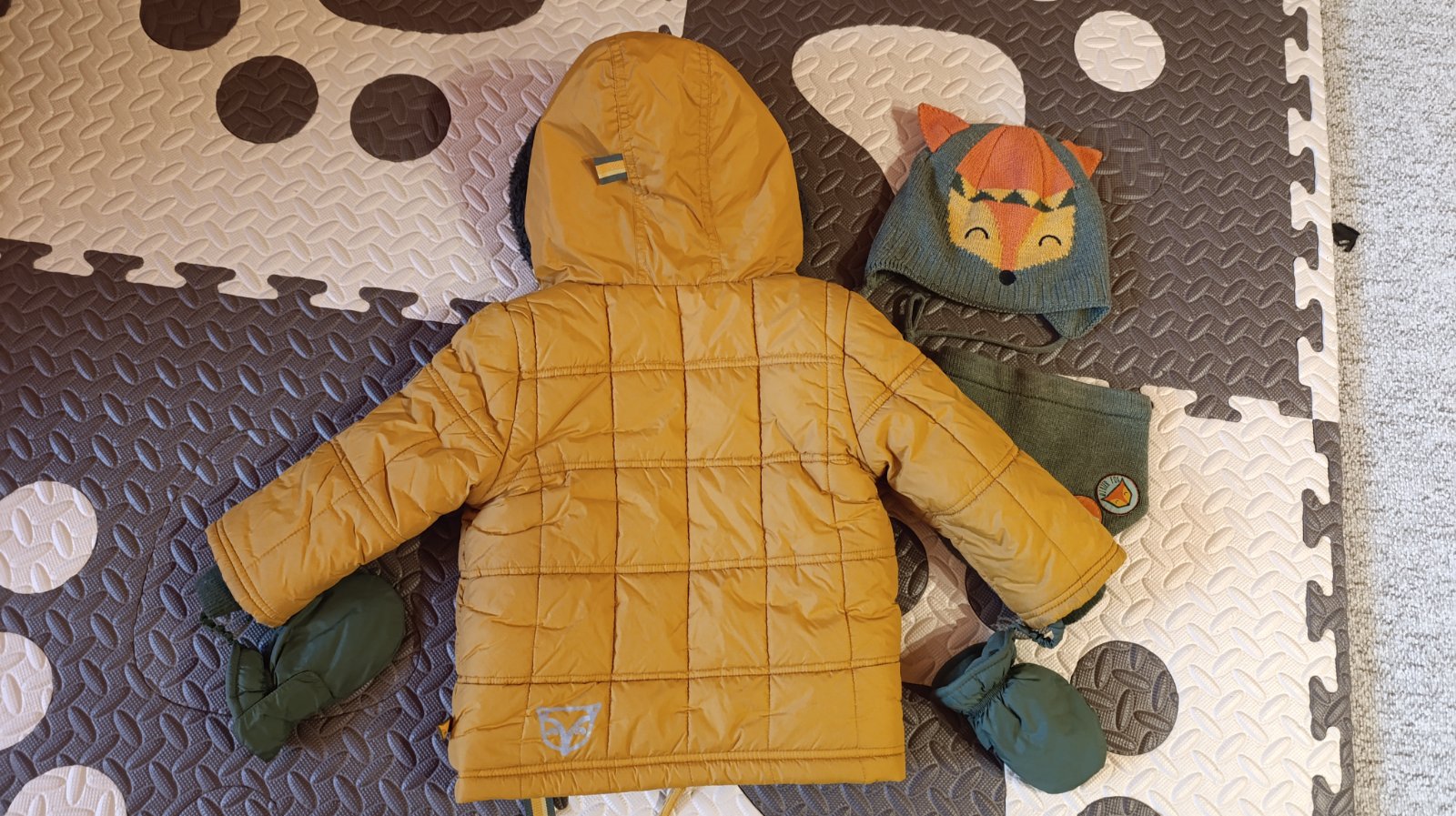 Veľmi zachovalá hrubá vetrovka s rukavicami ktoré sa dajú pripnúť/odopnúť. Pribalím k tomu set čiapka a šál tiež Mayoral.