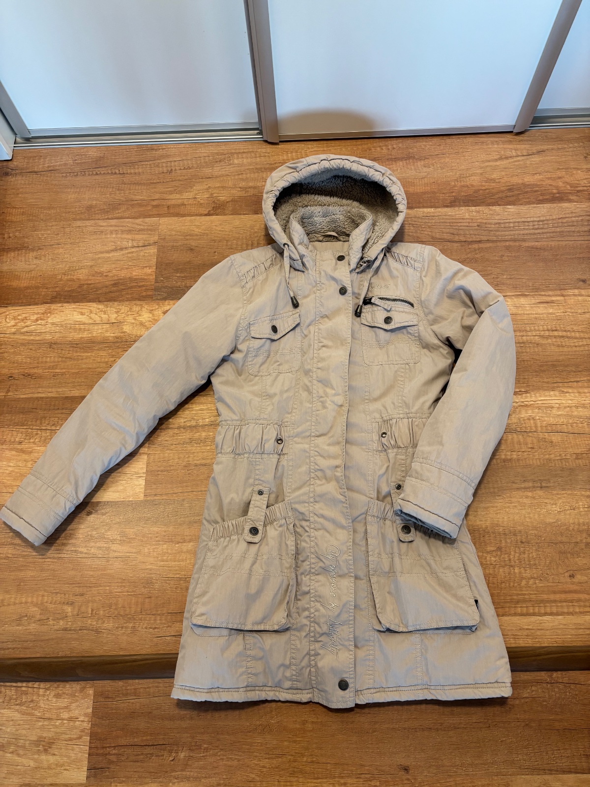Málo nosená zimná vetrovka podšitá teplým materiálom. Dala som si na nej odšiť predné vrecká, lebo odstávali. Nenašla som žiadne poškodenia. Podľa potreby premeriam.