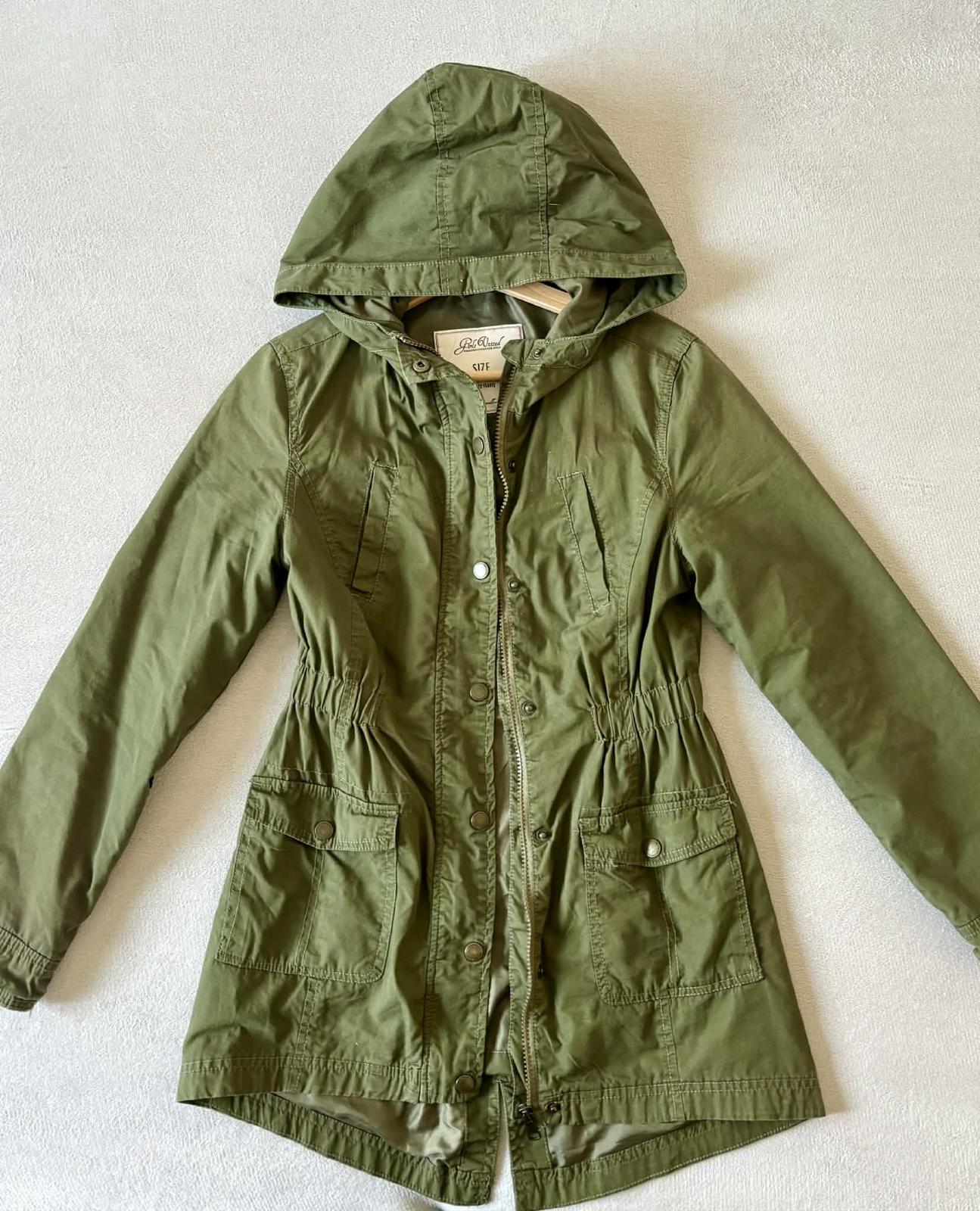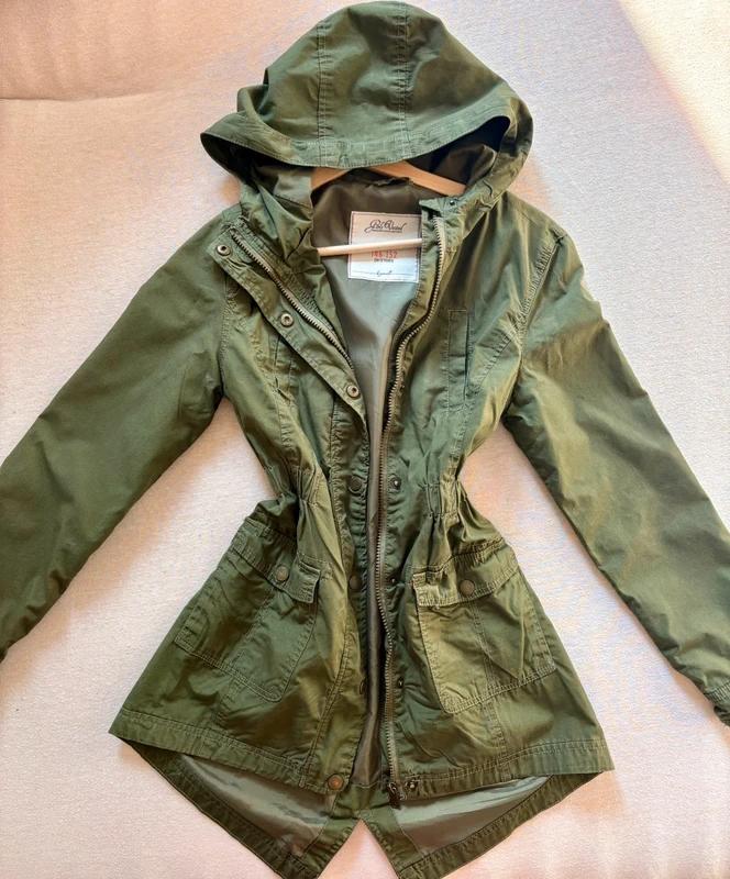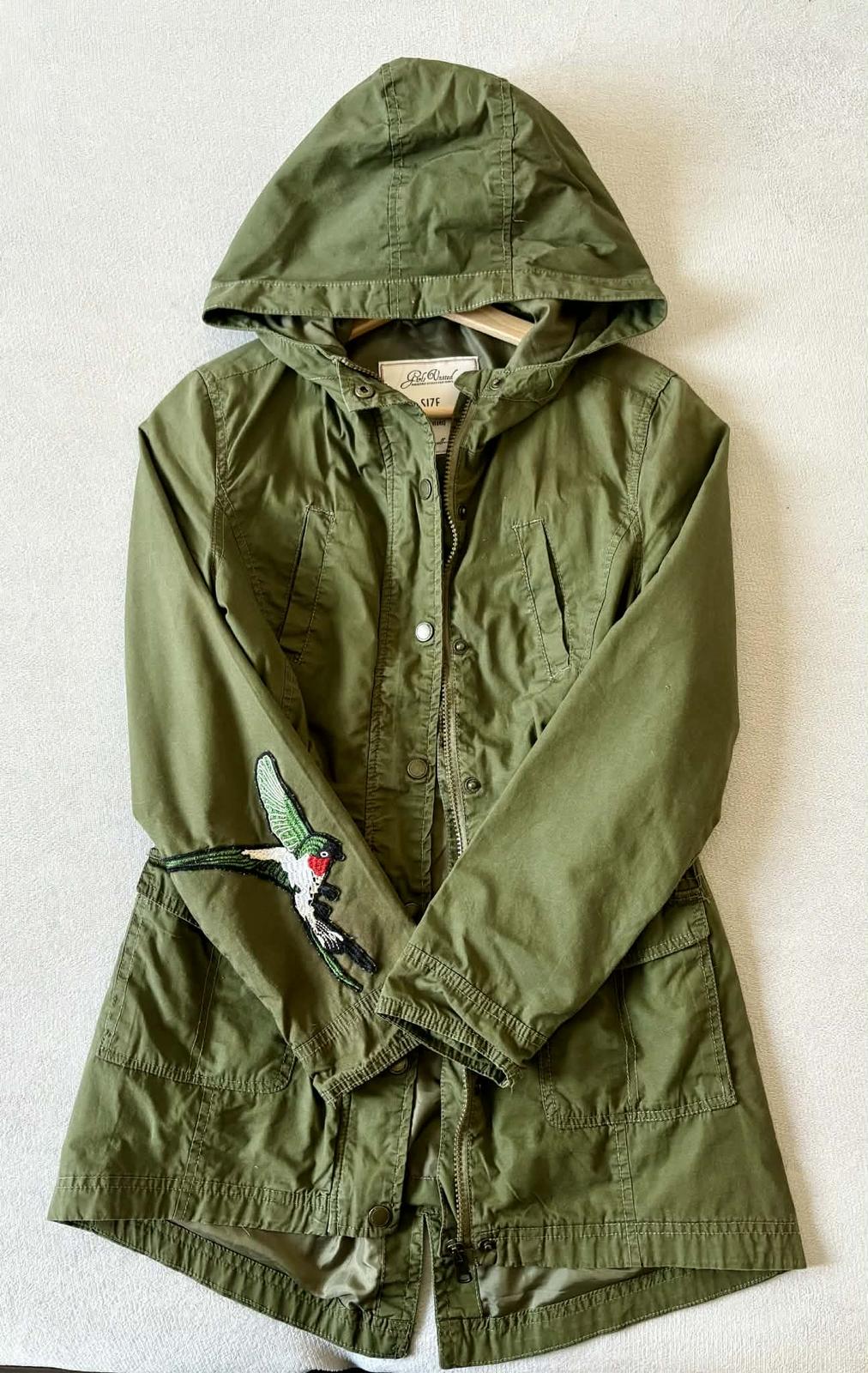 Štýlová olivovo-zelená parka s kapucňou a krásnou výšivkou kolibríka na rukáve. Bunda má praktické vrecká, zapínanie na zips aj cvoky a mierne stiahnutý pás, vďaka čomu pekne tvaruje postavu. Materiál je ľahký, príjemný a ideálny na jar alebo jeseň.