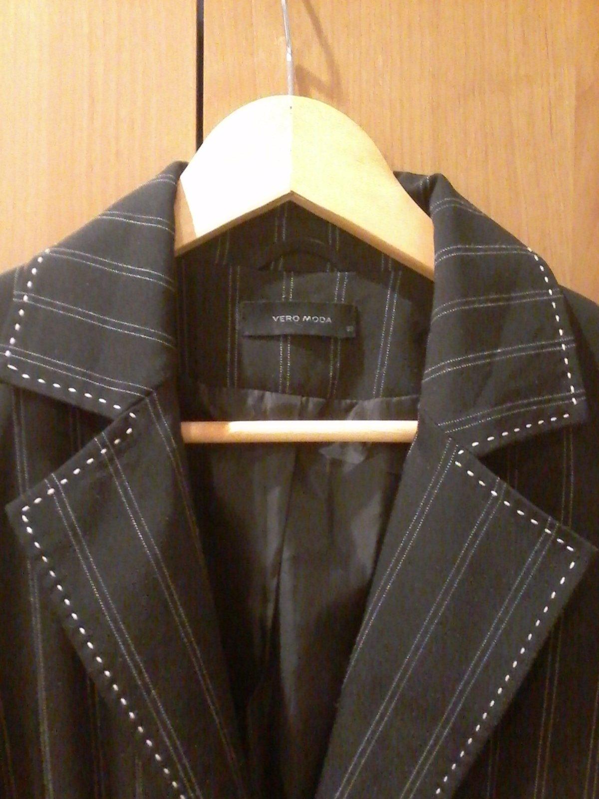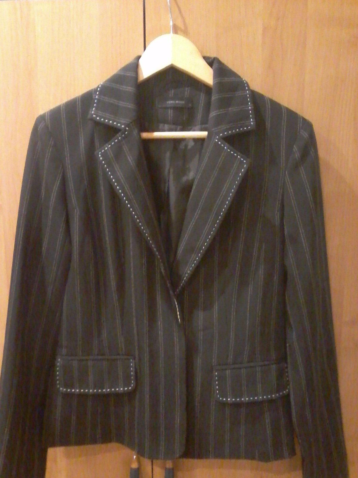 Dámske sako čiernej farby s bielymi pásmi a bielym štepovaným lemom, M-L, veľmi elegantné a krásne tvaruje postavu, podšité, prsia 2×46cm, dĺžka 63cm, rukáv 62cm...