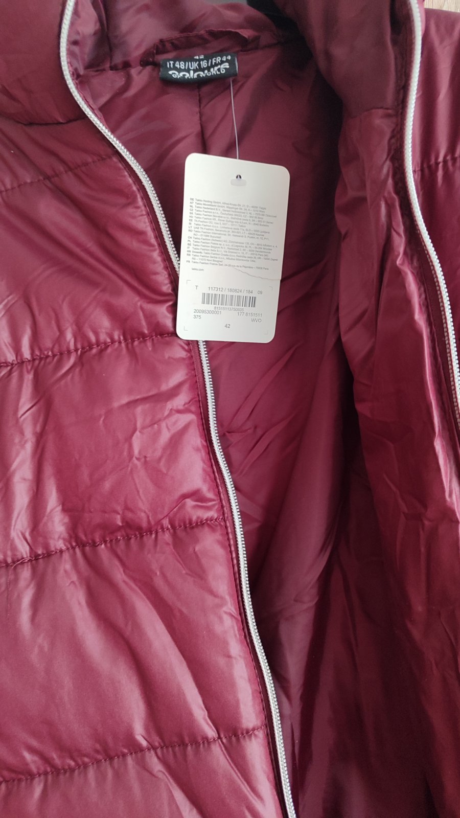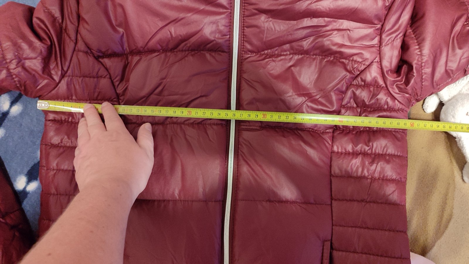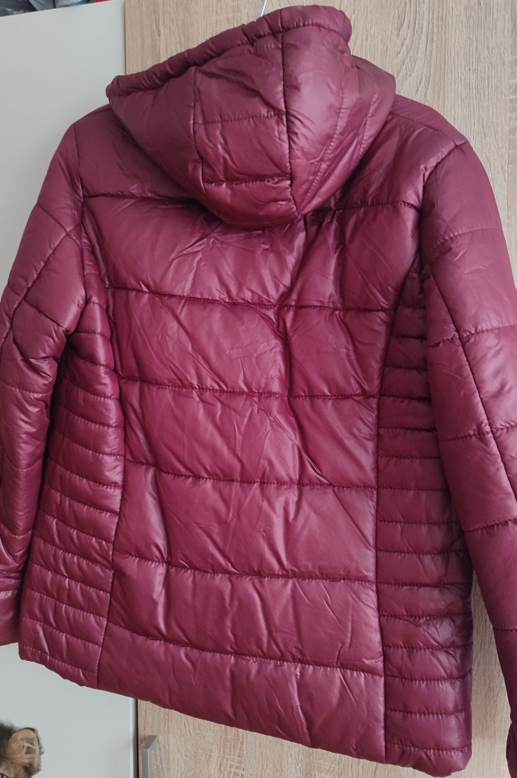 Bordová bunda Colours velk. 42. Šírka dolu maximálne 2 x 59 cm. Rukáv 64 cm + 11 cm rameno. Dlžka 69 cm, šírka cez prsia 2 x 52 cm, šírka pás 2 x 49 cm.