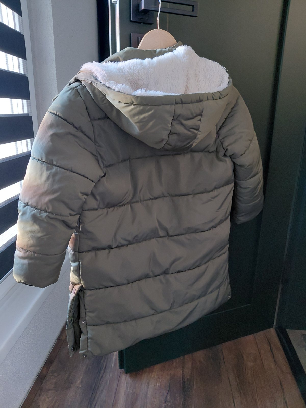 Tepla zimna dievcenska bunda zn.Alive, vel.128. Dlhsi strih, zadna cast predlzena, vnutro kozusinkove, na lemoch na rukavoch je reflexny pasik + vsite patenty. Snurky na pase nie su funkcne (nedaju...