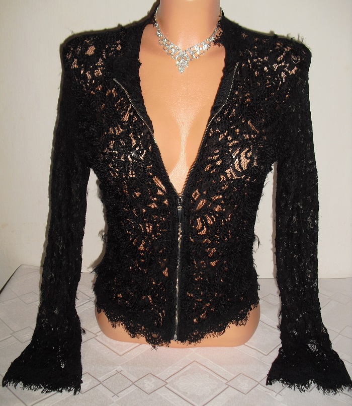 predam nadherny krajkovany znackovy kabatik sackovy, na predu sa zapina na zips, dobry stav, velkost uvedena 36/s. sirka 45 cm x 2, dlzka cca 52 cm. nosi sa kratsie ako bolerkovy. na poprsi sa da regulovat zapinanim.