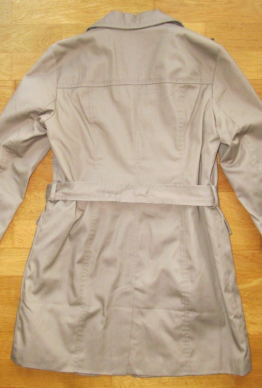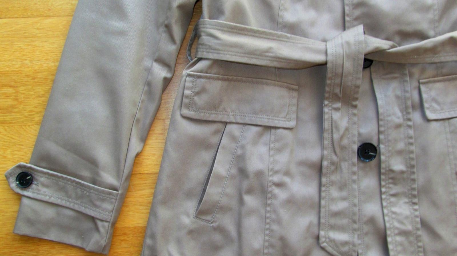 Krasne prepracovany prechodny kabat Vero moda, trenčkot, celý podšitý, s fazónou a 2 hlbokými vreckami, vzadu vstrede rozparok, zvonka kvalitný pevný materiál, nie šuštiak (80p. polyester, 20p. bavlna). S visačkou. Prieramok 12, rukav 63,5 cm, dlzka od pleca cca 83, sirka v oblasti pasa merana zvonka cca 48 cm (stiahnete opaskom). Odporucam