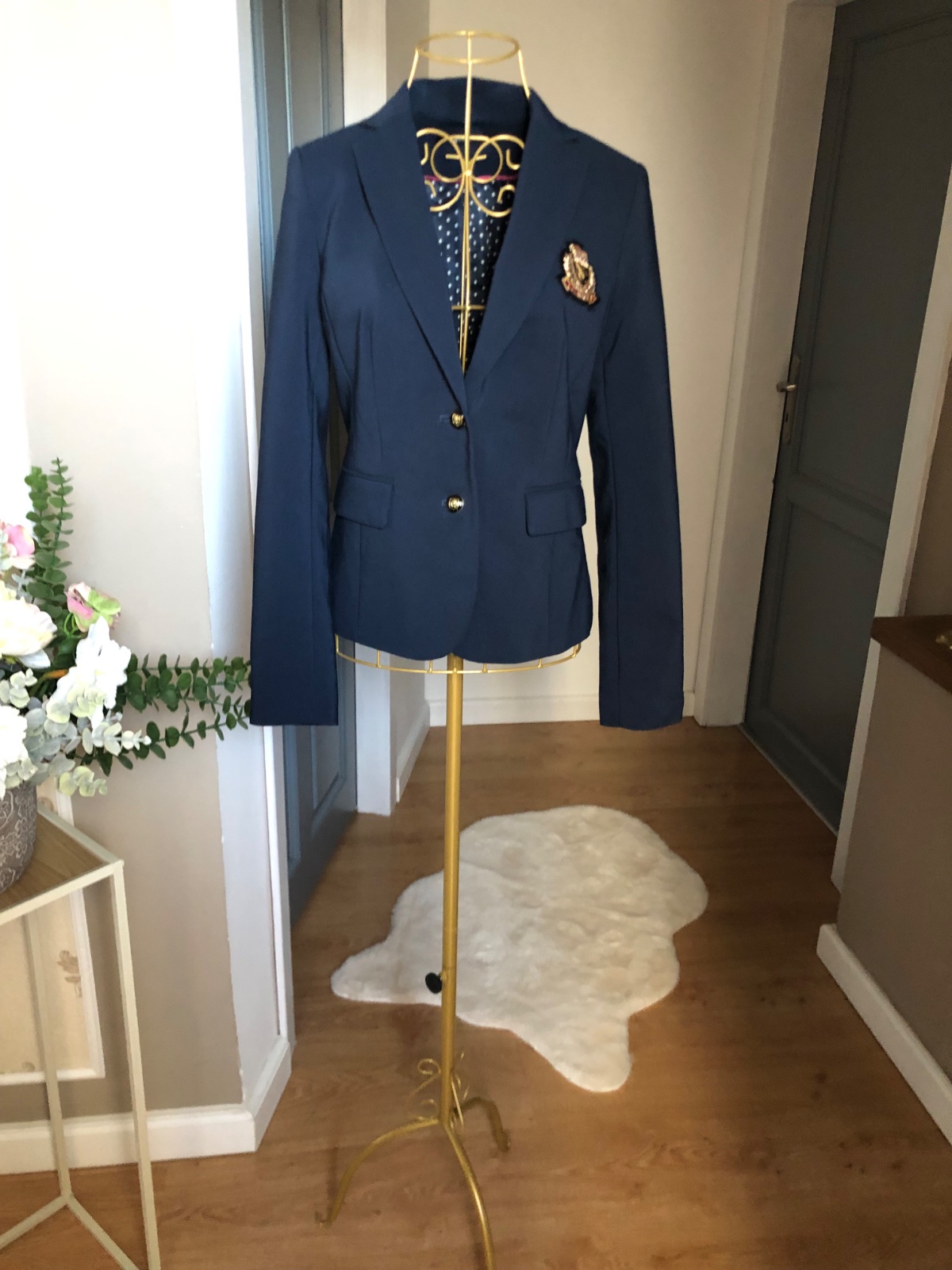 Luxusne tmavomodré sako s krásnym erbom, podšité, vypracované, super stav.