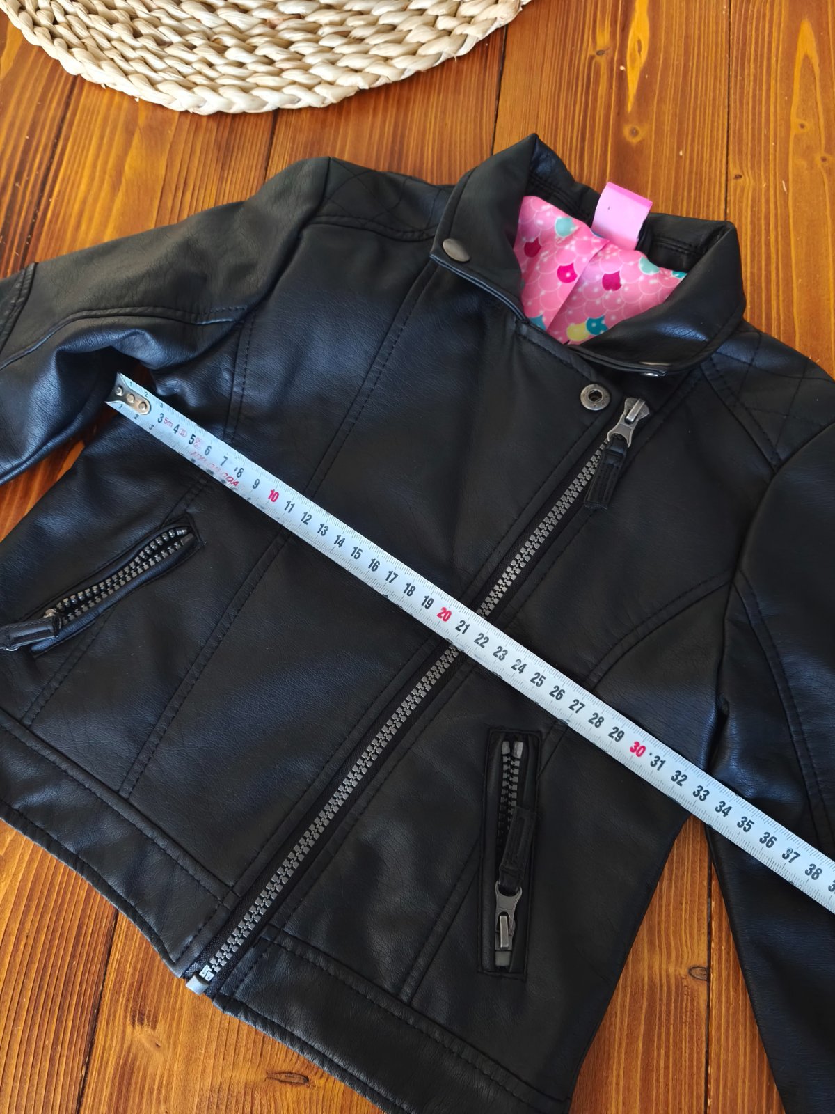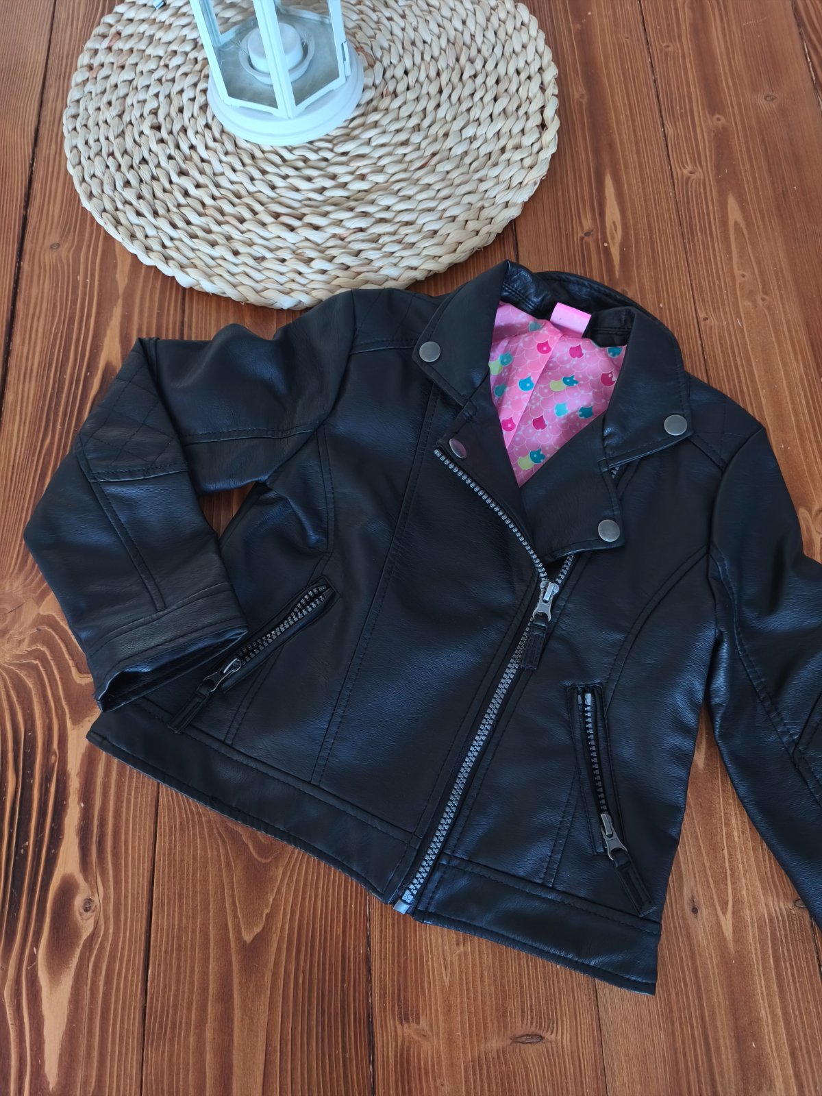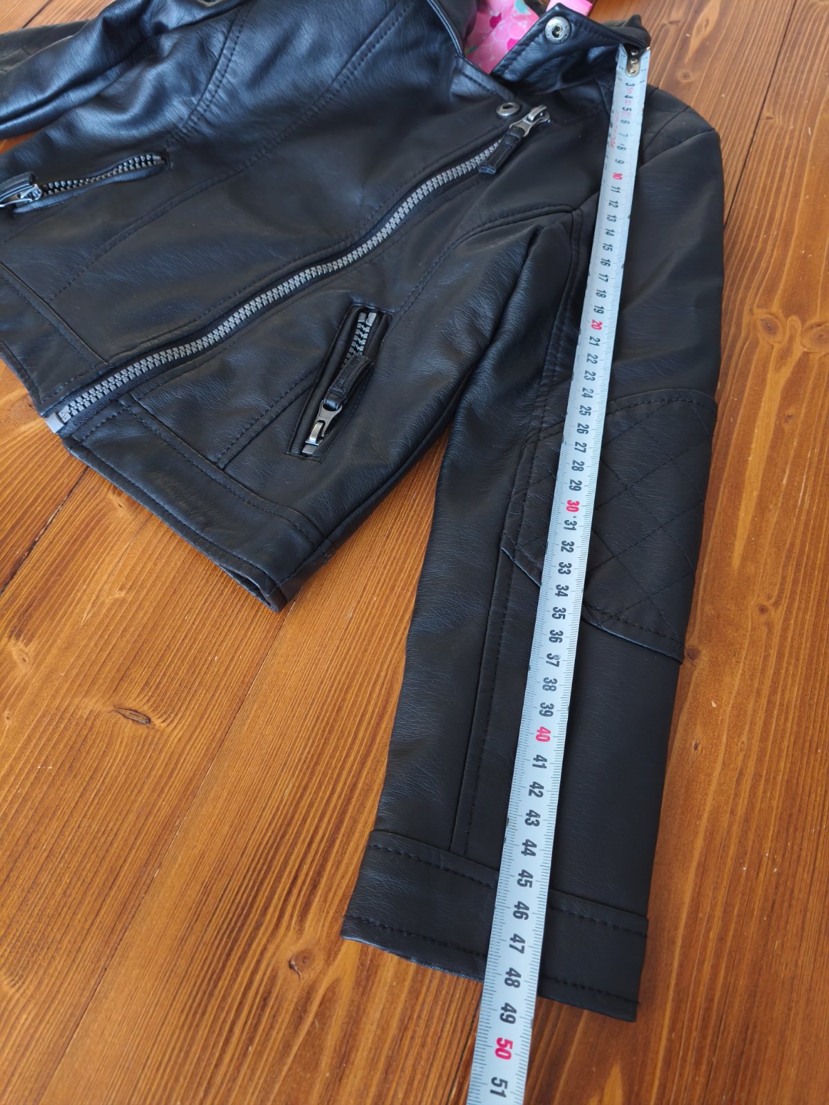 Motorkarsky štýl. Bez poškodení, nikde nepuka/neolupuje sa. Dĺžka 39 CM Šírka 34 CM Rukáv od ramena 42 CM. V ponuke mám aj čižmy veľkosť 32(pridávam k nim darček ružové pančuchy veľkosť 7-8 rokov 1...