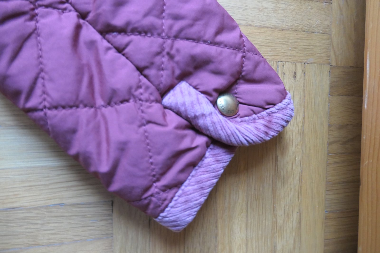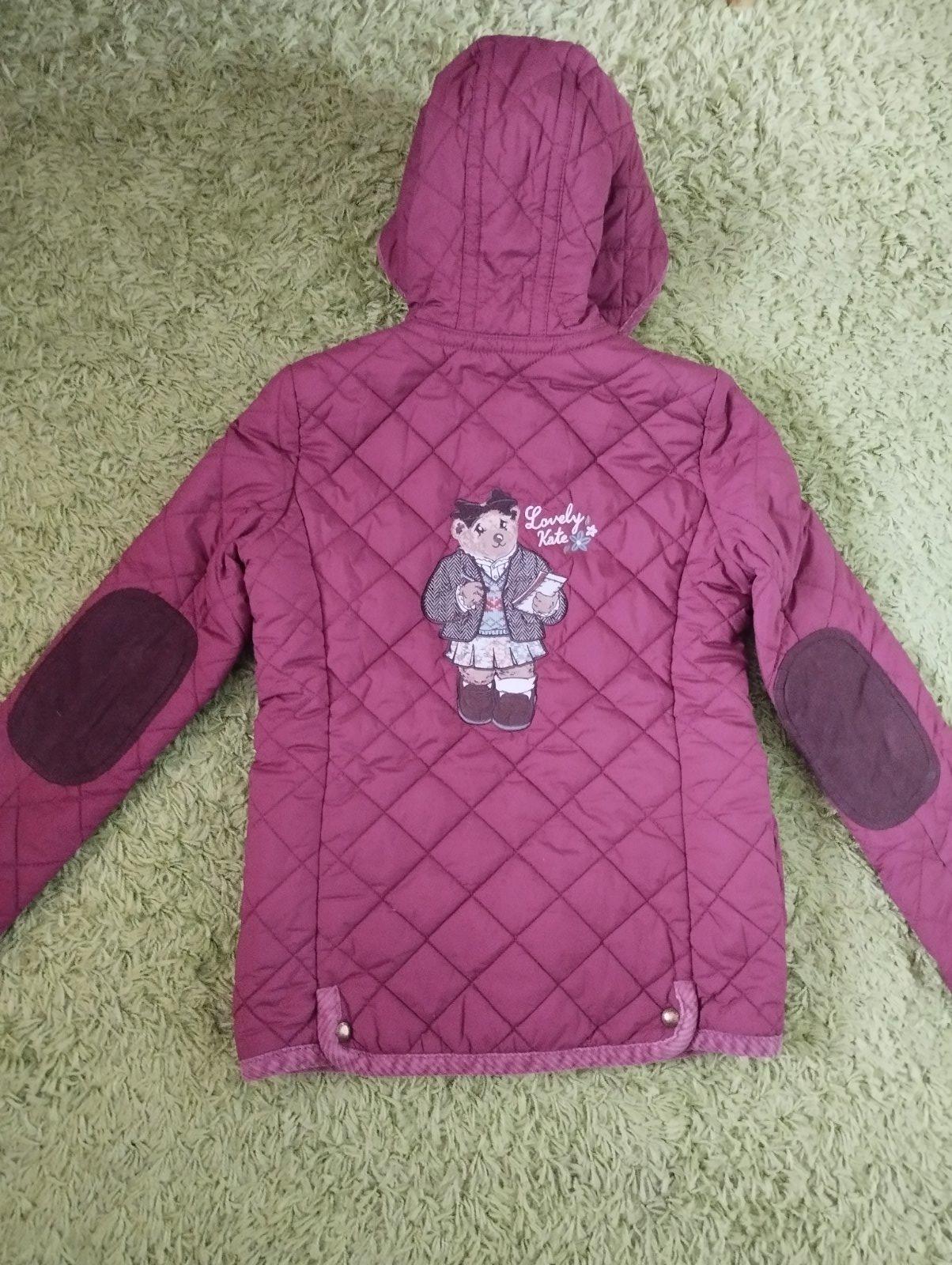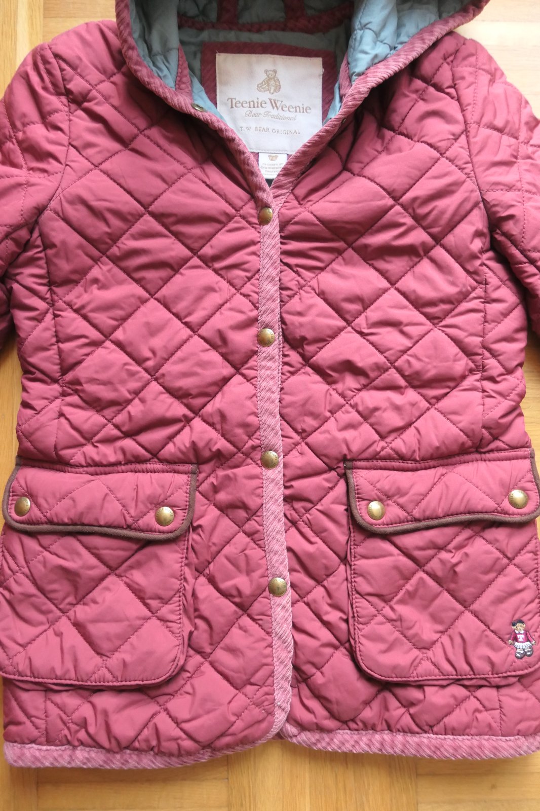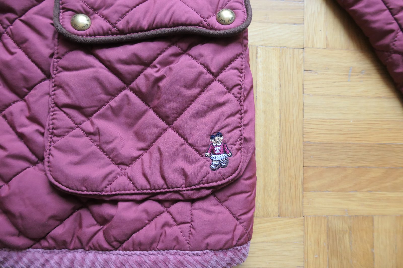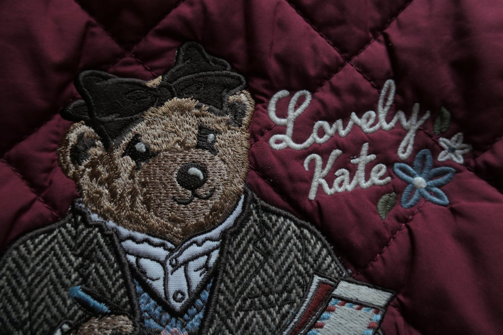 top stav, krasna damska presivana bundicka v bordovej farbe, aplikacia medvedice vysivana na vrecku vpredu, vzadu na chrbte velka medvedica Kate, nadherna, detailne vypracovana, jedinecna, bez chyby