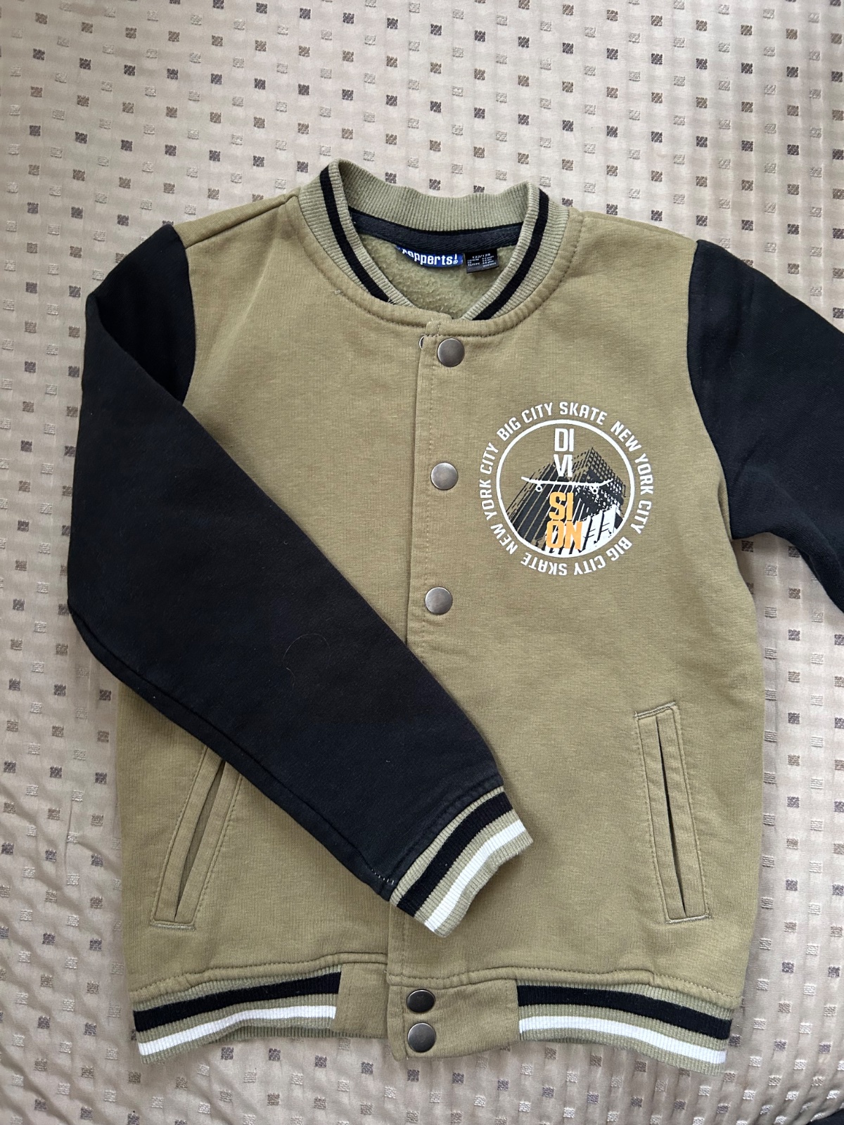 Riflova bunda s teplakovymi rukávmi, zapínanie na gombíky veľkosť 122/128, pár krát oblečená