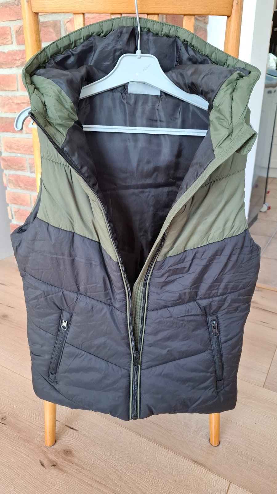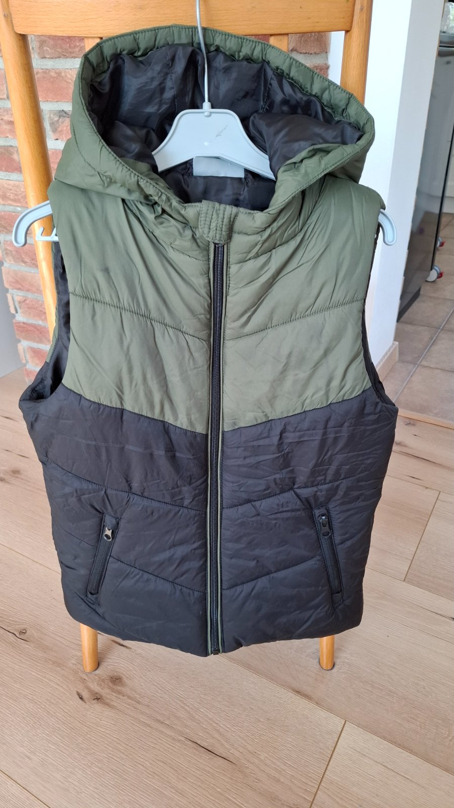 Vesta s vreckami, tepla, vpredu aj vzadu vrecka, vnútri šnúrka na stiahnutie. Minimálne nosena.