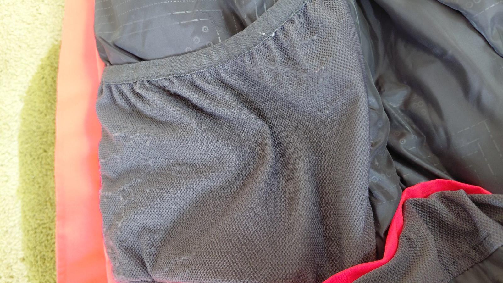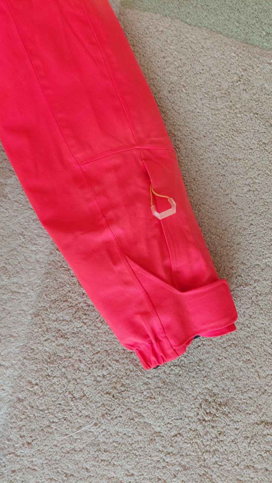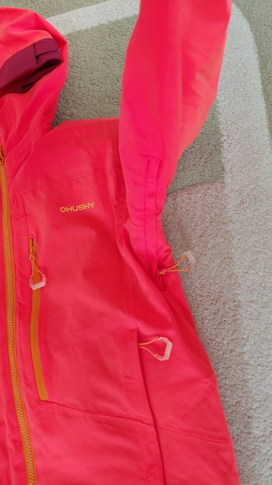 Jediné chybičky čo som našla sú malý fliačik na zadnej časti bundy od vleku a žmolky na vreckách z vnútornej strany. Farba bundy je skôr neonovo oranžová.